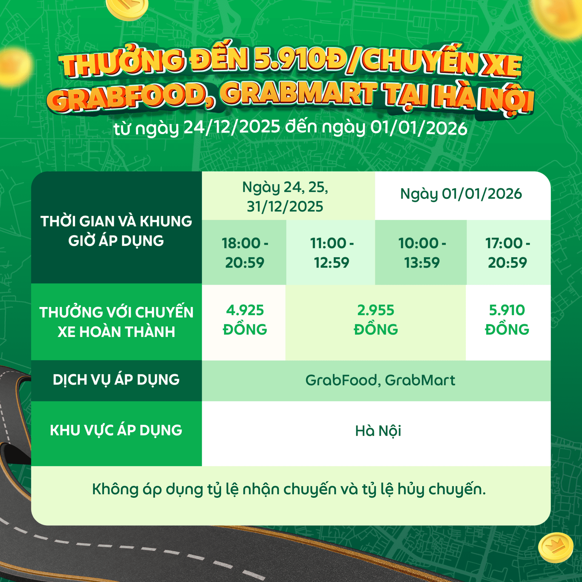 Tháng 12 về mang theo không khí se lạnh của Noel và sự rộn ràng của năm mới 2026. Để mỗi chuyến xe giao hàng của Đối tác thêm niềm vui, Grab gửi đến Đối tác chương trình thưởng đến 5.910đ/chuyến xe với chi tiết chương trình như sau: