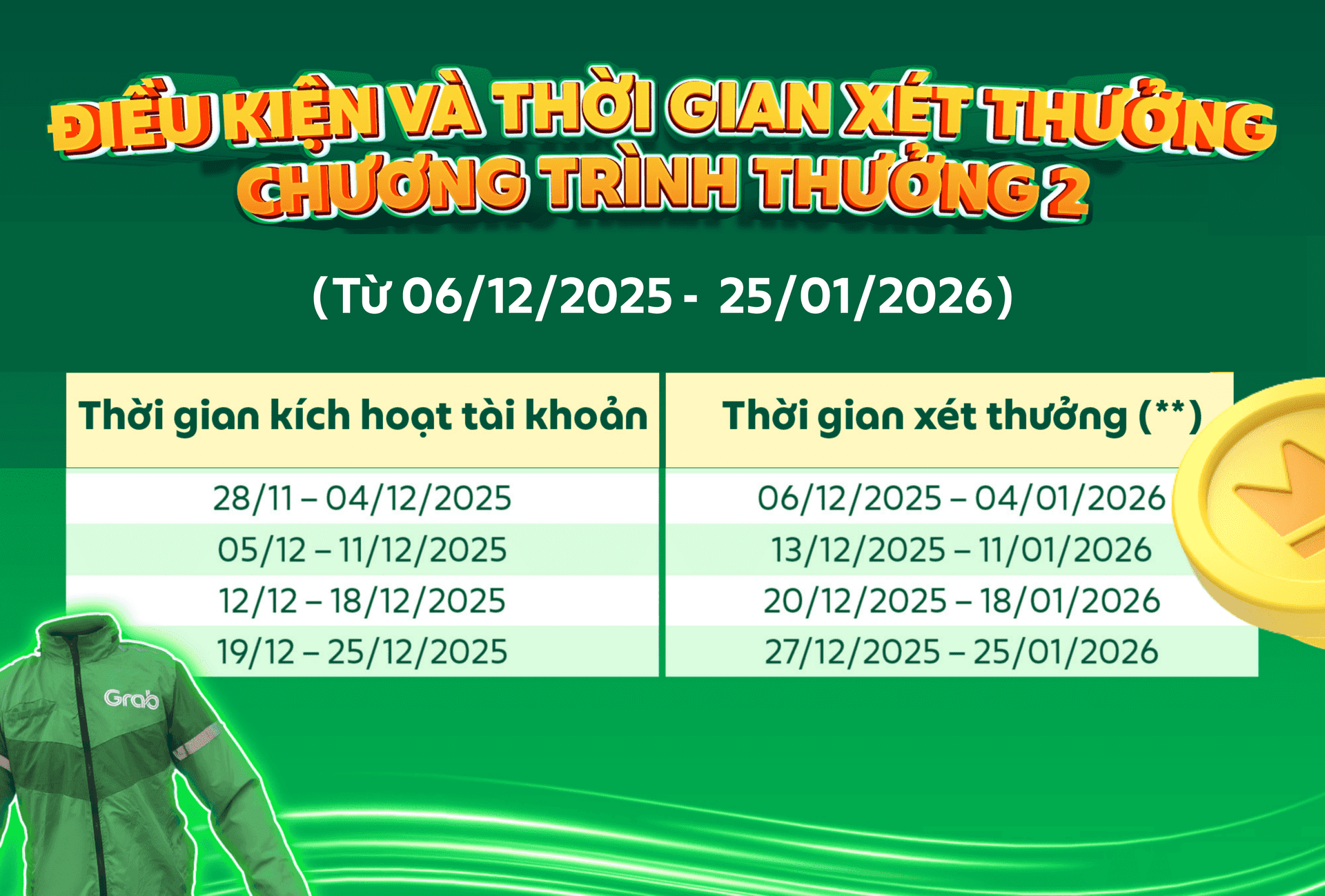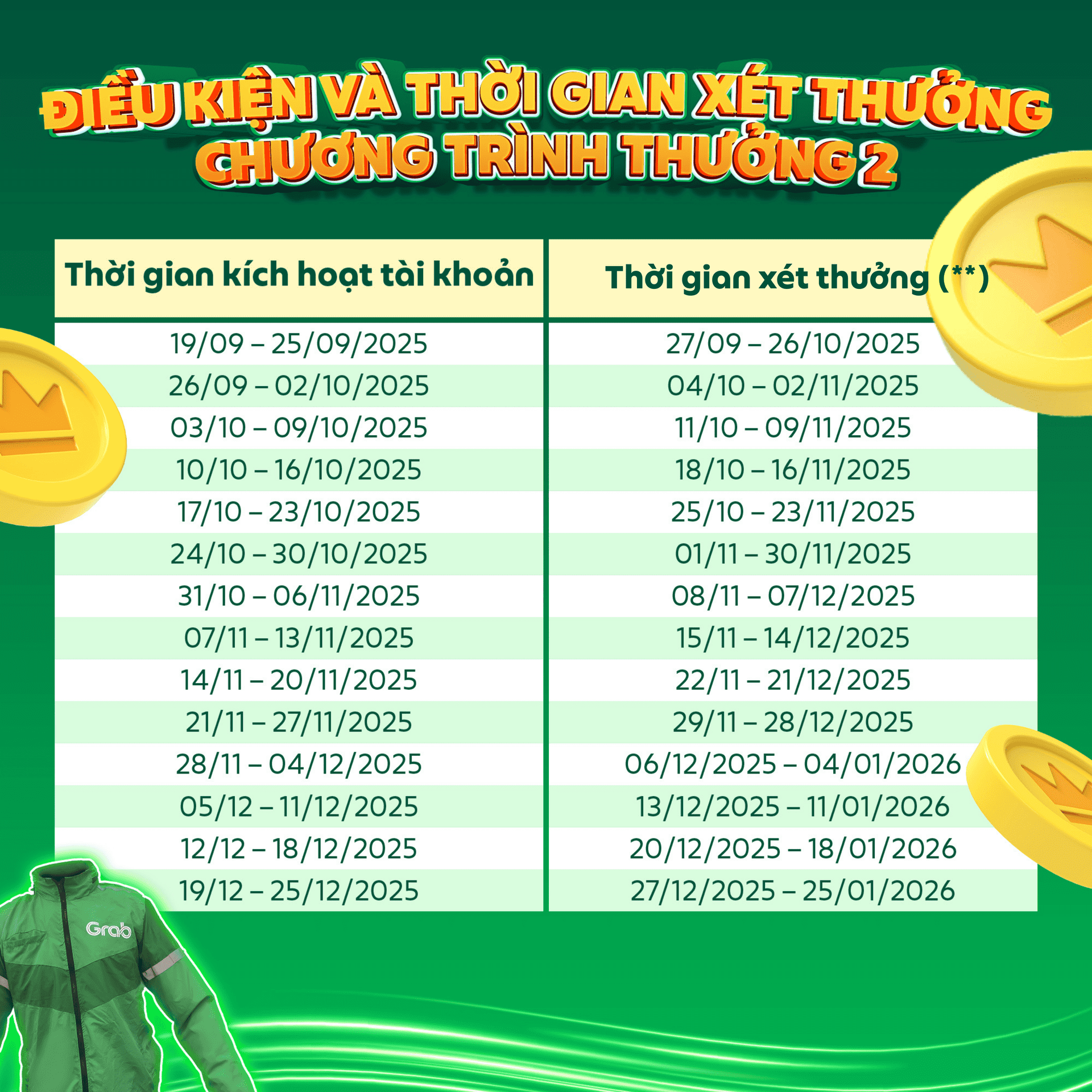Số chuyến xe mà Đối tác hoàn thành phải nằm trong thời gian xét thưởng và tài khoản Grab Driver của Đối tác phải được kích hoạt trong mốc thời gian tương ứng như quy định tại bảng “ĐIỀU KIỆN VÀ THỜI GIAN XÉT THƯỞNG” trên. Nếu Đối tác kích hoạt tài khoản, nhưng không thực hiện chuyến xe trong thời gian xét thưởng tương ứng, mà thực hiện chuyến xe ở giai đoạn xét thưởng khác thì kết quả sẽ được tính là KHÔNG HỢP LỆ.