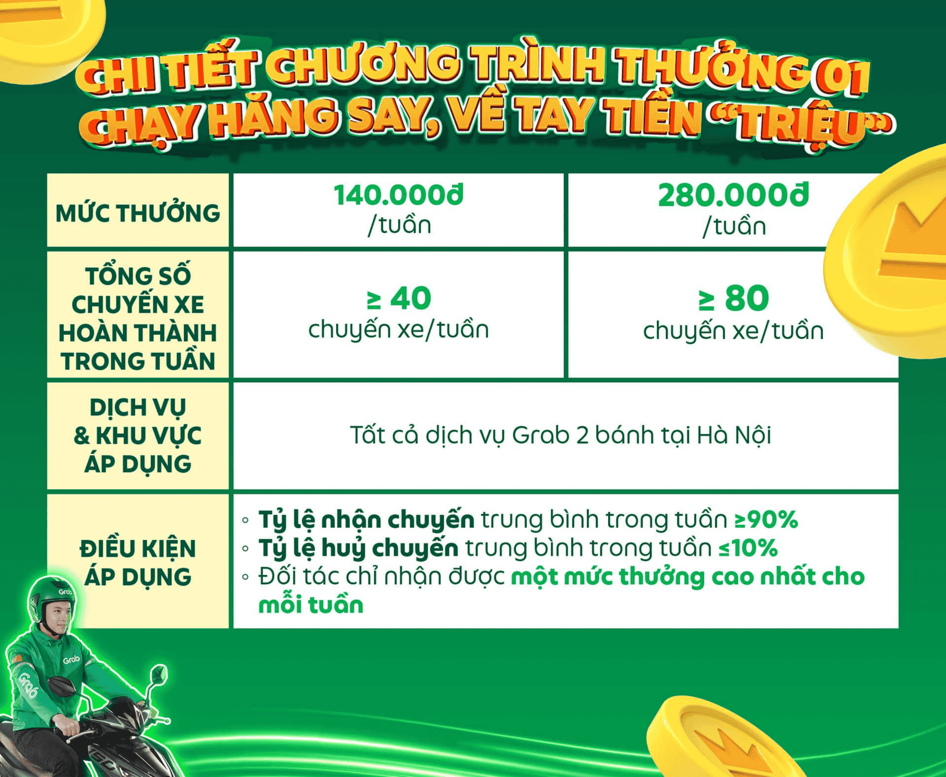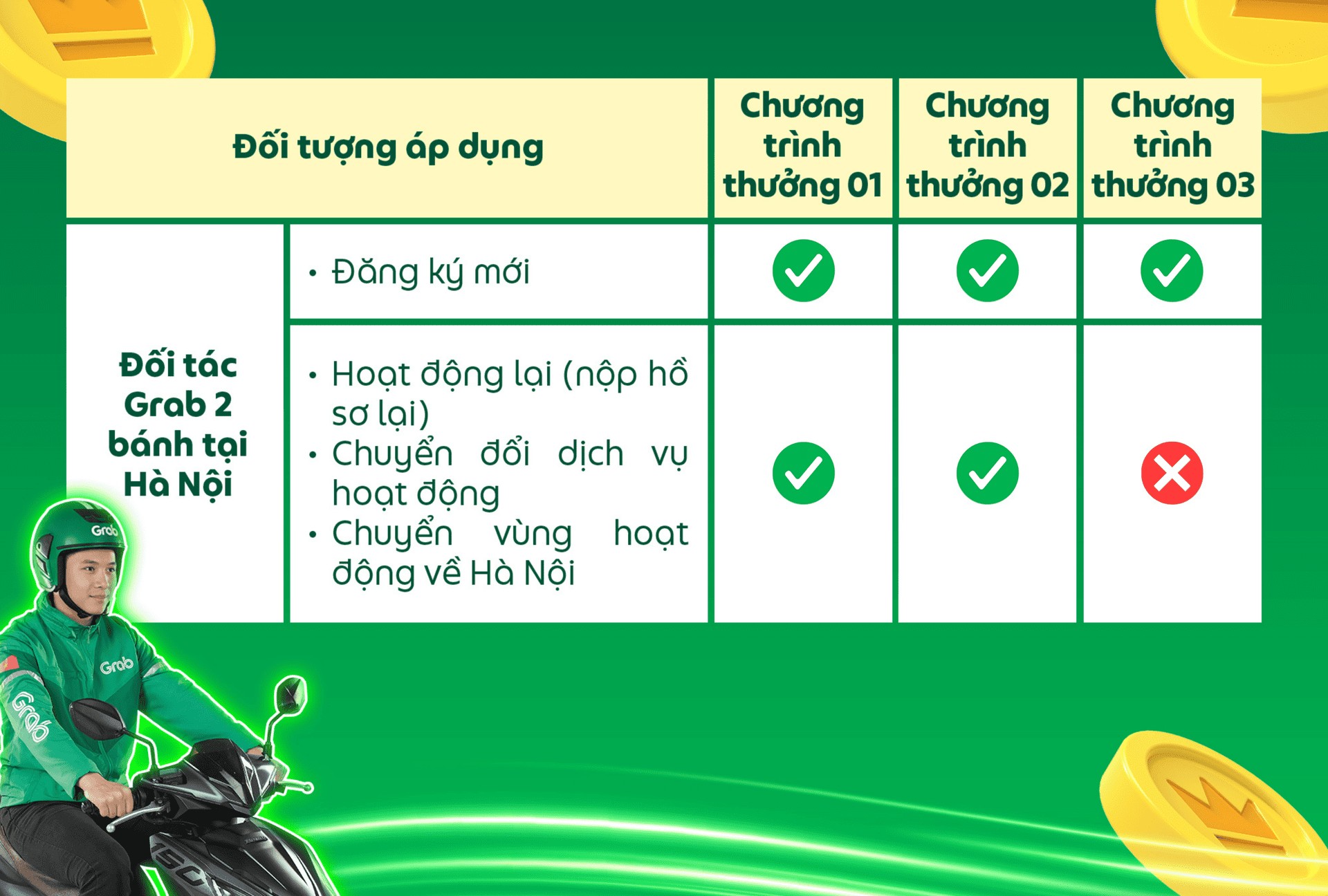 👋 Tiếp nối chuỗi chương trình “tiếp lửa” hoạt động, từ tháng 9/2025, Grab ra mắt thêm 03 chương trình thưởng dành riêng cho Đối tác Grab 2 bánh tại Hà Nội, bao gồm đối tượng áp dụng như sau:
