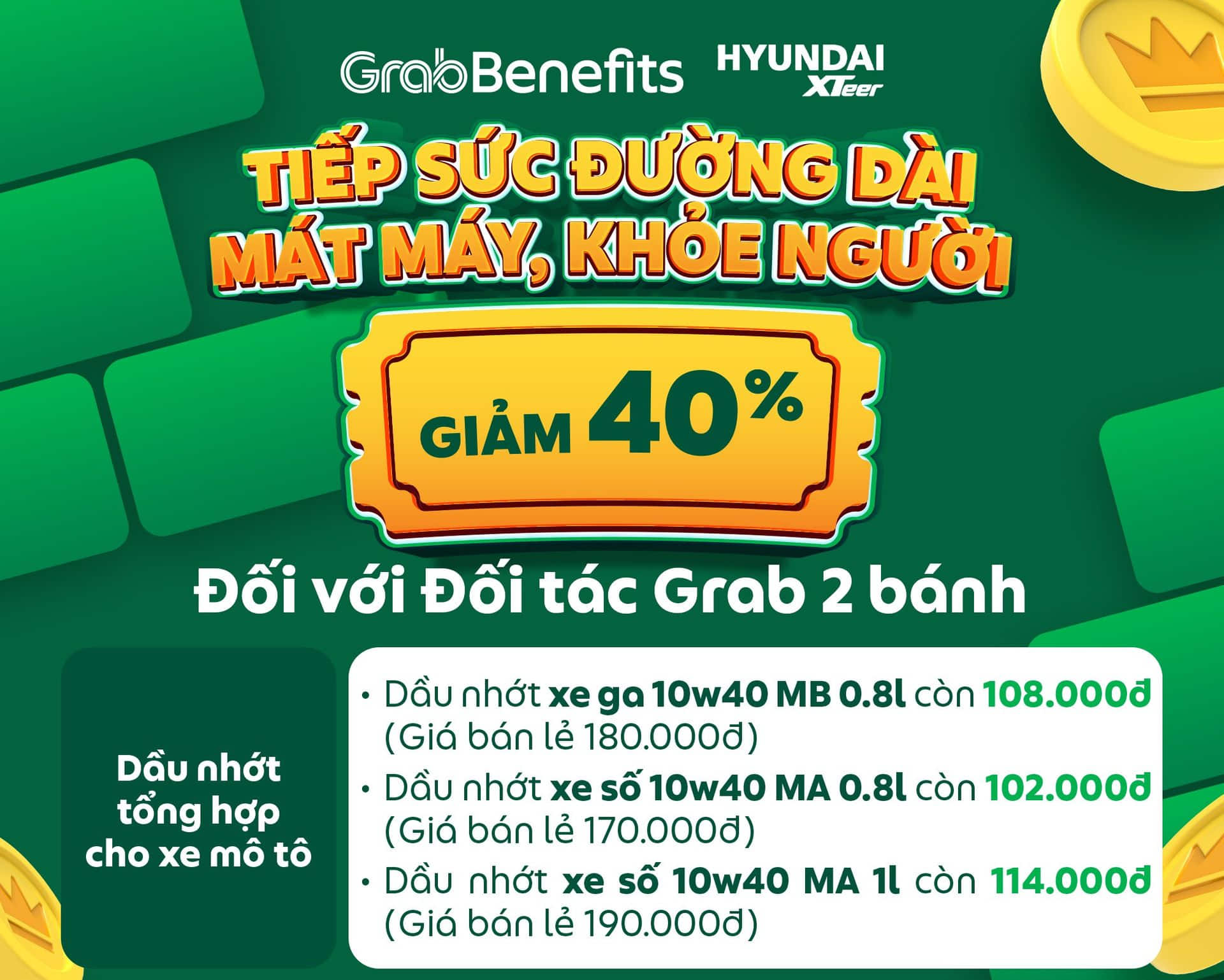 Nhằm hỗ trợ Đối tác tiết kiệm chi phí bảo trì xe, GrabBenefits cùng Hyundai Xteer triển khai chương trình ưu đãi đặc biệt nhiều dòng dầu nhớt chuyên dụng. Tham khảo thông tin chi tiết ngay bên dưới 👇