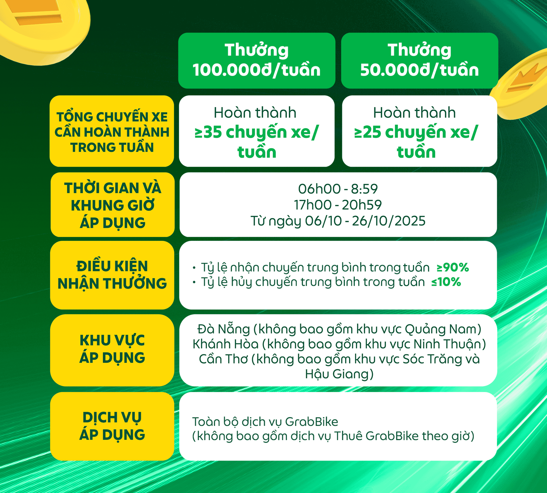 Grab triển khai chương trình thưởng khi hoàn thành chuyến xe GrabBike (chương trình), chi tiết như sau: