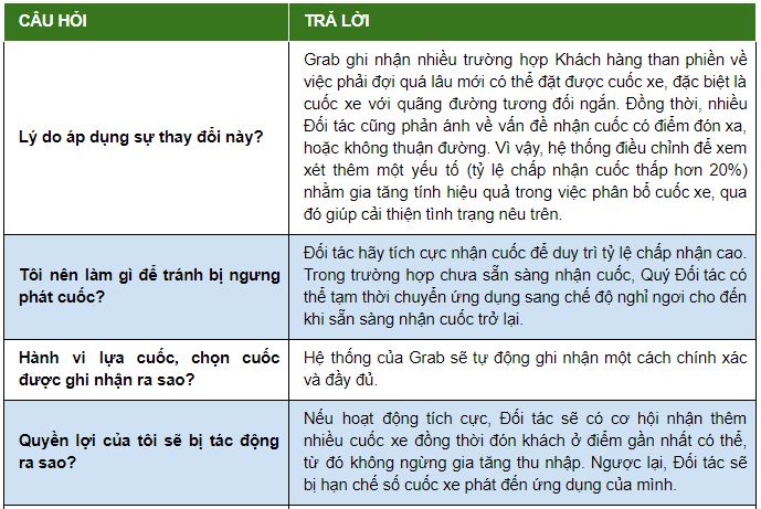 Grab nhận thấy tình trạng lựa chọn cuốc xe bởi một bộ phận nhỏ Đối tác có tỷ lệ nhận cuốc thấp đã làm ảnh hưởng lớn đến sự vận hành hiệu quả của cả hệ thống, gây ảnh hưởng trực tiếp đến quyền lợi chung của đông đảo Đối tác cũng như trải nghiệm của Khách hàng. Vì vậy, với nỗ lực nhằm nâng cao chất lượng dịch vụ, đảm bảo môi trường làm việc công bằng đồng thời tối ưu hóa hiệu quả hoạt động của các Đối tác, từ ngày 16/04/2018, hệ thống Grab sẽ hạn chế phát cuốc xe đến các Đối tác có tỷ nhận cuốc trong tuần quá thấp (chi tiết cụ thể vui lòng tham khảo thông tin dưới đây).