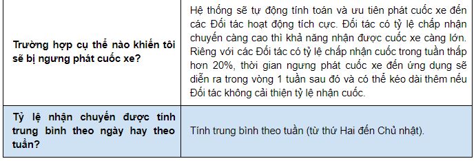 - Với các Đối tác có tỷ lệ nhận cuốc trong tuần thấp hơn 20%, hệ thống sẽ tự động ngưng phát cuốc xe trong vòng 07 ngày sau đó. Trong trường hợp tỷ lệ nhận cuốc tiếp tục không có sự cải thiện, thời gian mà hệ thống ngưng phát cuốc xe đến ứng dụng của Đối tác sẽ tăng dần lên trong các tuần tiếp theo và có thể là vô thời hạn.