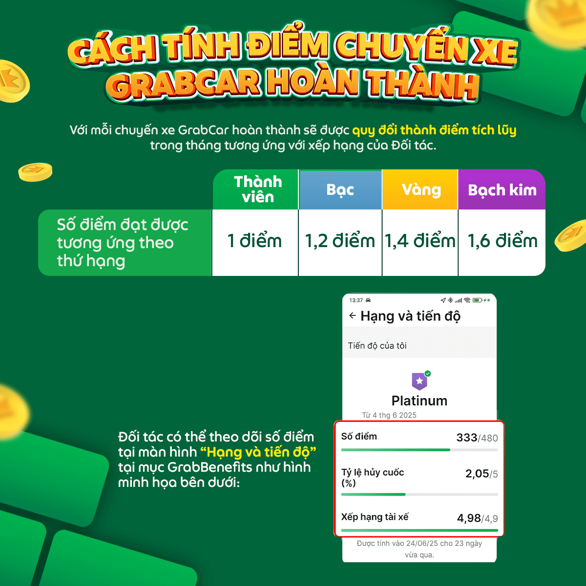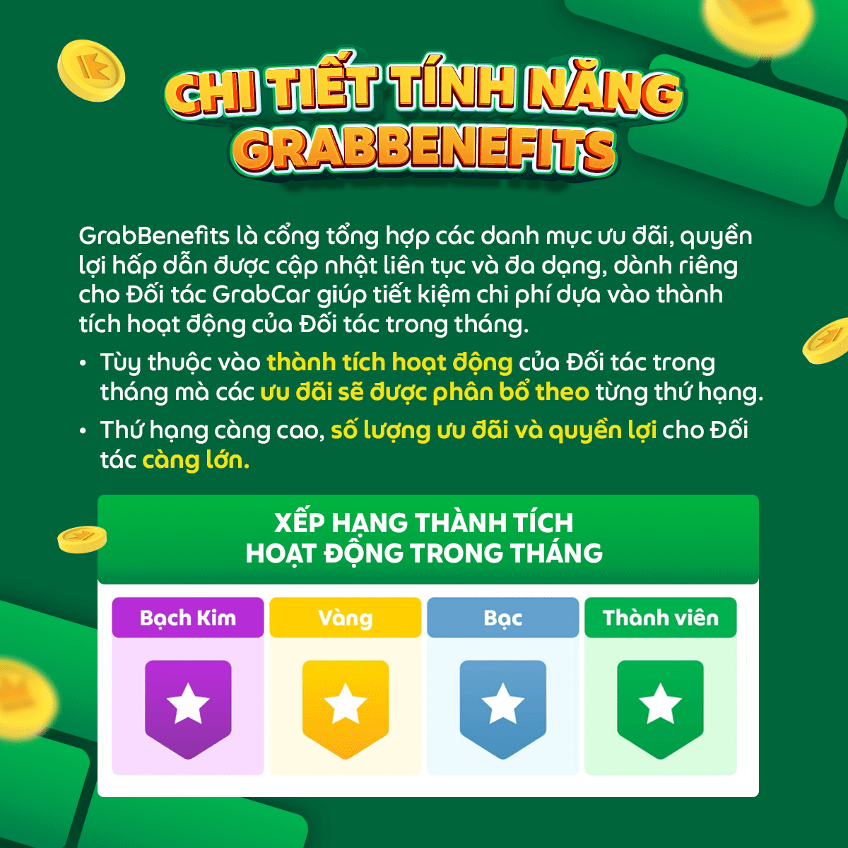 Trong thời gian tới, GrabBenefits sẽ không ngừng cập nhật thêm những ưu đãi hấp dẫn và thiết thực để có thể giúp Đối tác giảm tải chi phí và hoạt động hiệu quả. Hãy cùng cố gắng nâng cao thành tích hoạt động và xếp hạng để vừa có thể nhận các mức thưởng trên doanh thu hấp dẫn, vừa có thể tận hưởng những ưu đãi độc quyền dành cho Đối tác Grab của GrabBenefits nhé!