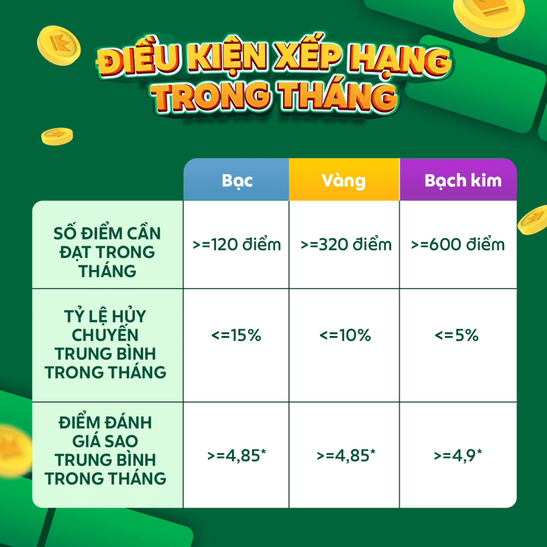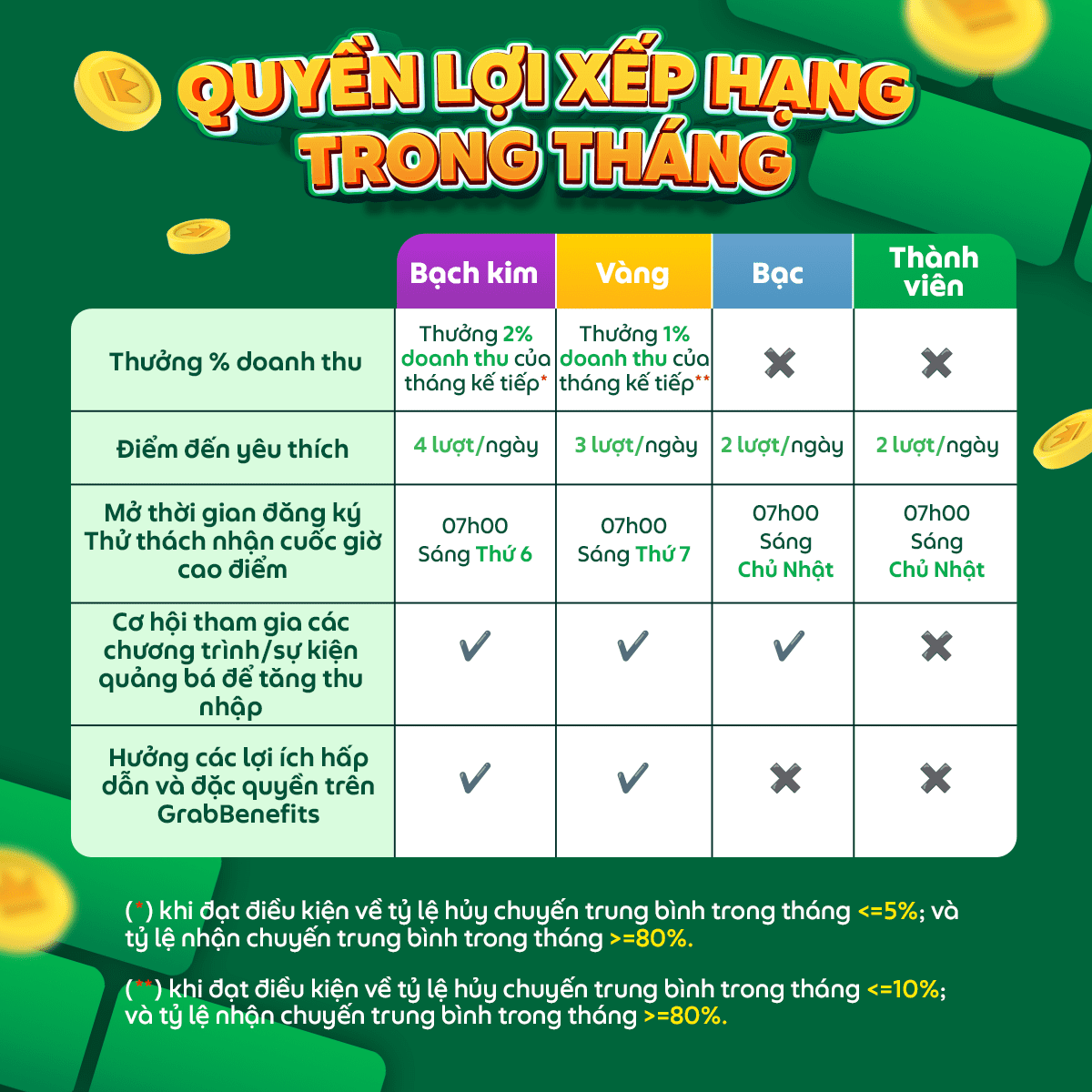 Các quyền lợi, ưu đãi theo từng thứ hạng là không cố định và sẽ được tự động cập nhật theo từng tháng.