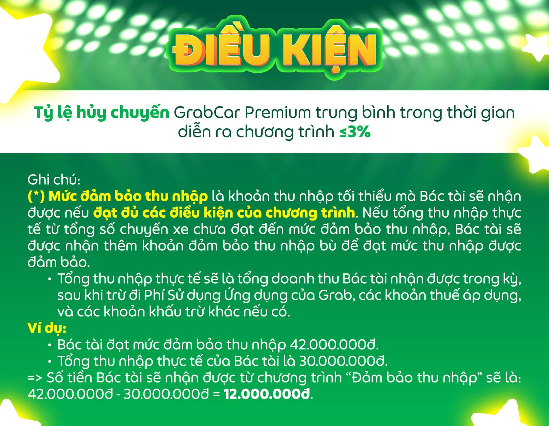 💰 Mức đảm bảo thu nhập sẽ được tính dựa trên tổng số chuyến xe GrabCar Premium mà Đối tác hoàn thành trong thời gian chương trình diễn ra.