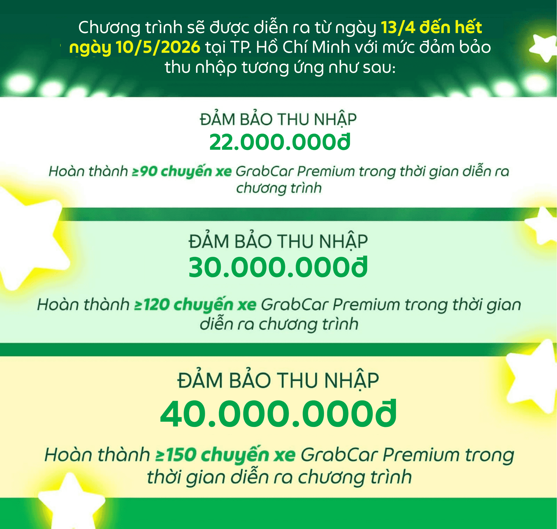 Với các Đối tác đăng ký chương trình Bác tài siêu sao, thu nhập đảm bảo tháng 4/2026, SẼ KHÔNG ĐƯỢC ÁP DỤNG ĐỒNG THỜI với các chương trình thưởng khác của GrabCar Premium đang được triển khai từ ngày 13/4 đến hết ngày 10/5/2026.