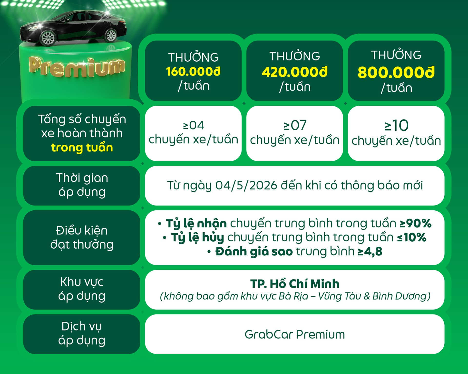GrabCar | Thưởng lên đến 800.000đ mỗi tuần khi hoàn thành chuyến xe GrabCar Premium