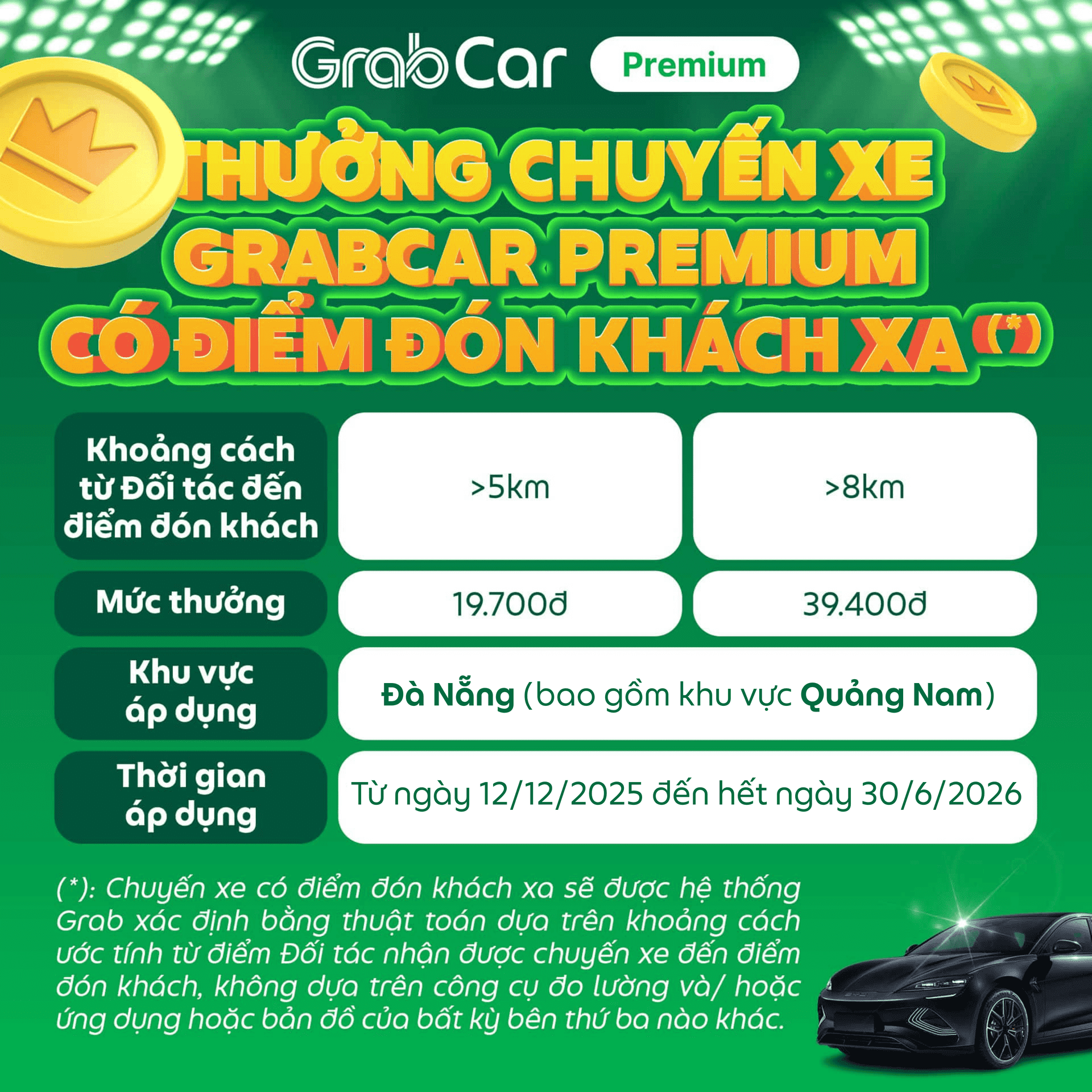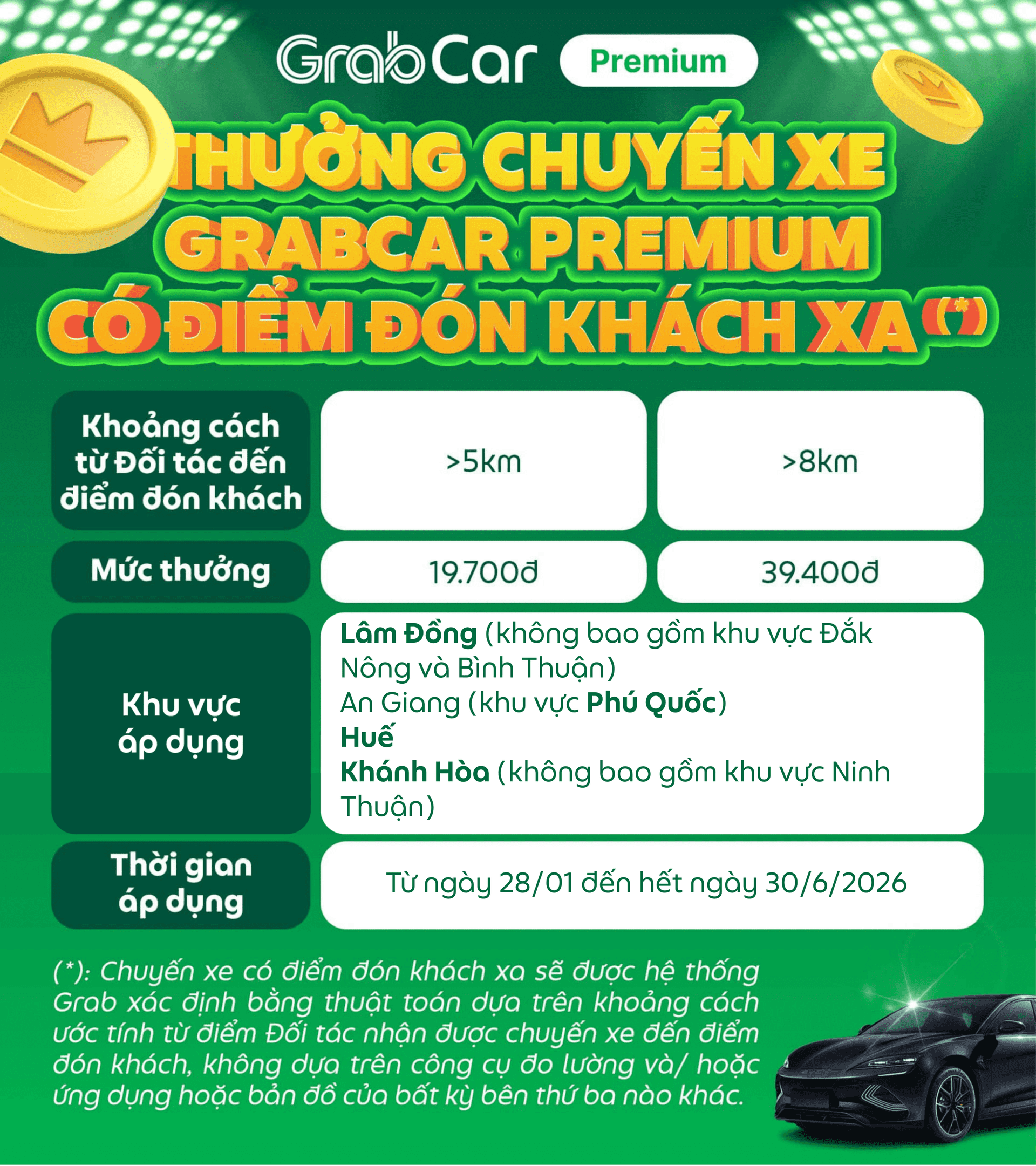 GrabCar Premium ra mắt chương trình thưởng đón khách xa, giúp Đối tác yên tâm trên mọi hành trình. Đây là sự khích lệ dành riêng cho Đối tác GrabCar khi thực hiện và hoàn thành các chuyến xe GrabCar Premium.