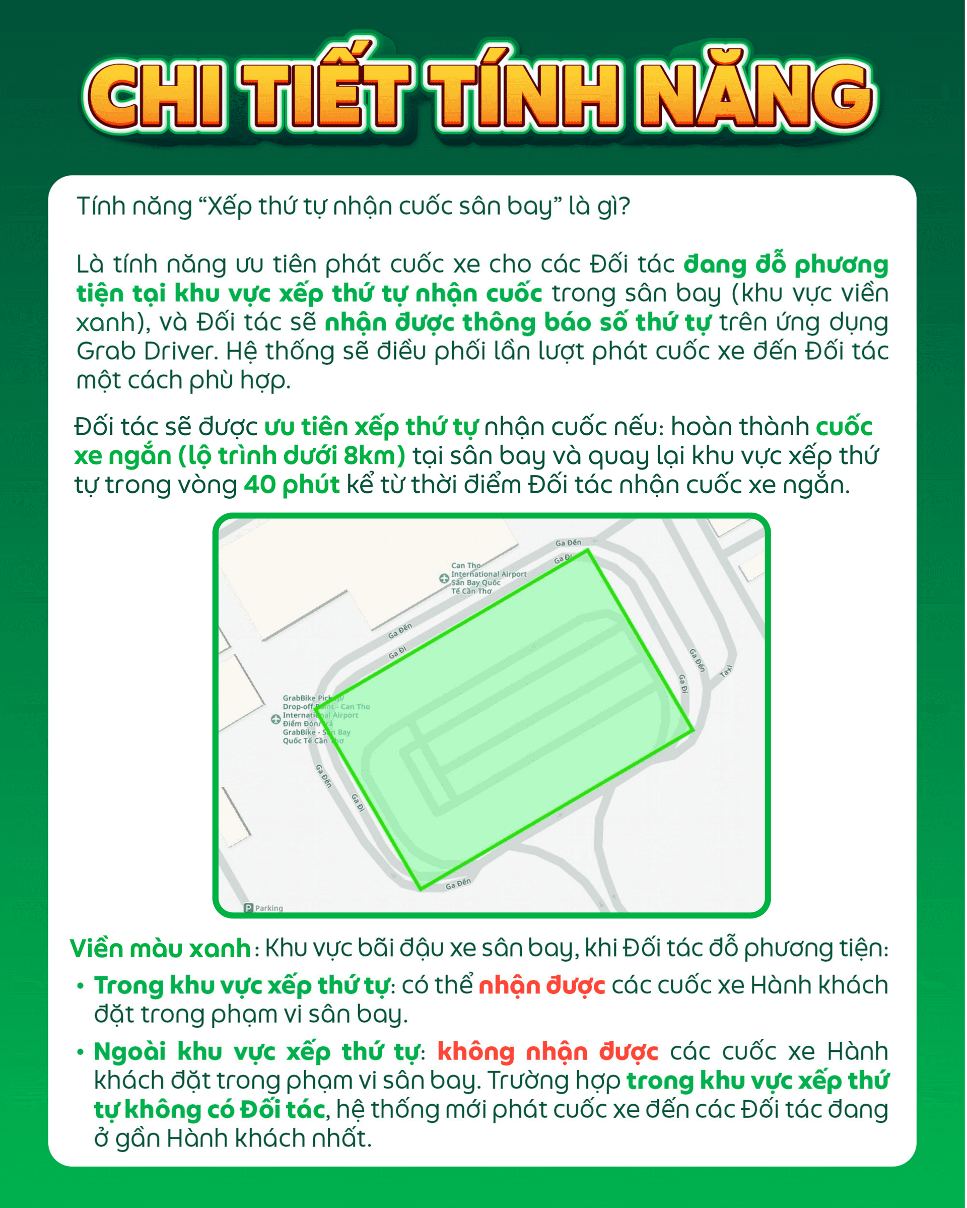 Nhằm giúp hoạt động của Đối tác tại khu vực sân bay trở nên dễ dàng và thuận lợi hơn, từ ngày 08/01/2026, Grab triển khai tính năng “Xếp thứ tự nhận cuốc sân bay” tại Sân bay quốc tế Cần Thơ cụ thể như sau: