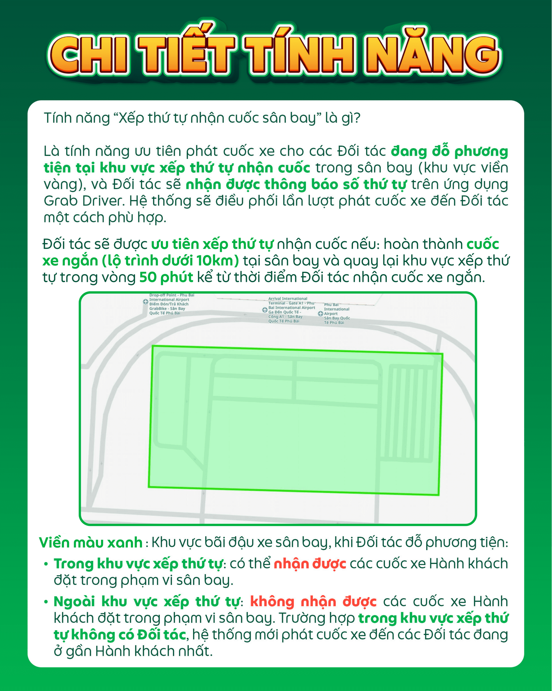 Nhằm giúp hoạt động của Đối tác tại khu vực sân bay trở nên dễ dàng và thuận lợi hơn, từ ngày 08/01/2026, Grab triển khai tính năng “Xếp thứ tự nhận cuốc sân bay” tại Sân bay quốc tế Phú Bài cụ thể như sau: