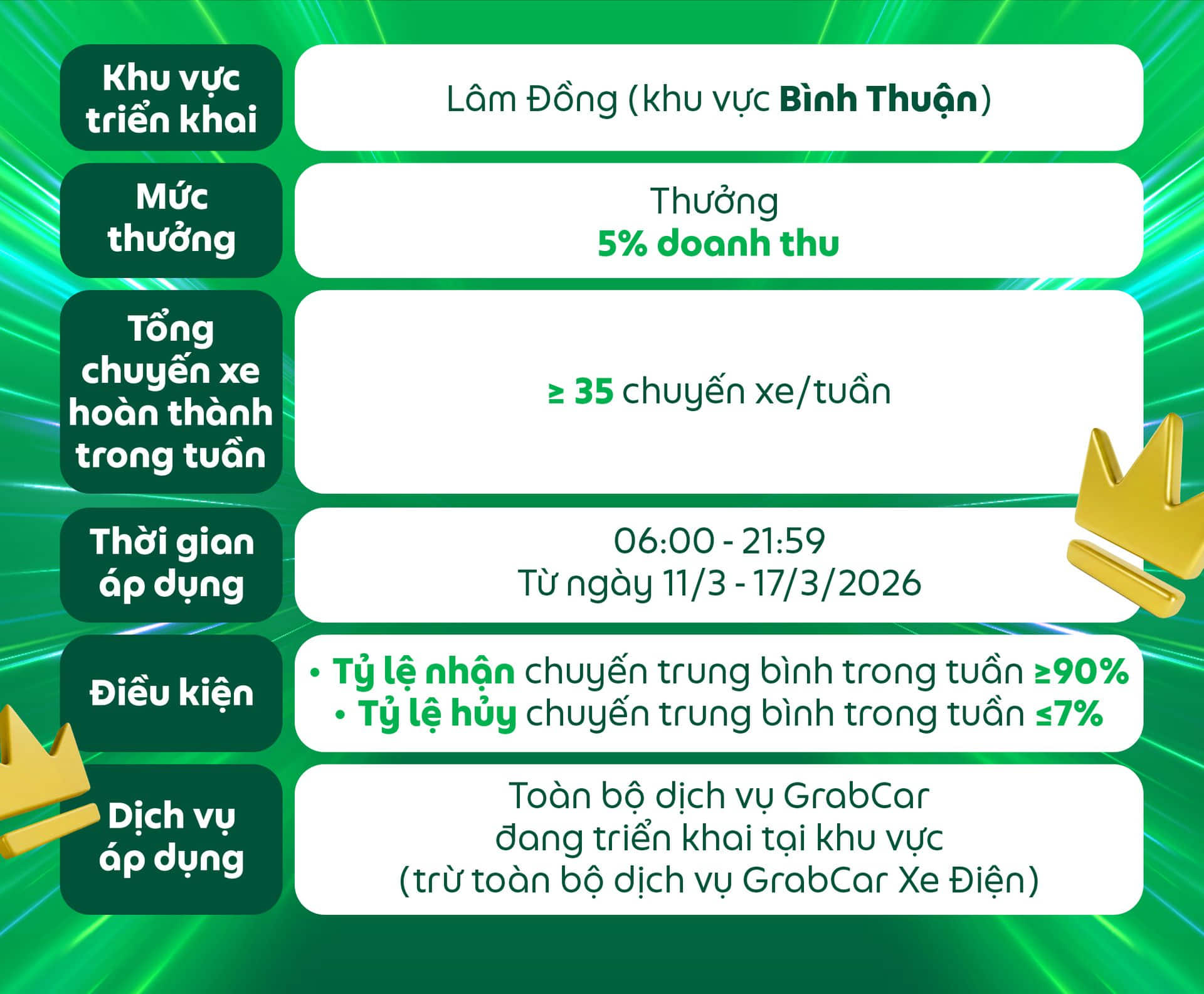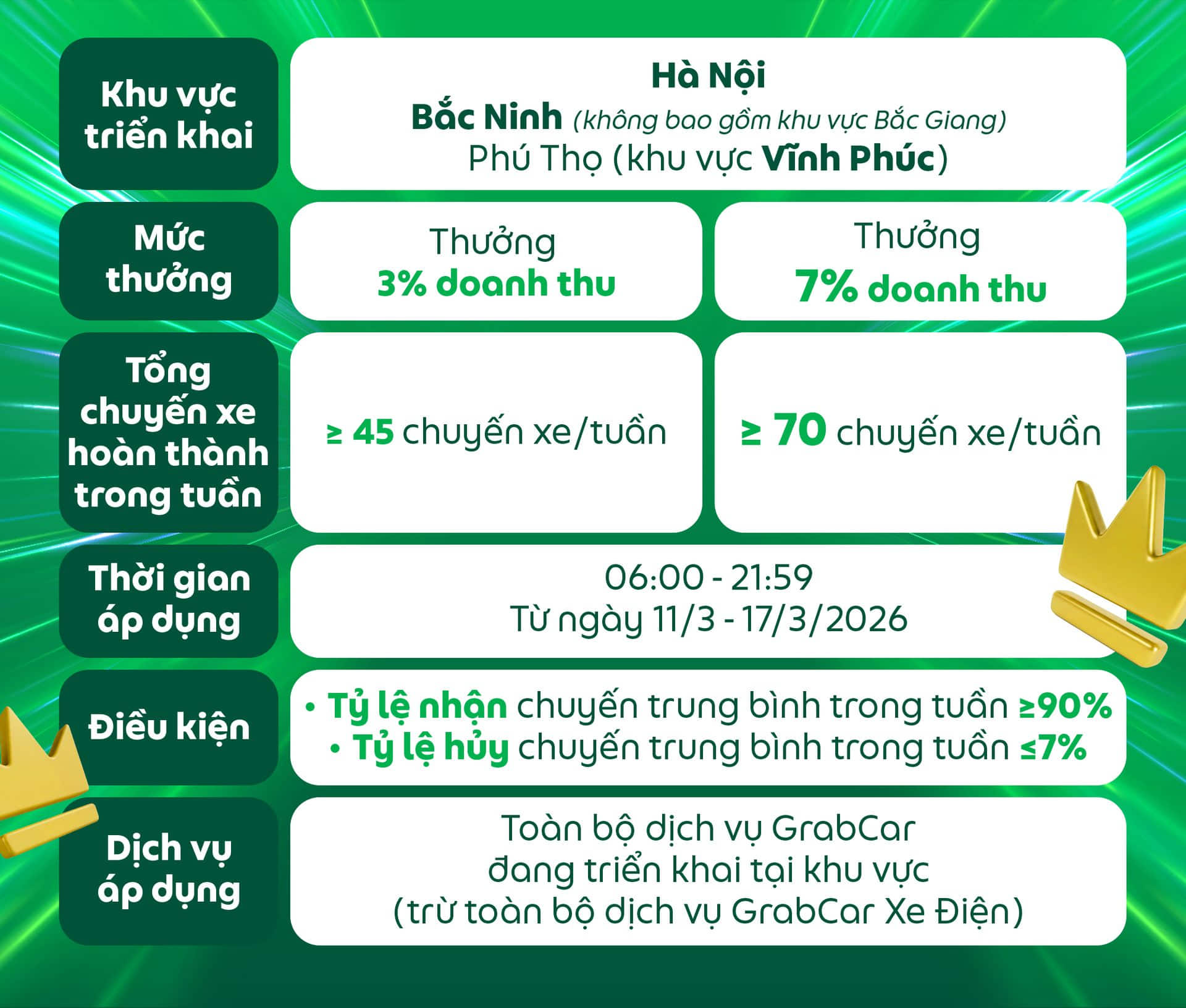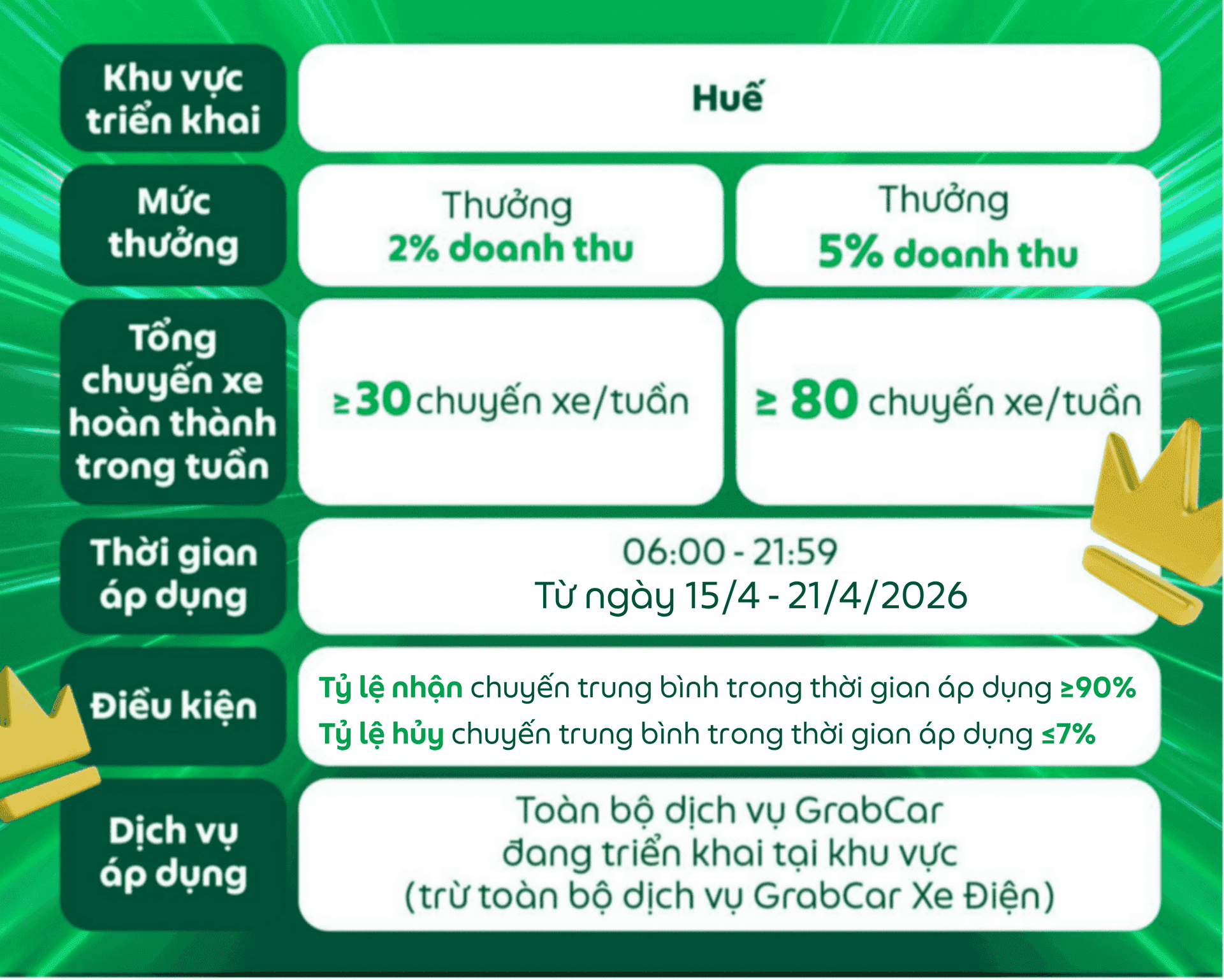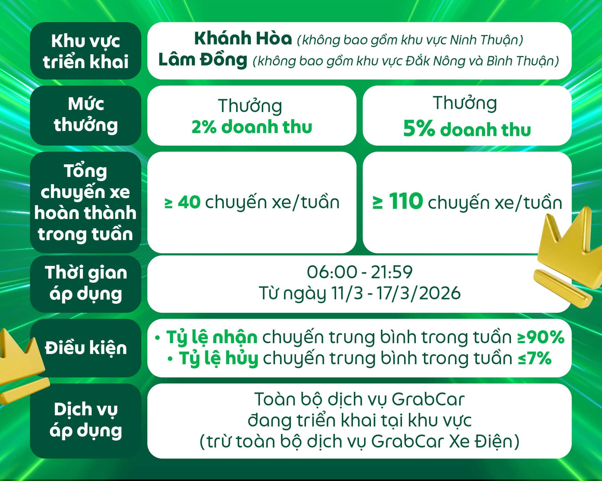 Đối tượng áp dụng: Dành cho các Đối tác GrabCar đang sử dụng phương tiện chạy bằng nhiên liệu xăng hoặc dầu nhận được thông báo này trên ứng dụng Grab Driver.
