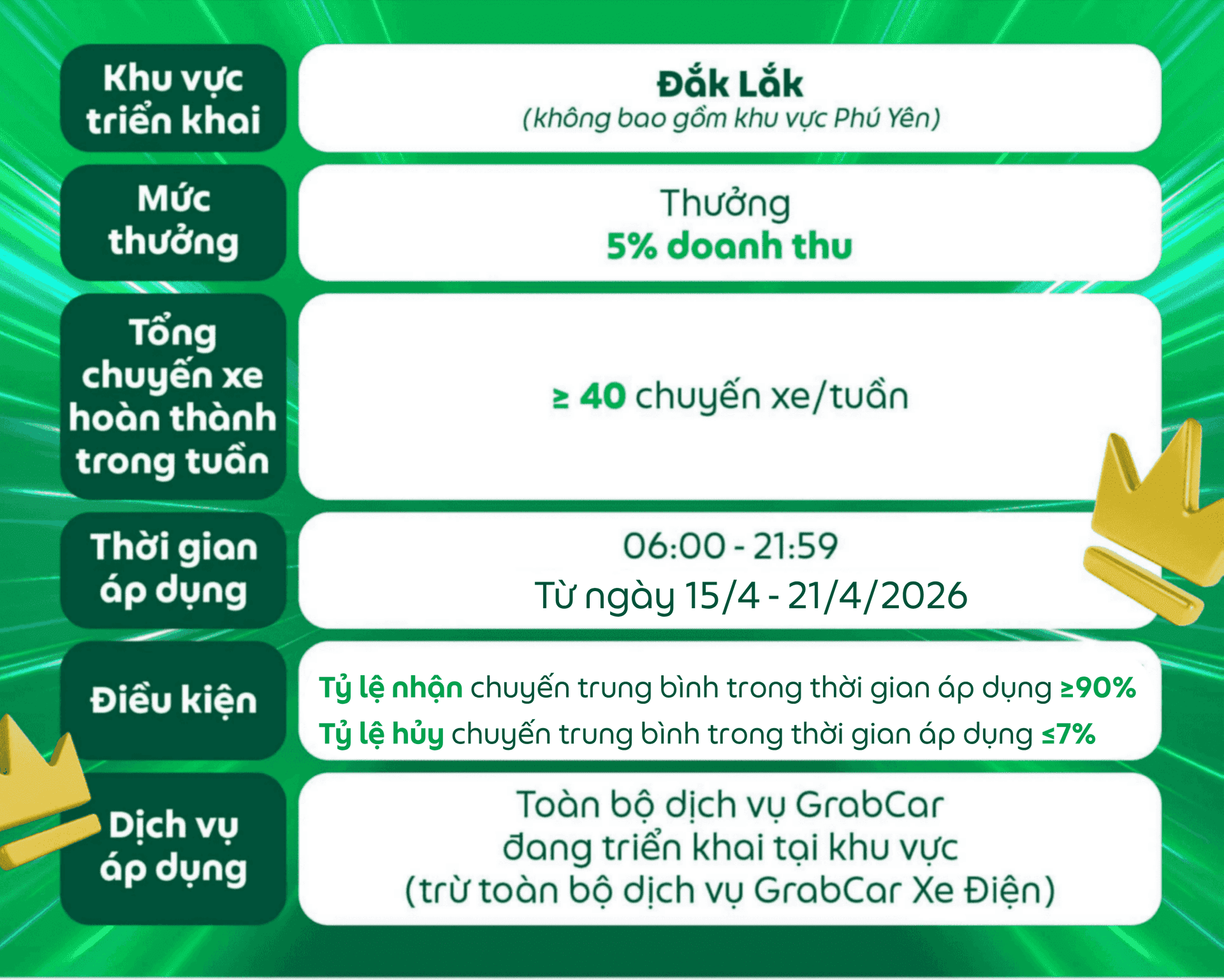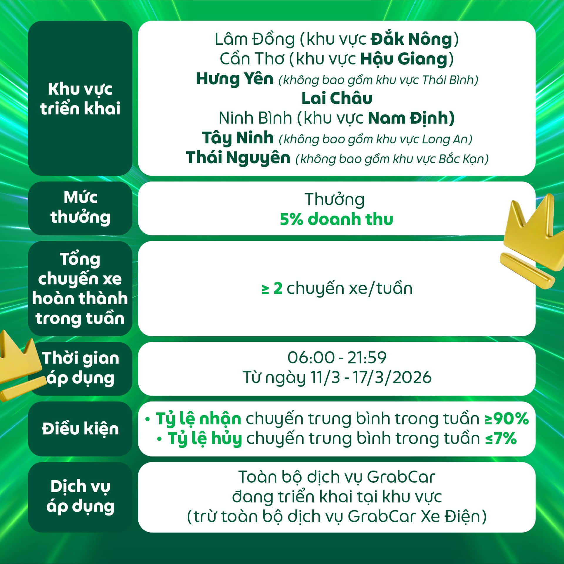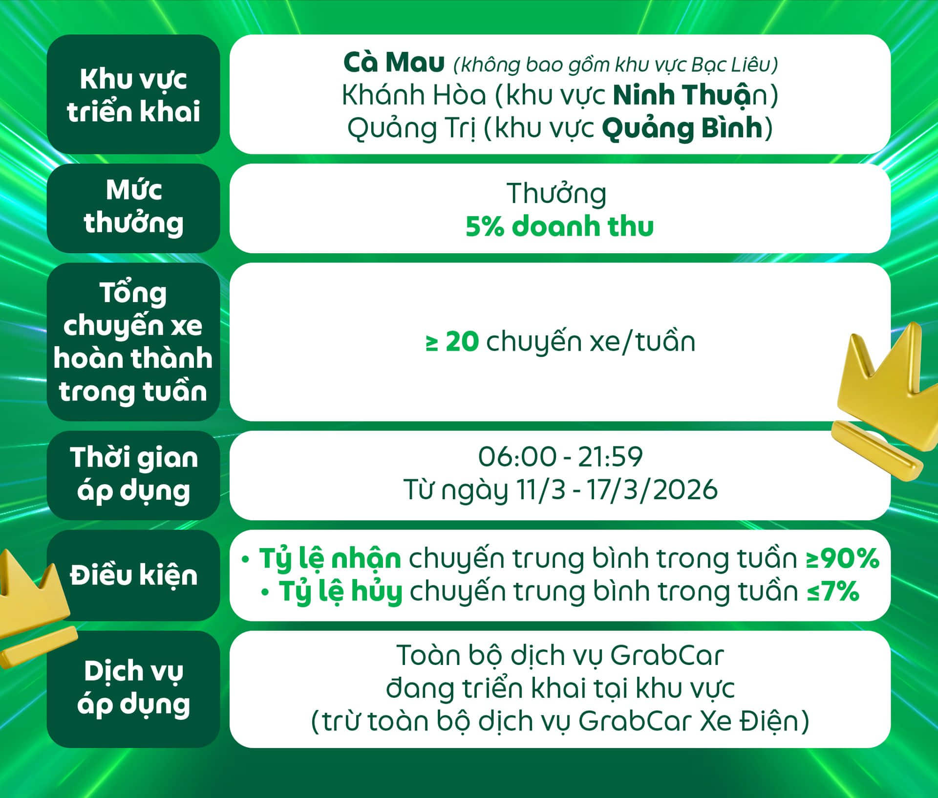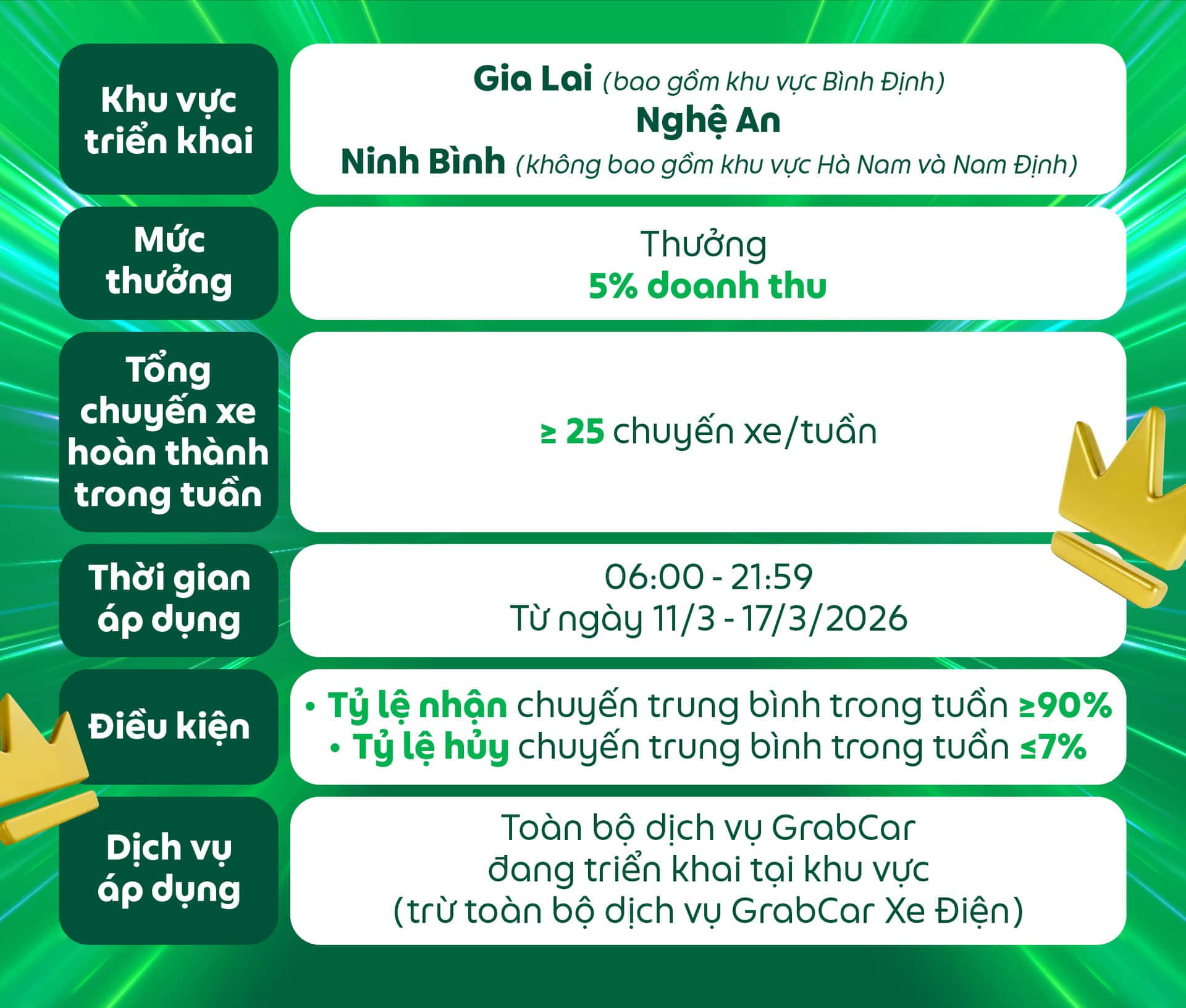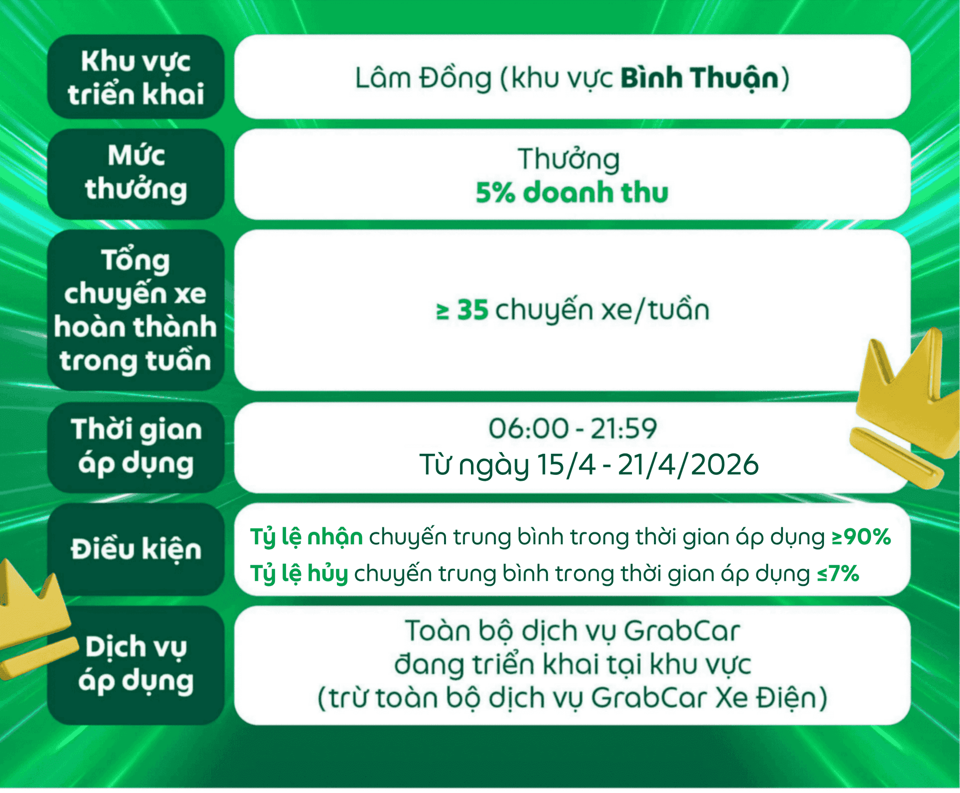 Đối tượng áp dụng: Dành cho các Đối tác GrabCar đang sử dụng phương tiện chạy bằng nhiên liệu xăng hoặc dầu nhận được thông báo này trên ứng dụng Grab Driver.