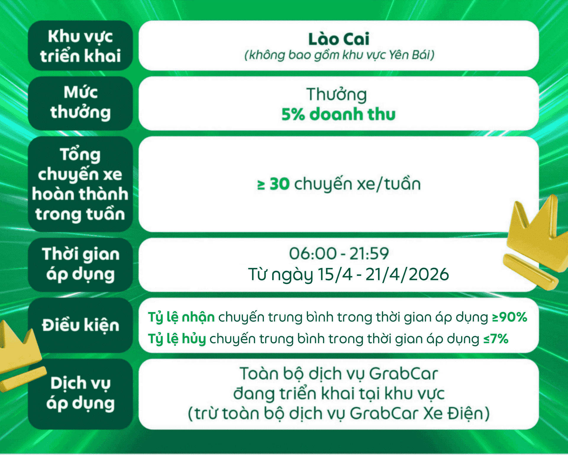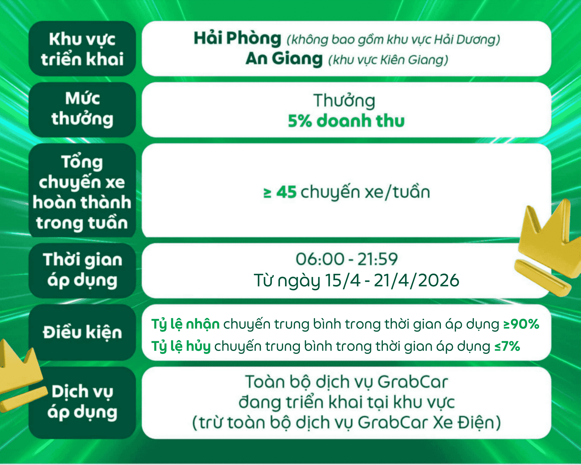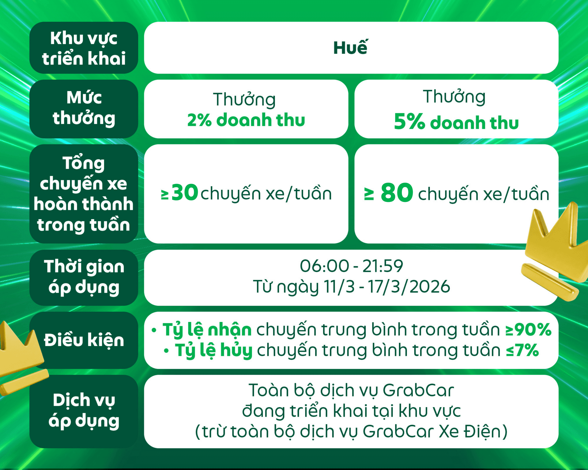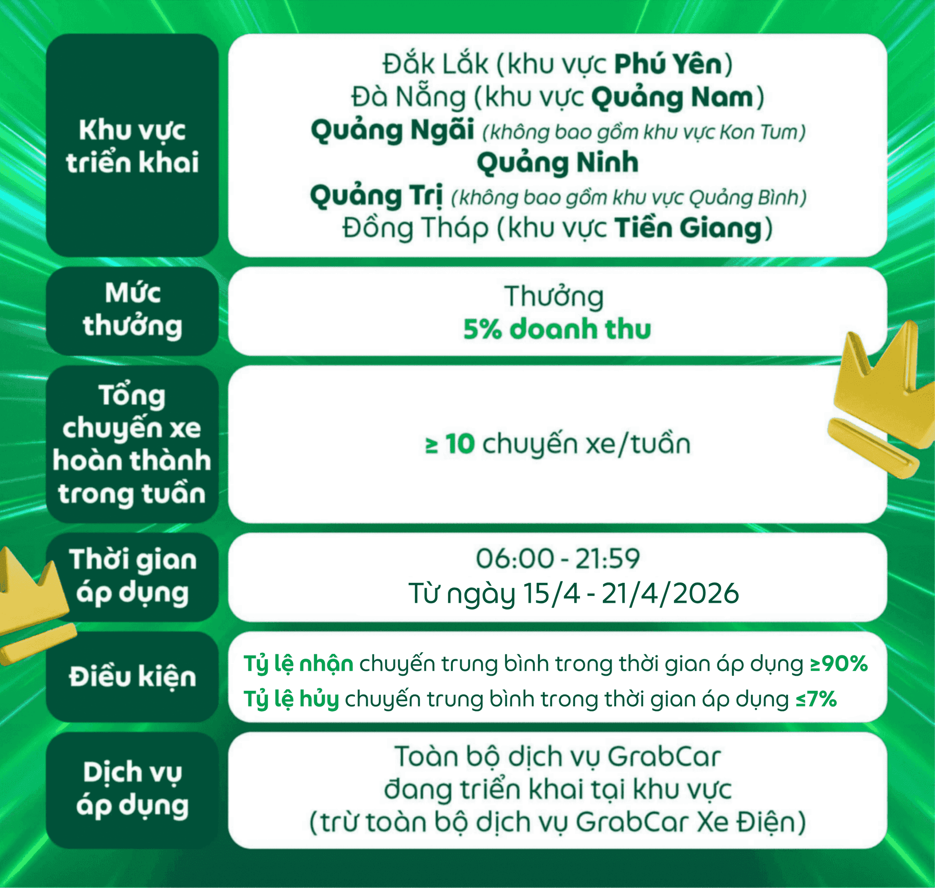Đối tượng áp dụng: Dành cho các Đối tác GrabCar đang sử dụng phương tiện chạy bằng nhiên liệu xăng hoặc dầu nhận được thông báo này trên ứng dụng Grab Driver.
