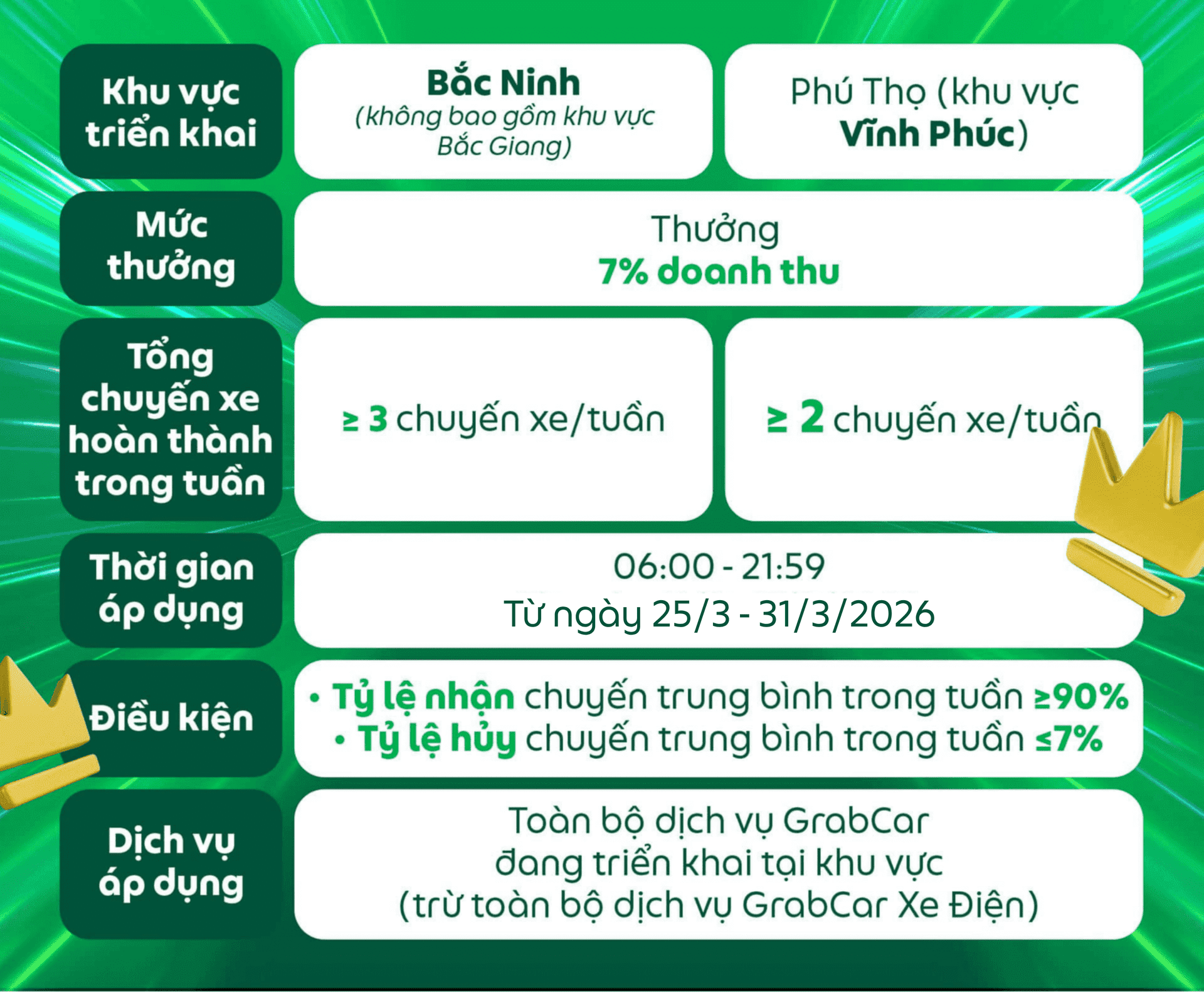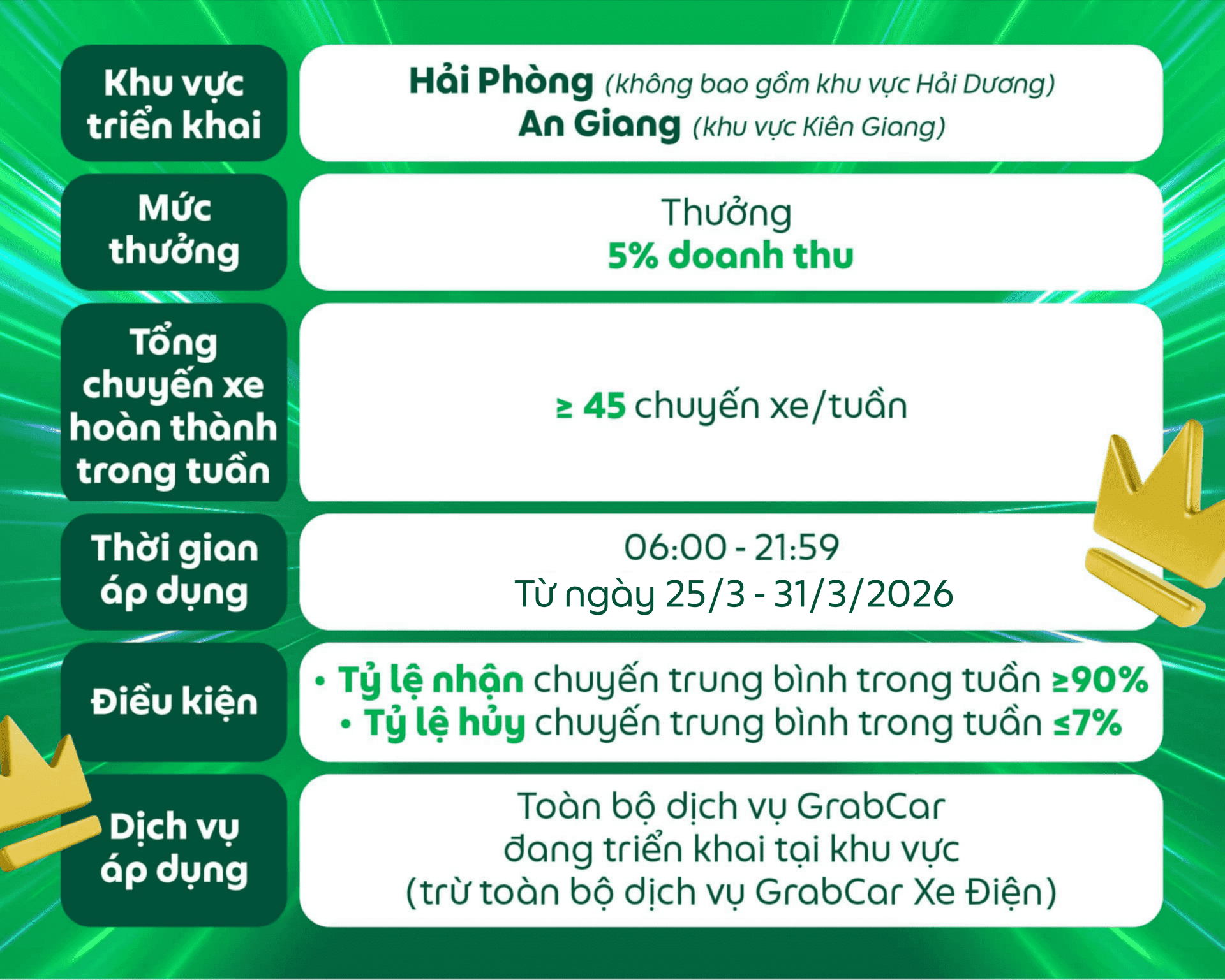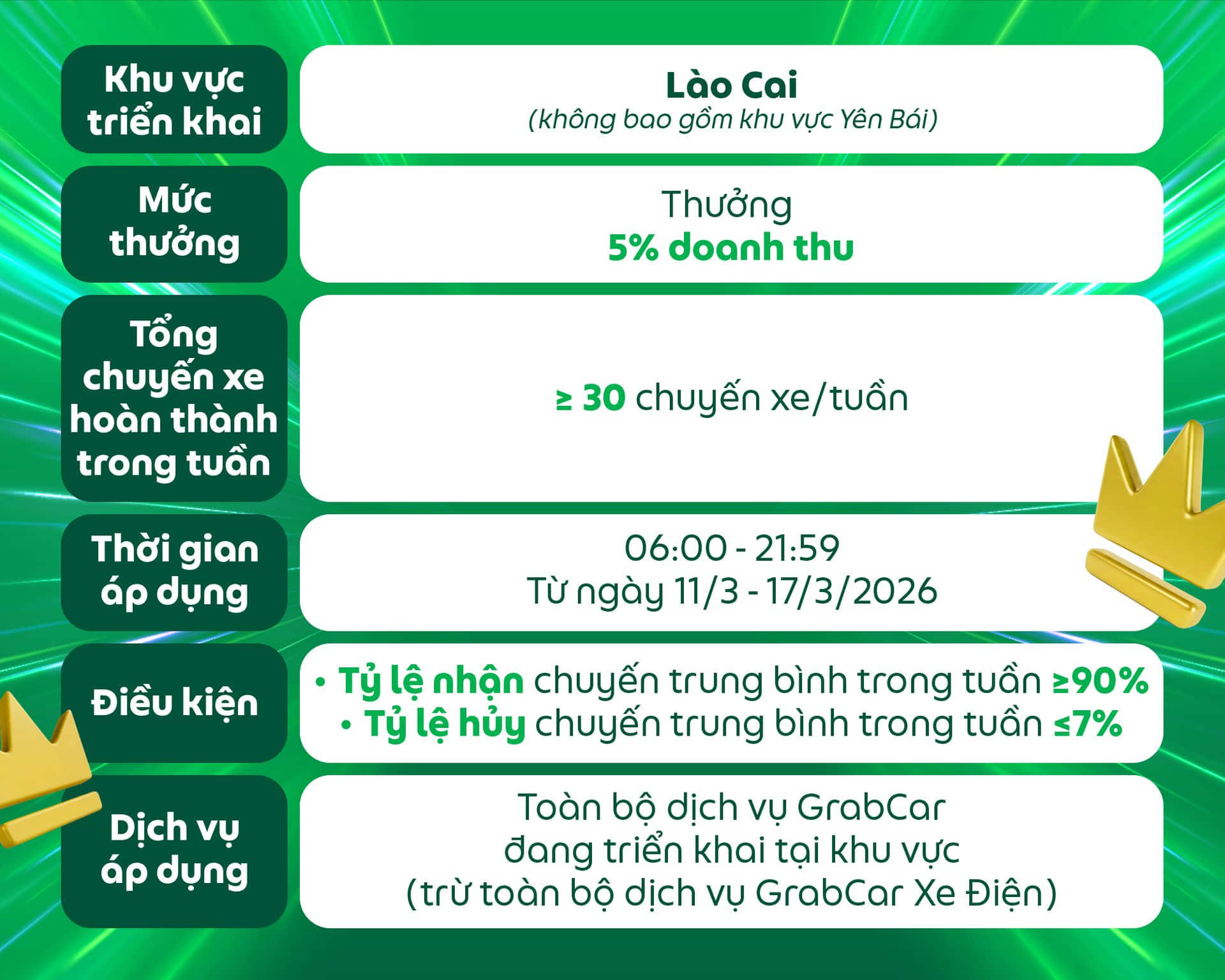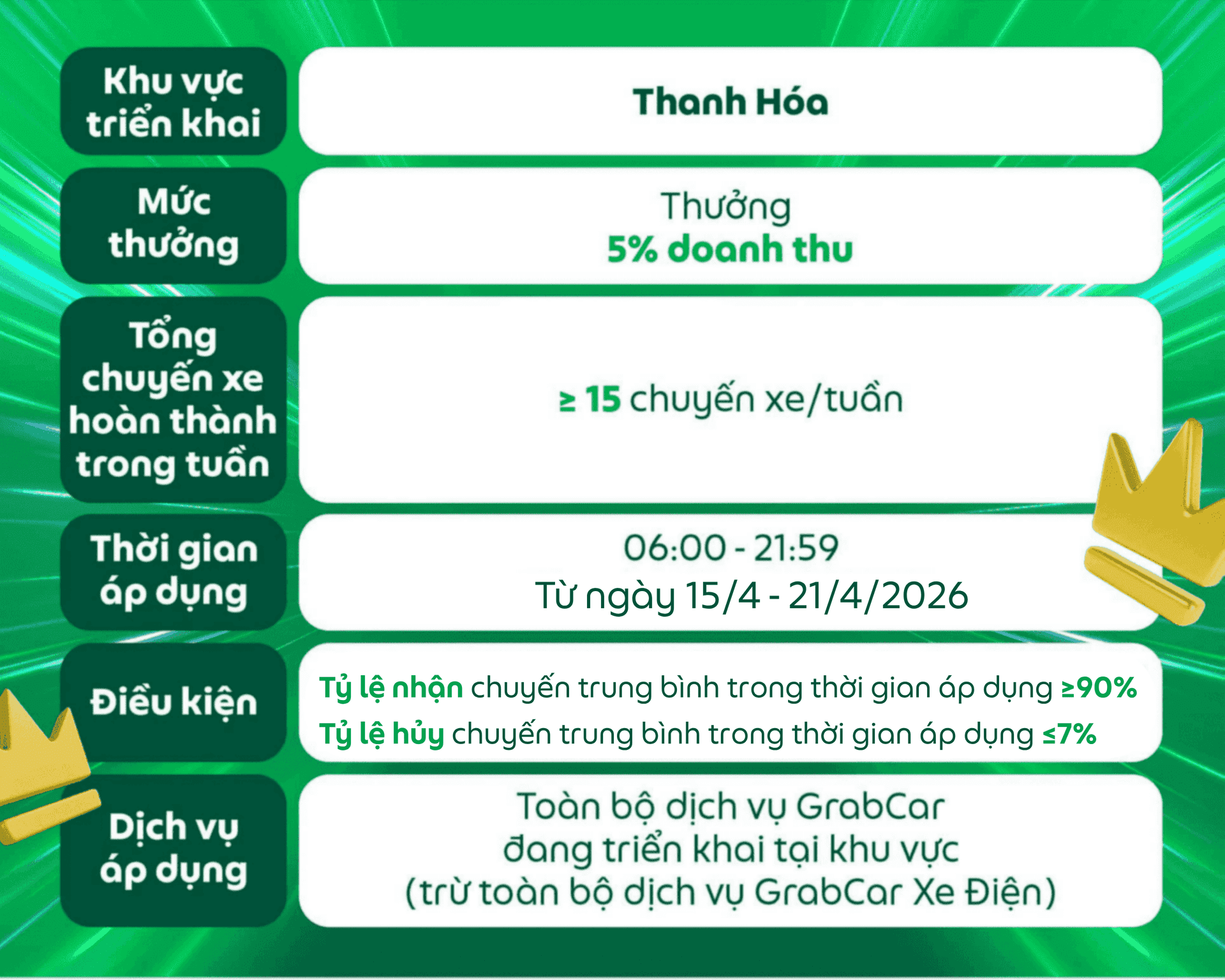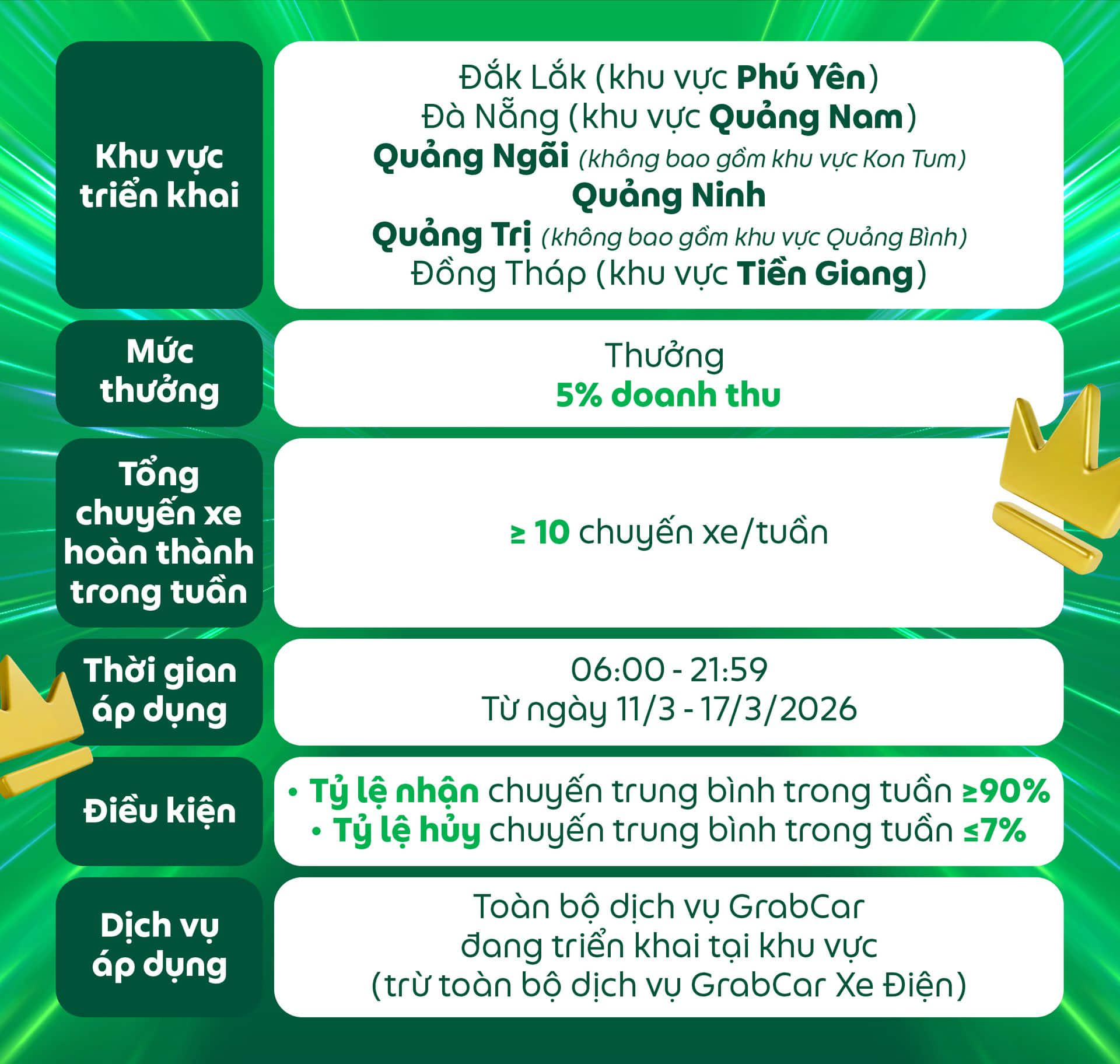 Đối tượng áp dụng: Dành cho các Đối tác GrabCar đang sử dụng phương tiện chạy bằng nhiên liệu xăng hoặc dầu nhận được thông báo này trên ứng dụng Grab Driver.