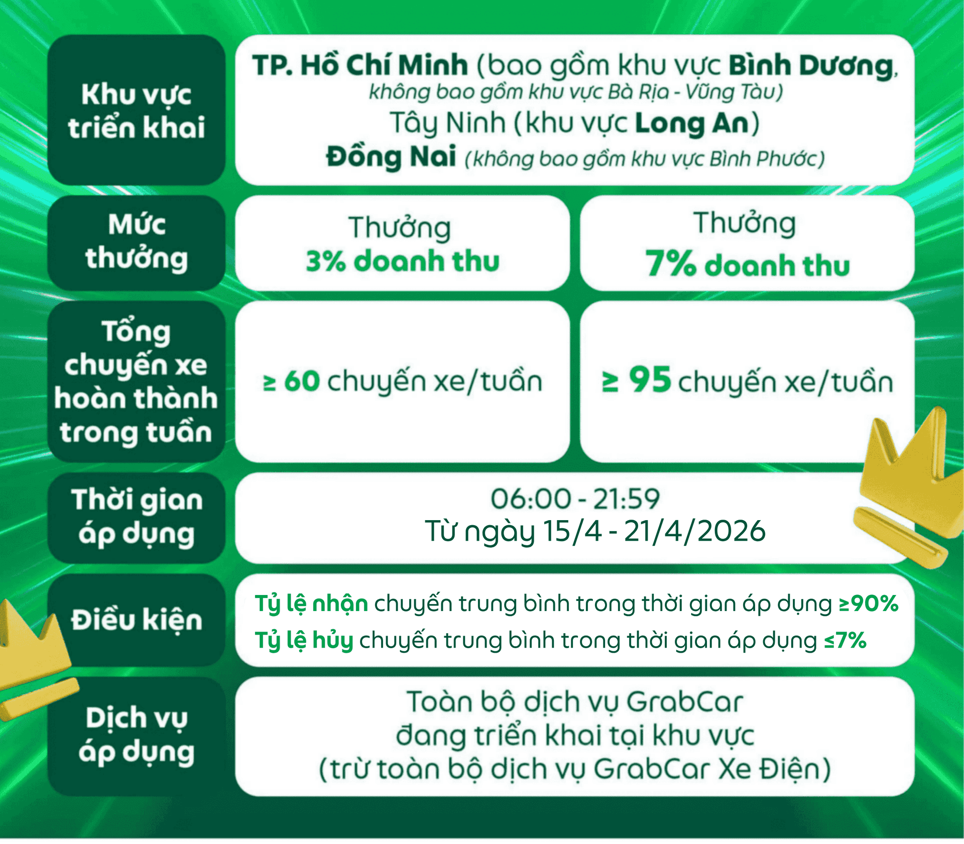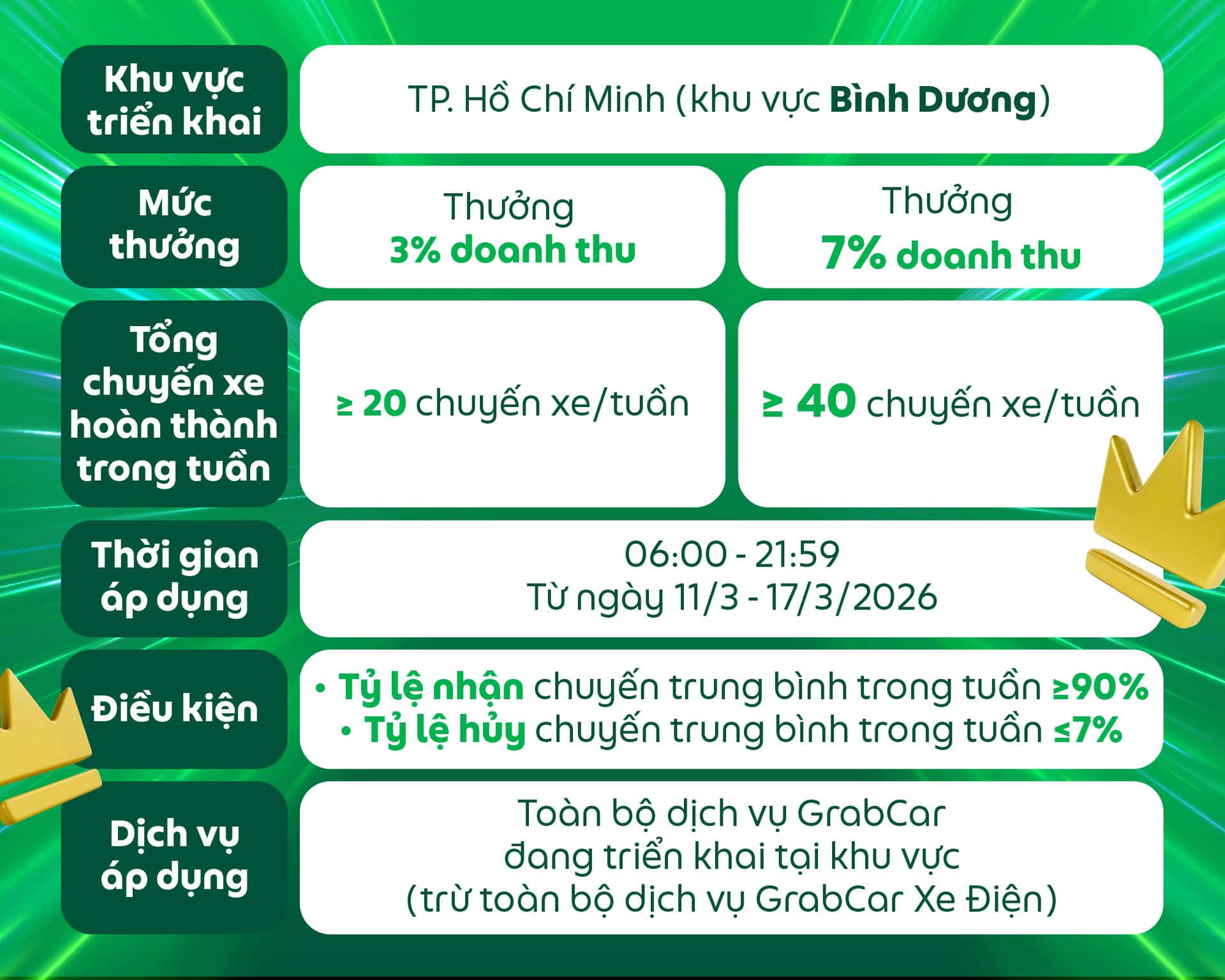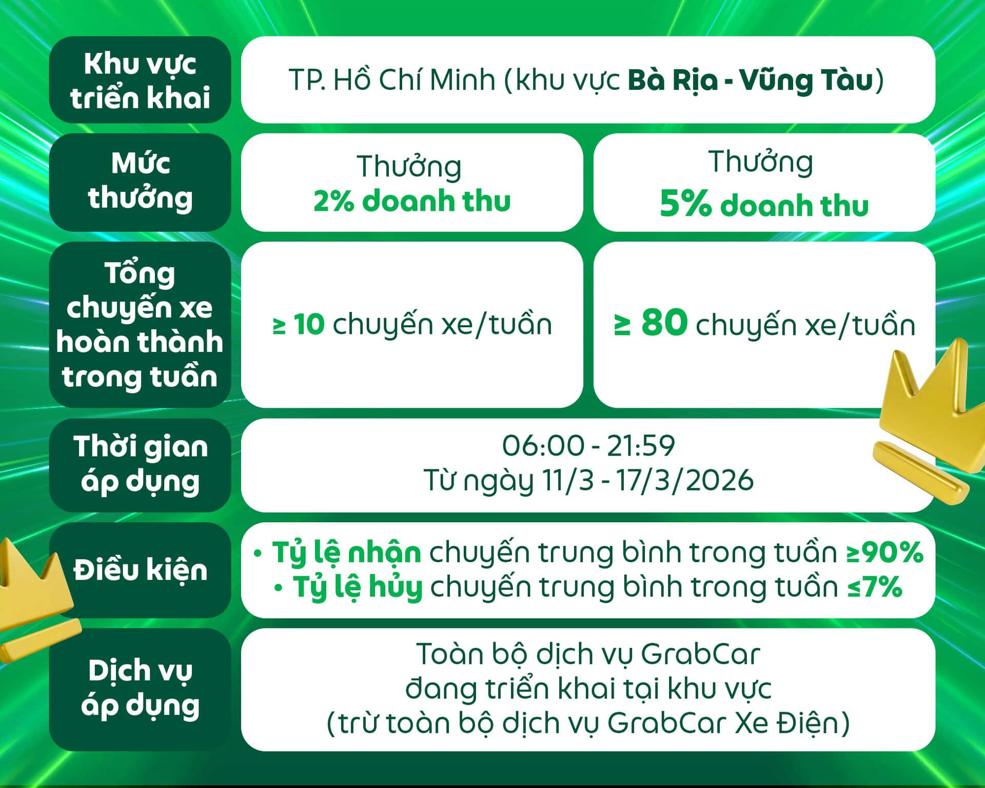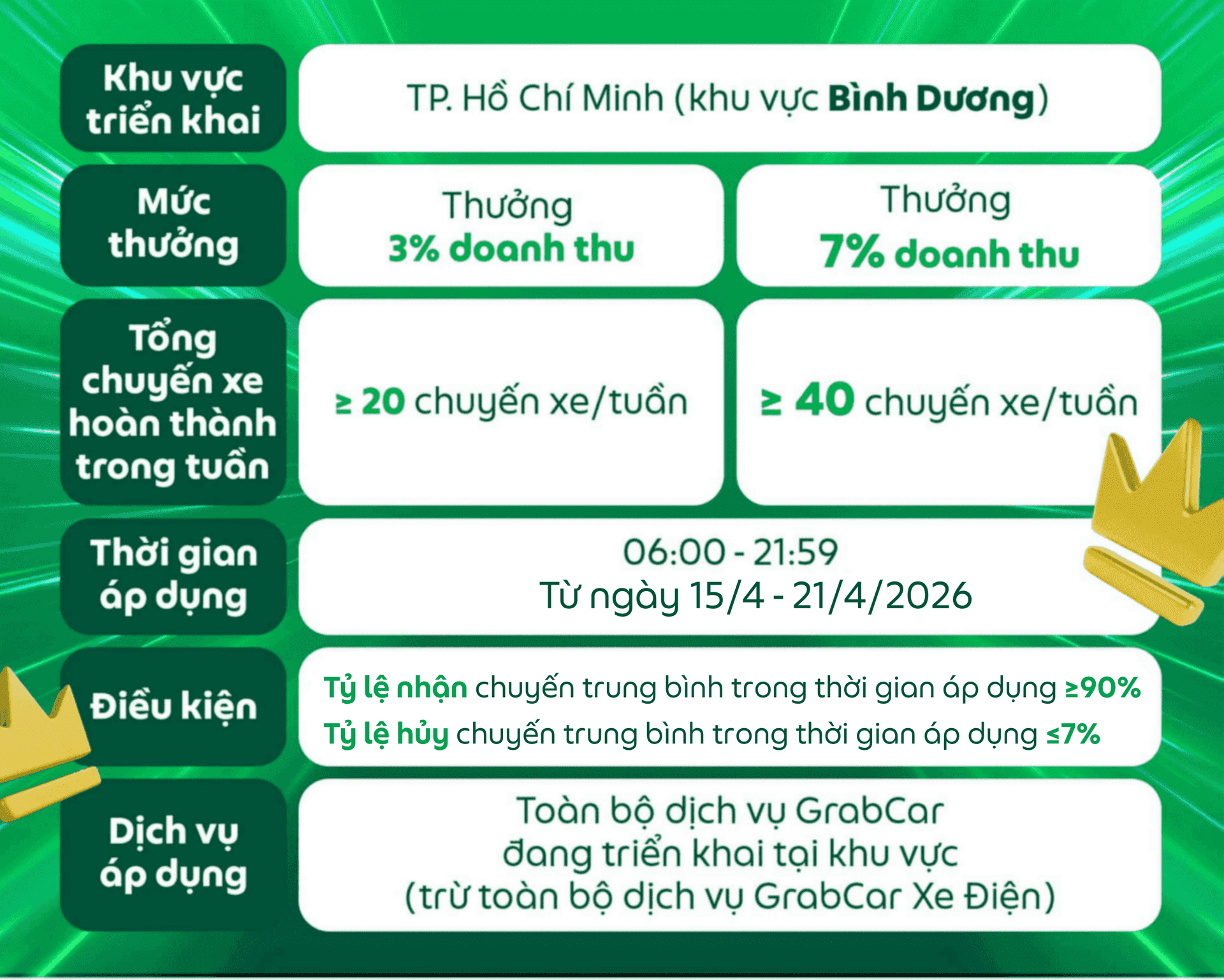 Các điều kiện của chương trình có thể thay đổi và sẽ được thông báo đến Đối tác, Grab có toàn quyền quyết định điều kiện và mức thưởng cuối cùng.
