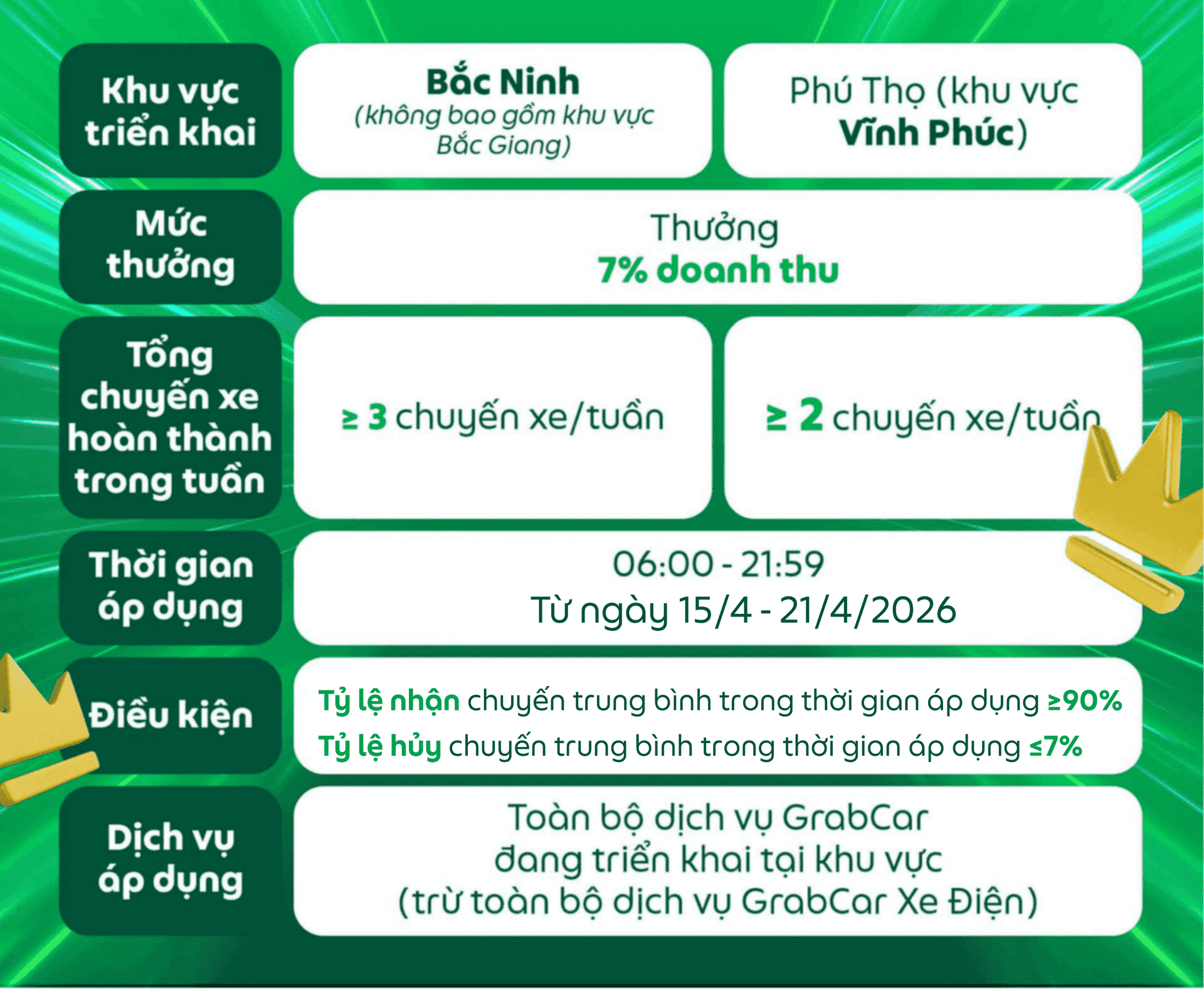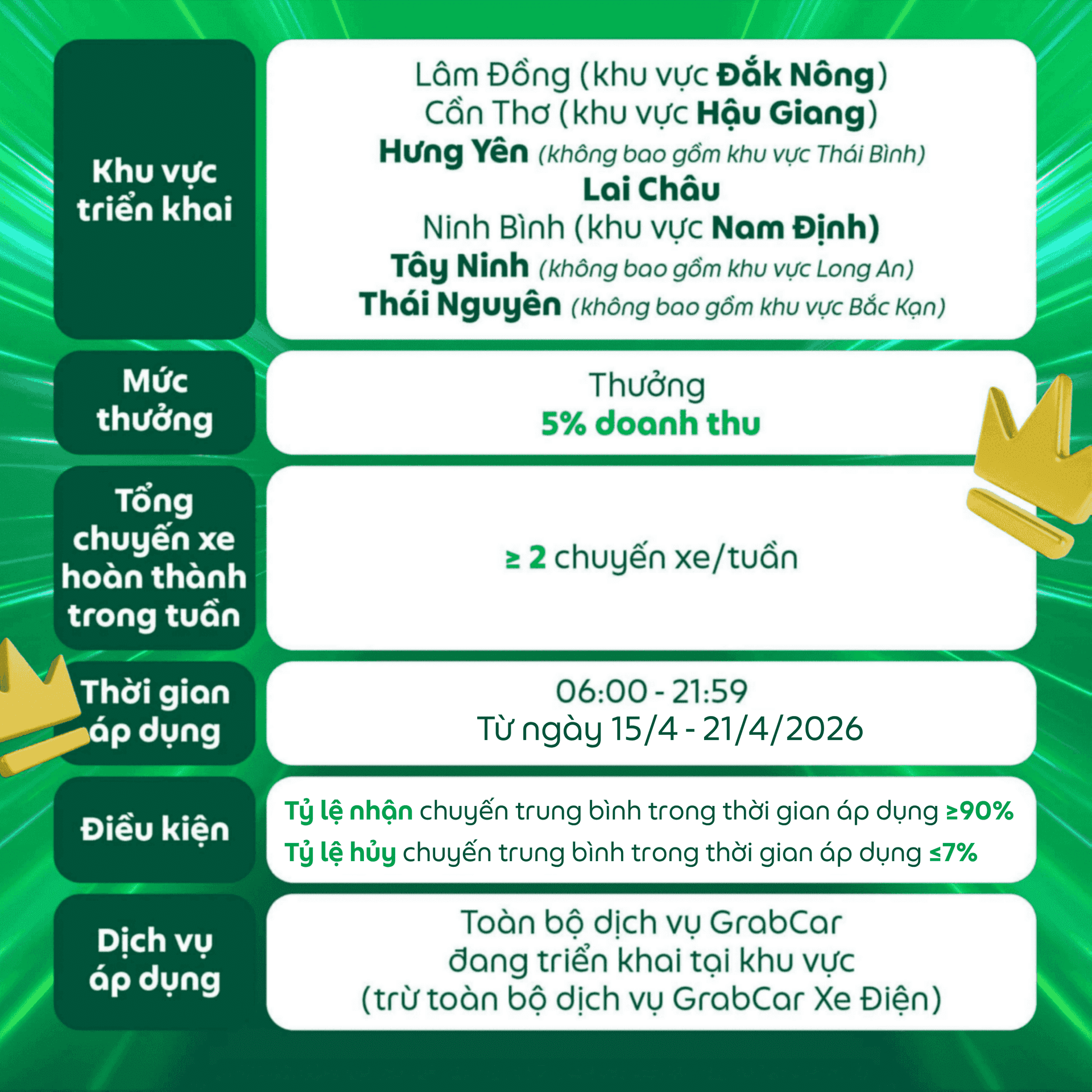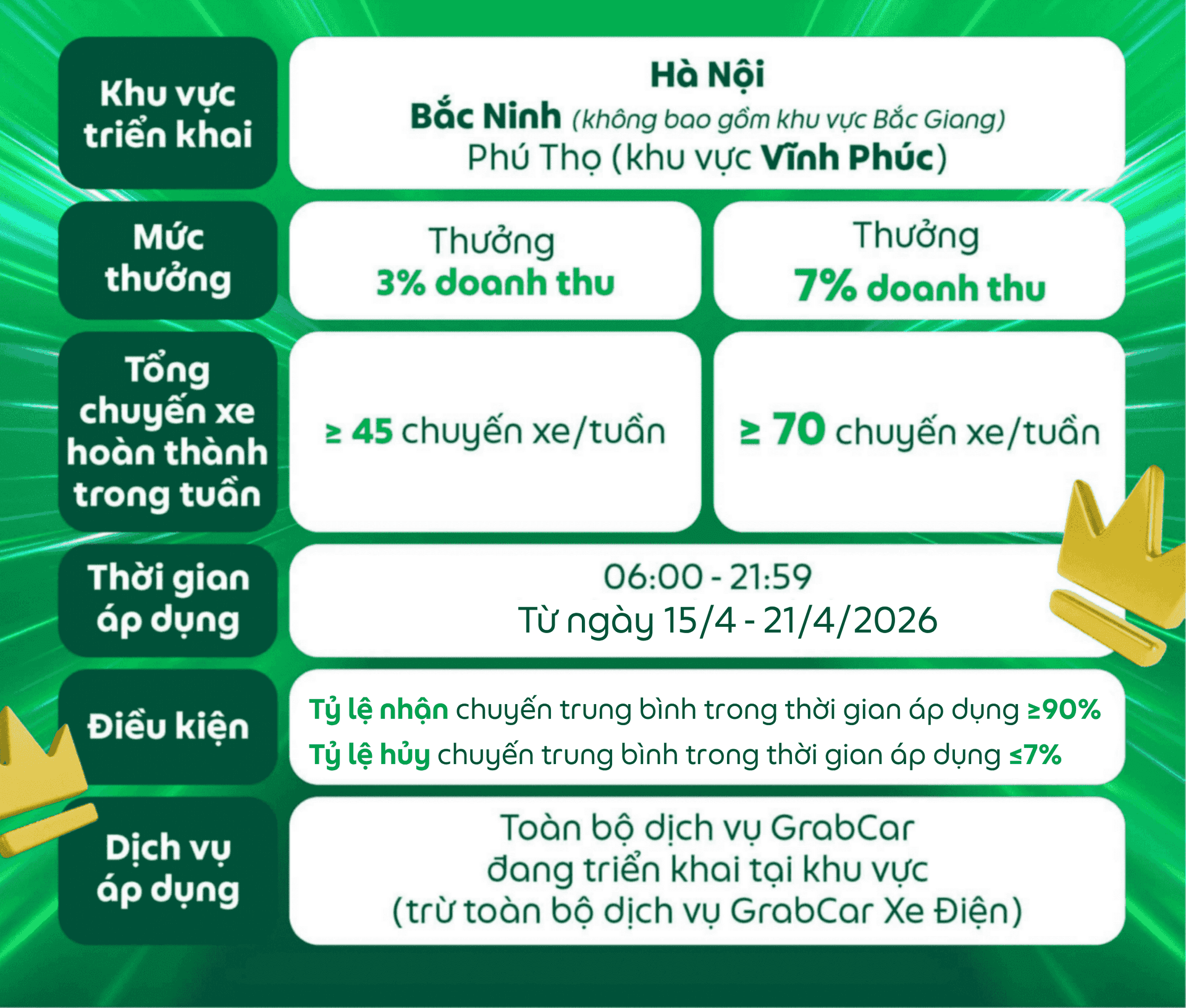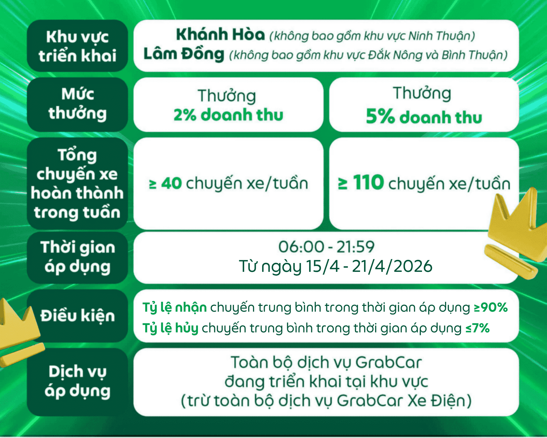 Các điều kiện của chương trình có thể thay đổi và sẽ được thông báo đến Đối tác, Grab có toàn quyền quyết định điều kiện và mức thưởng cuối cùng.