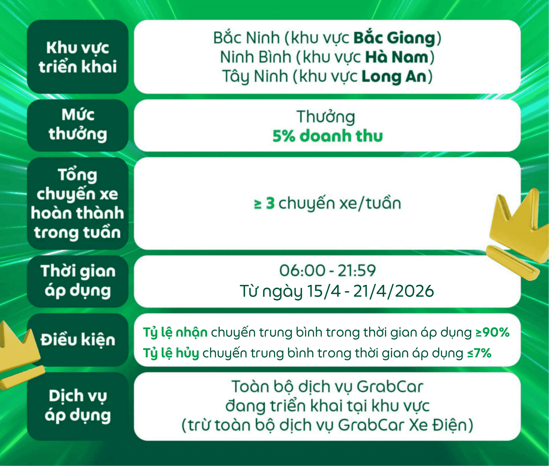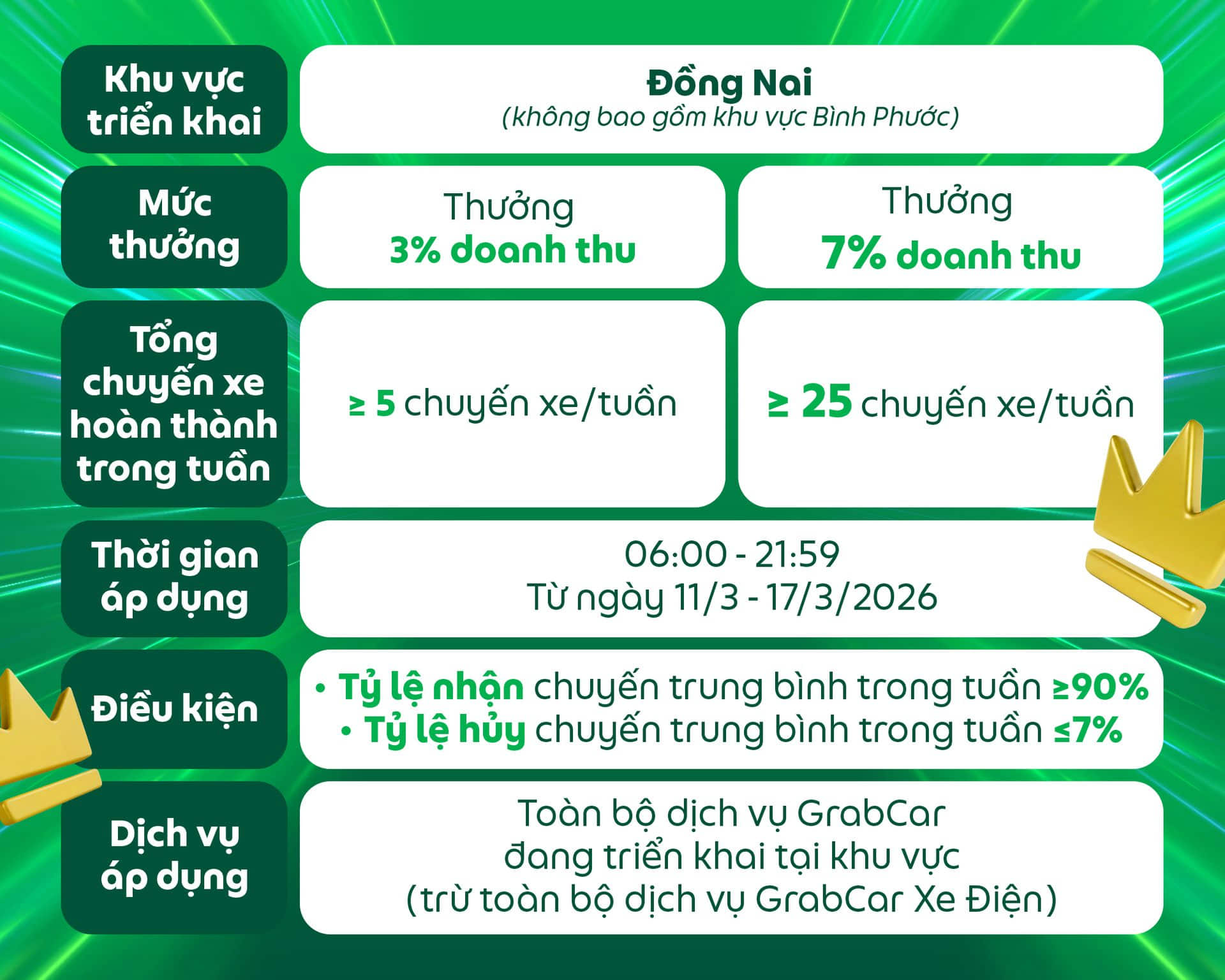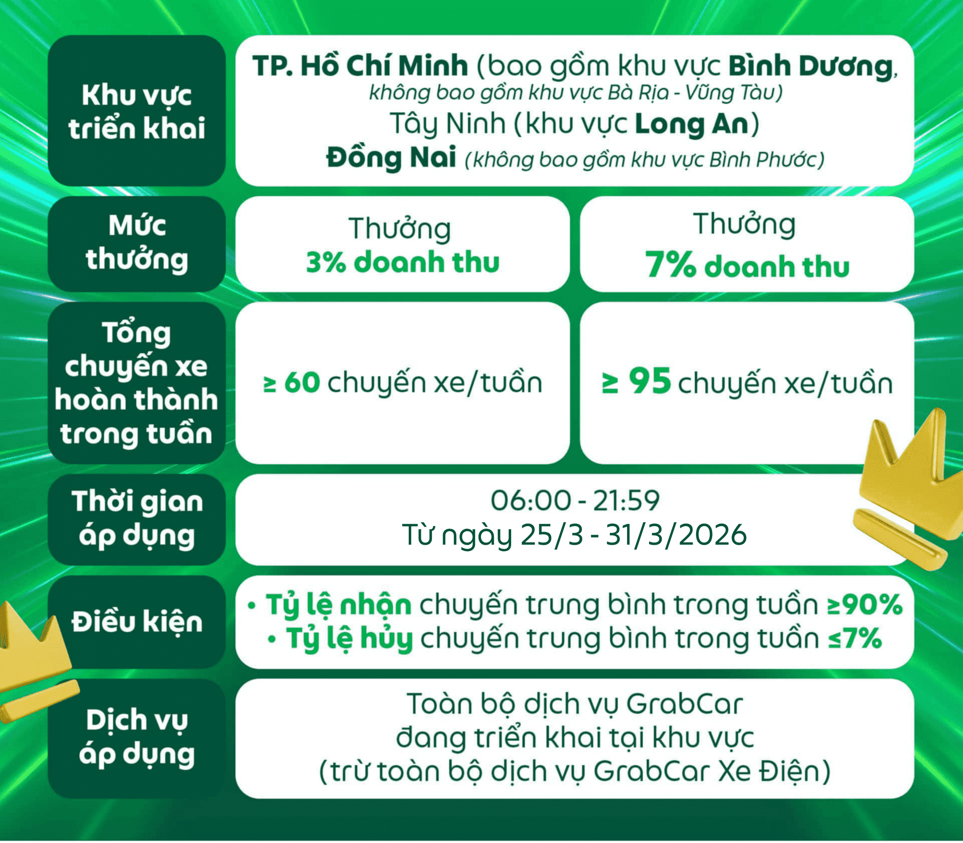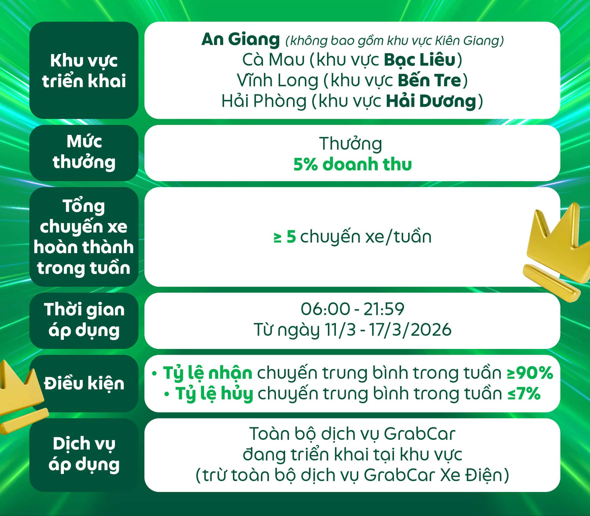 Các điều kiện của chương trình có thể thay đổi và sẽ được thông báo đến Đối tác, Grab có toàn quyền quyết định điều kiện và mức thưởng cuối cùng.