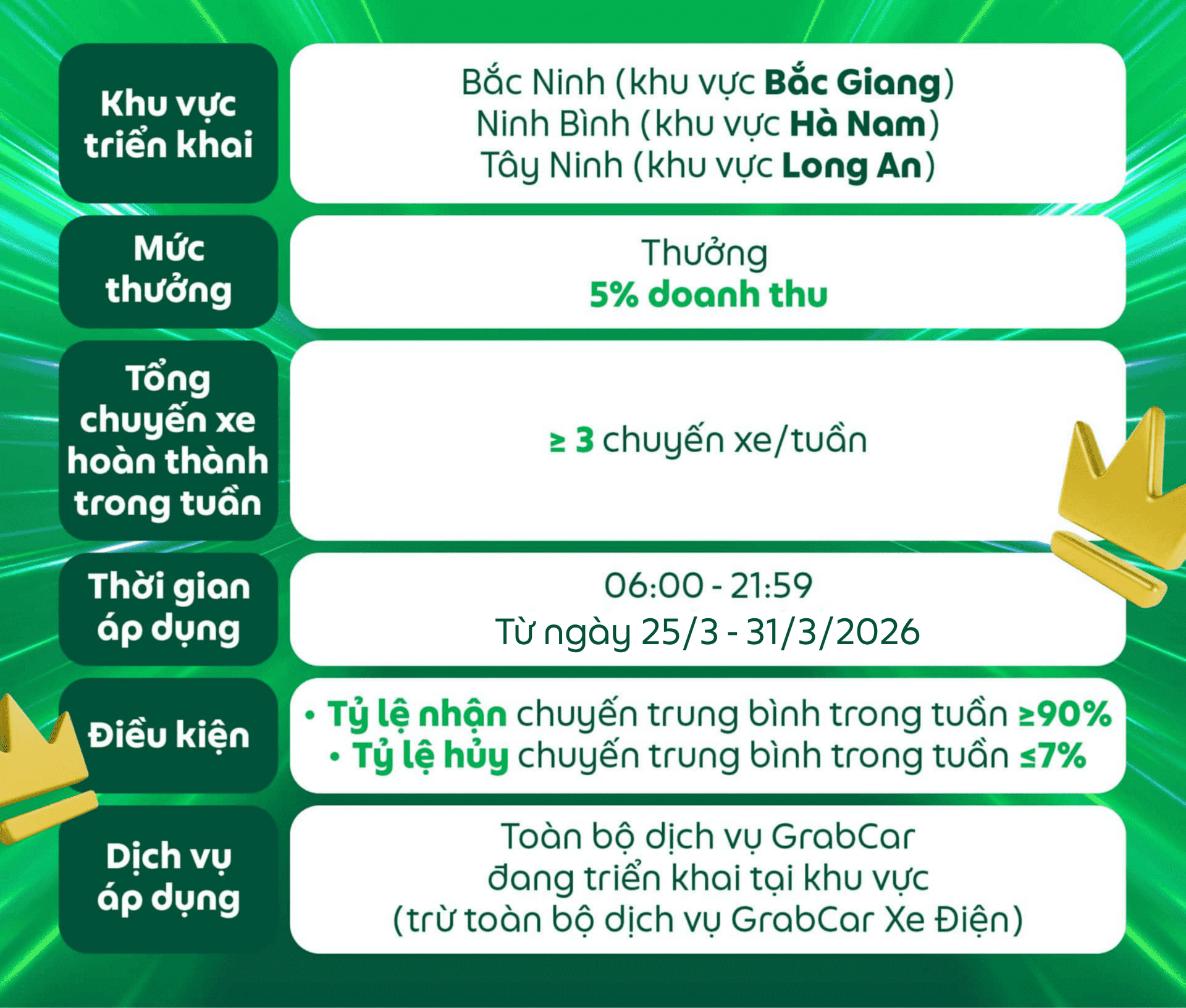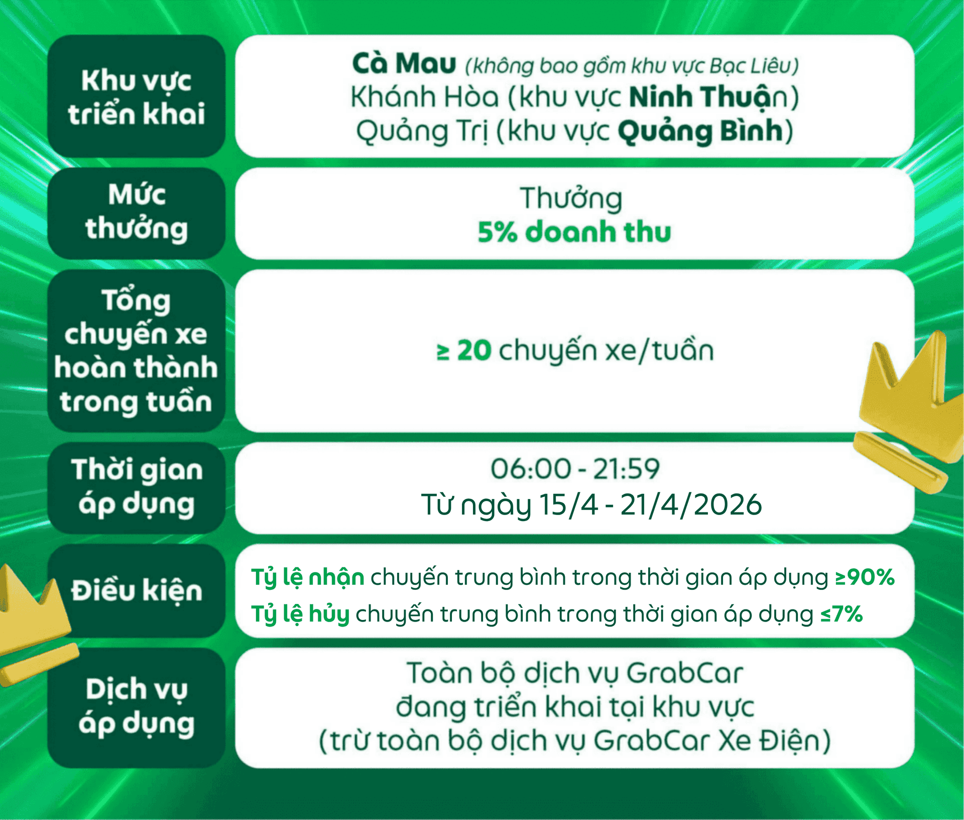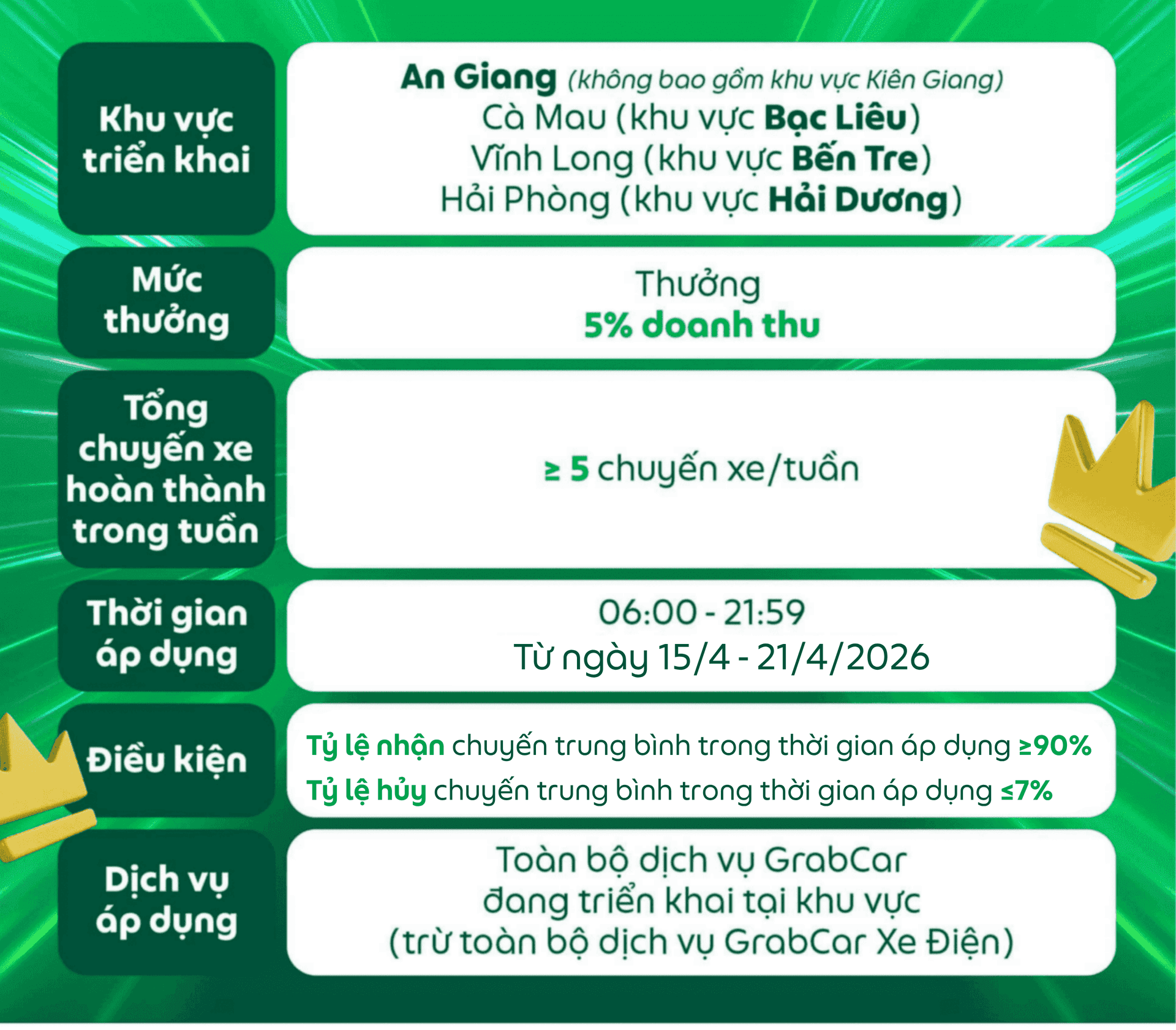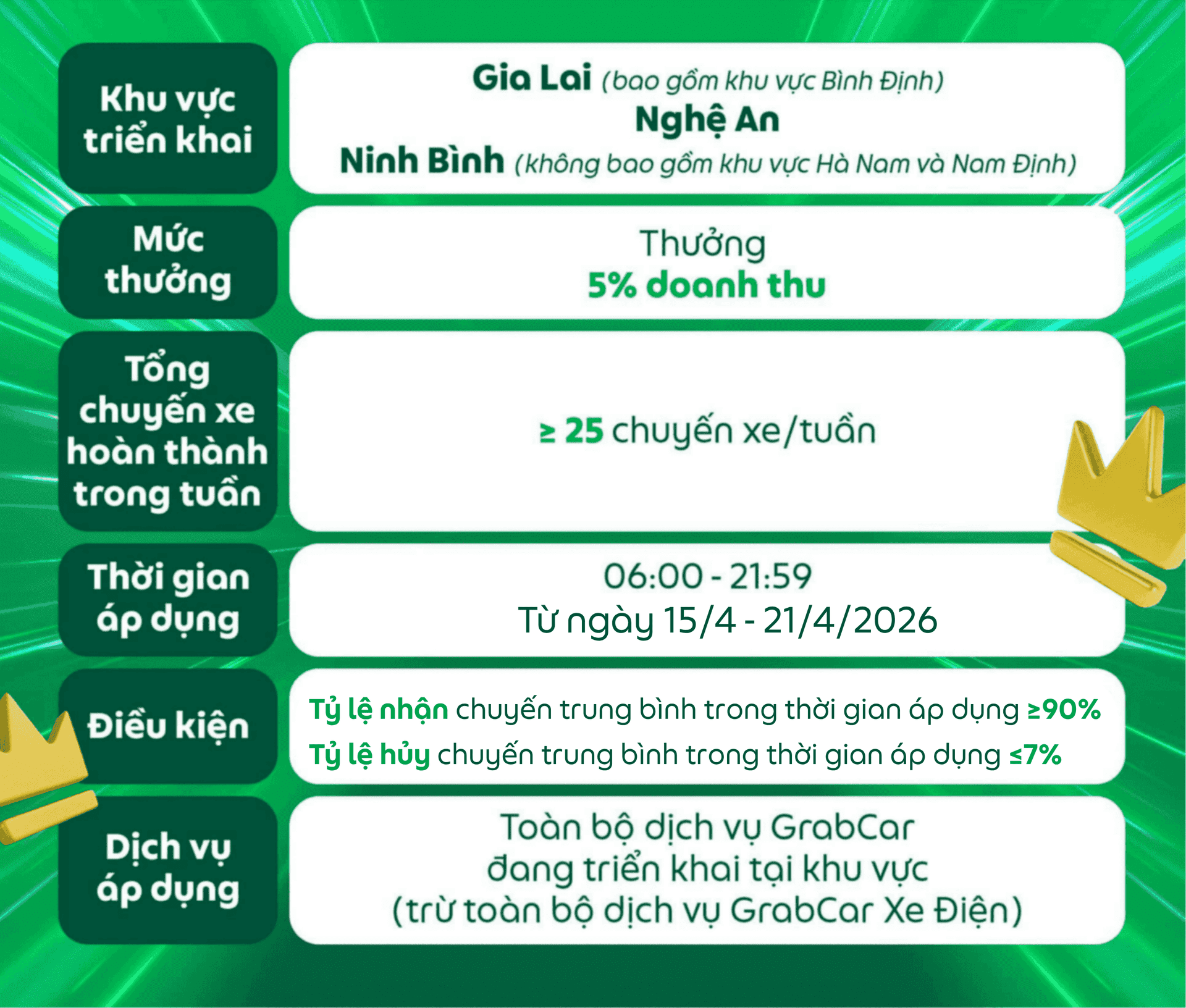 Các điều kiện của chương trình có thể thay đổi và sẽ được thông báo đến Đối tác, Grab có toàn quyền quyết định điều kiện và mức thưởng cuối cùng.