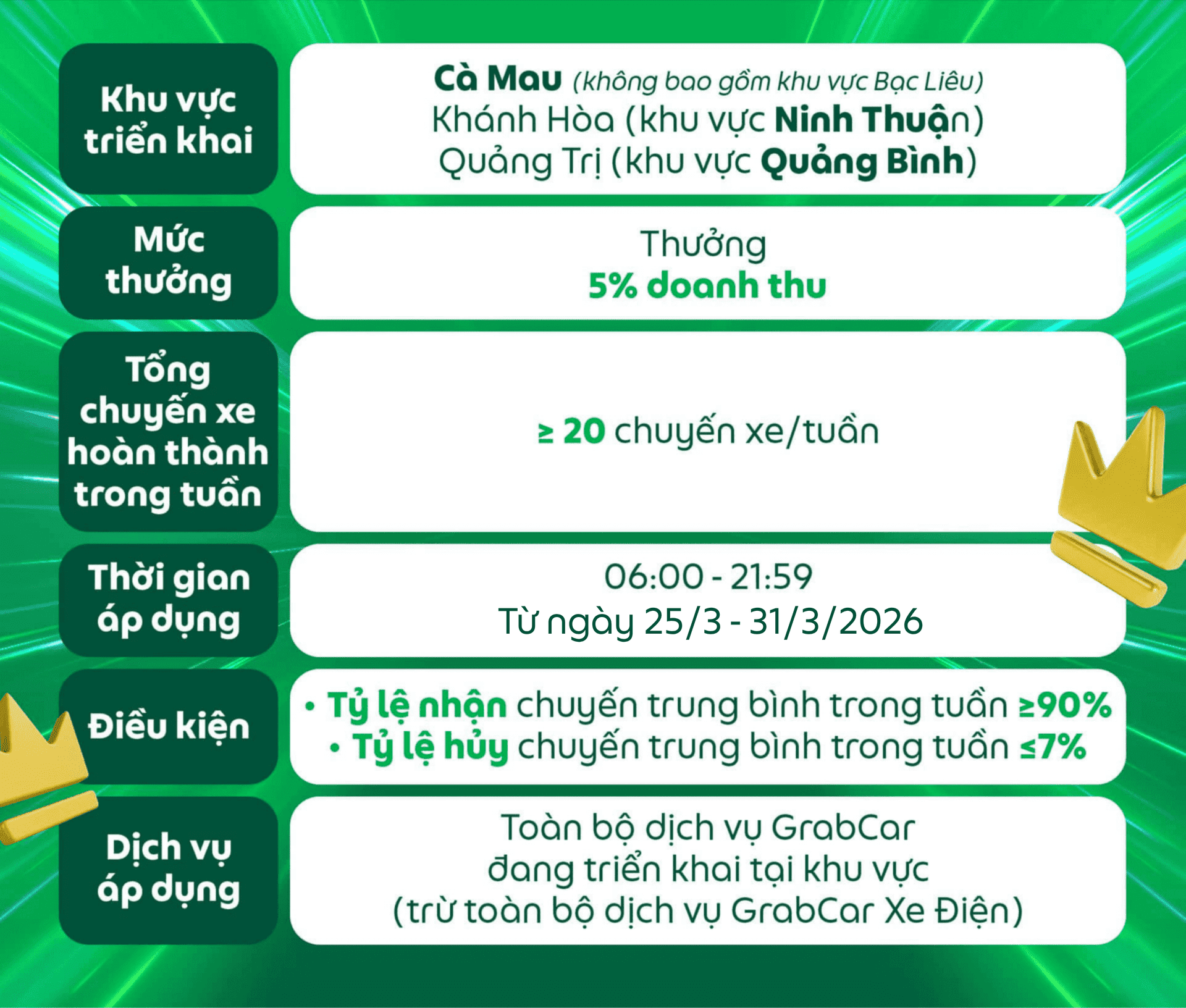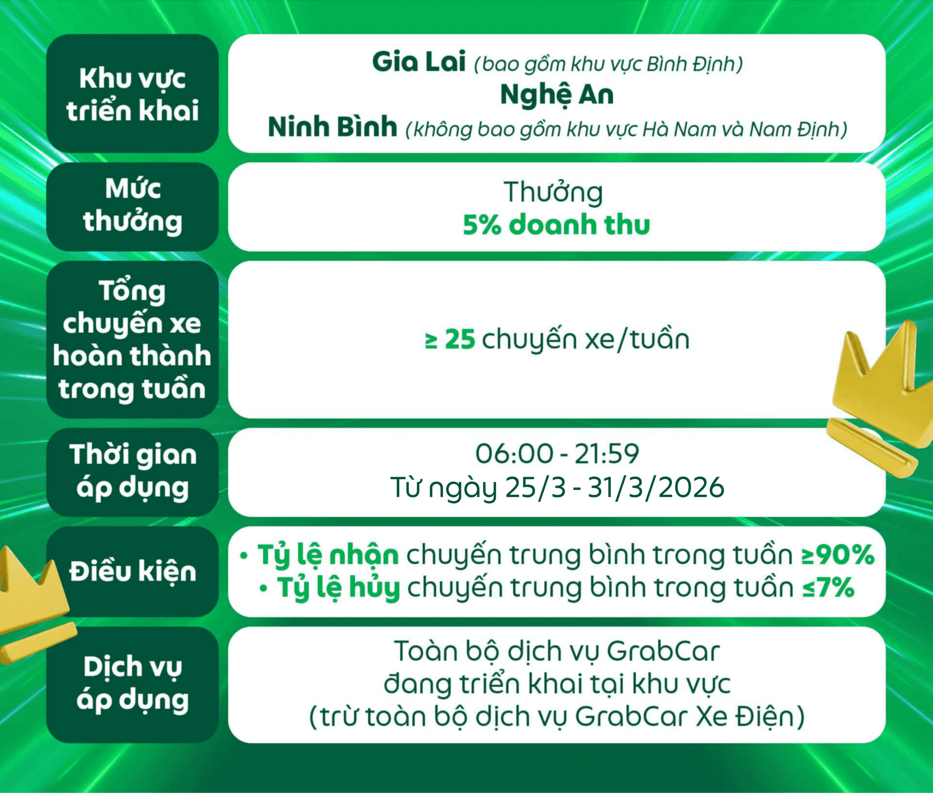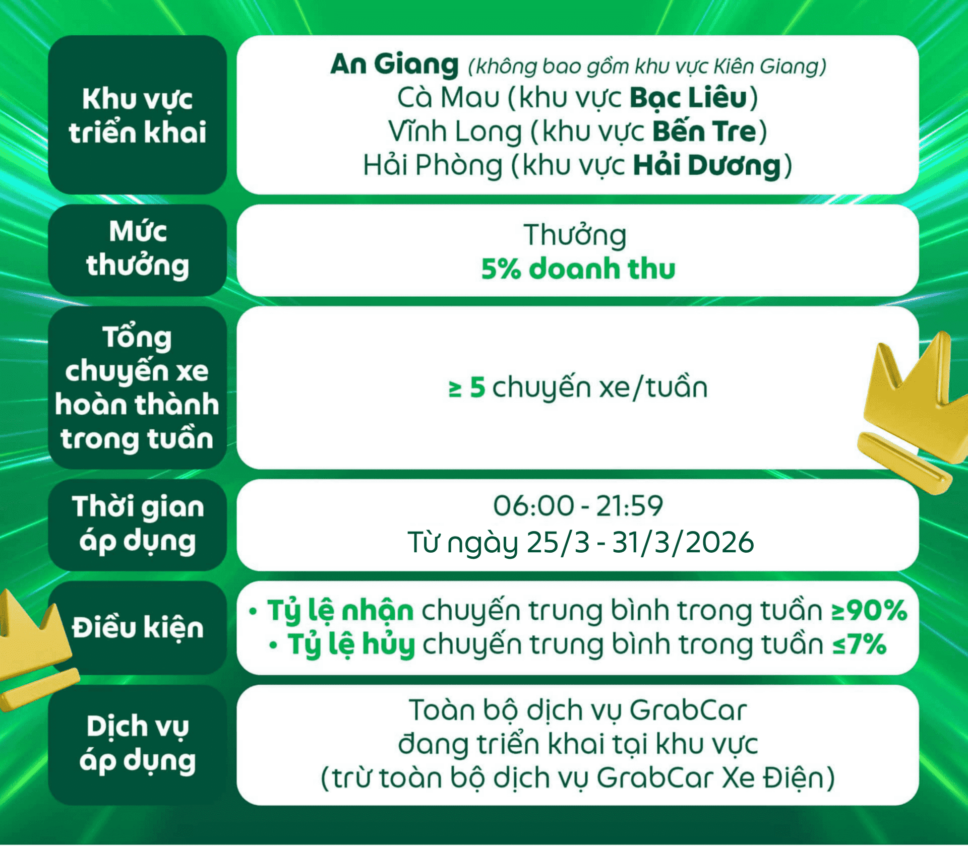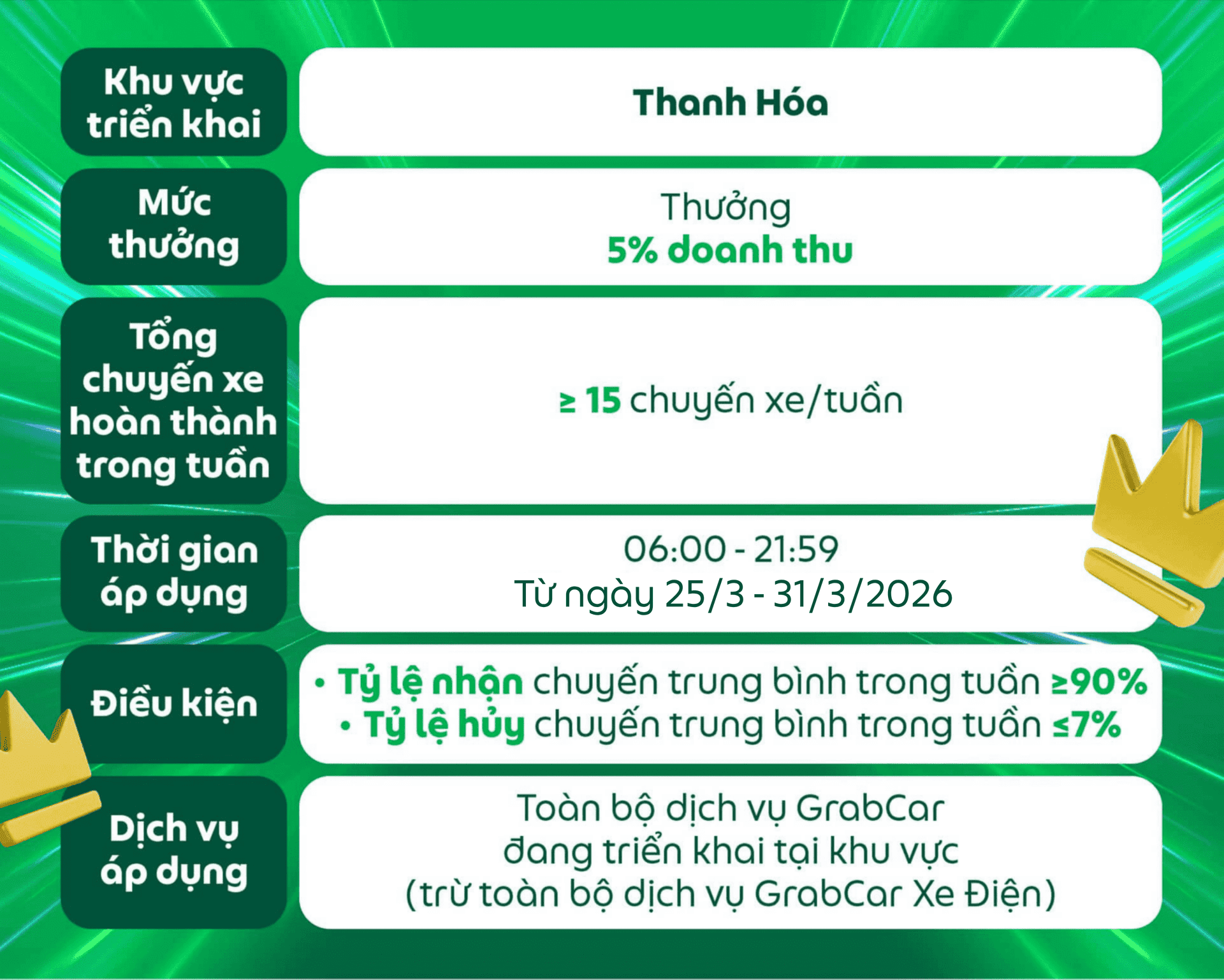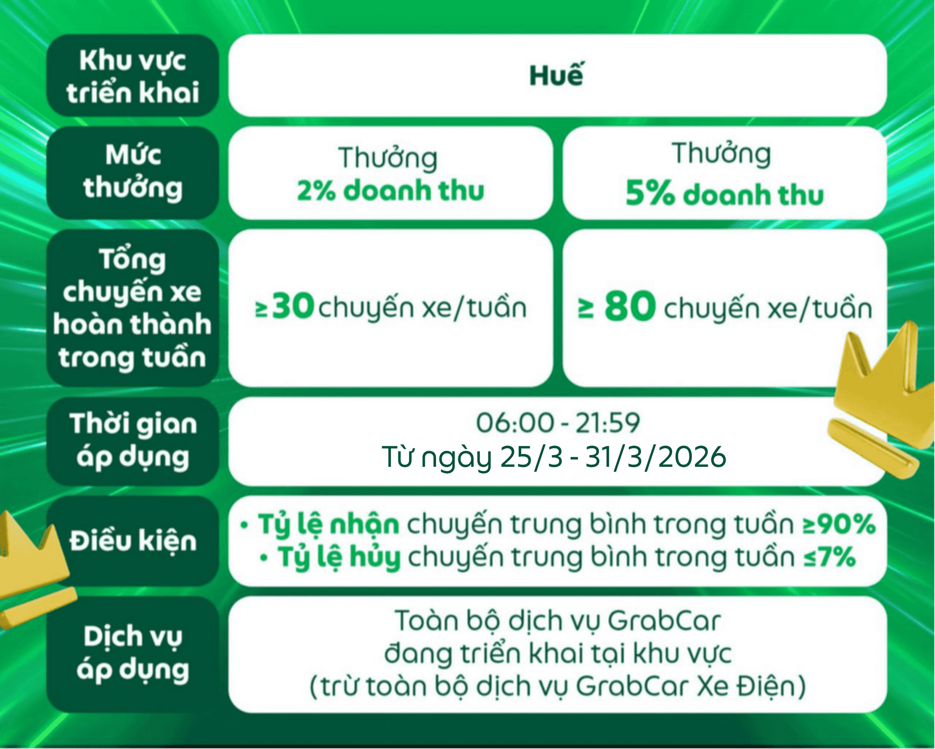 Điều kiện nhận thưởng của chương trình có thể thay đổi tùy theo quyết định của Grab vào từng thời điểm cụ thể và sẽ được thông báo đến Đối tác trước khi áp dụng.
