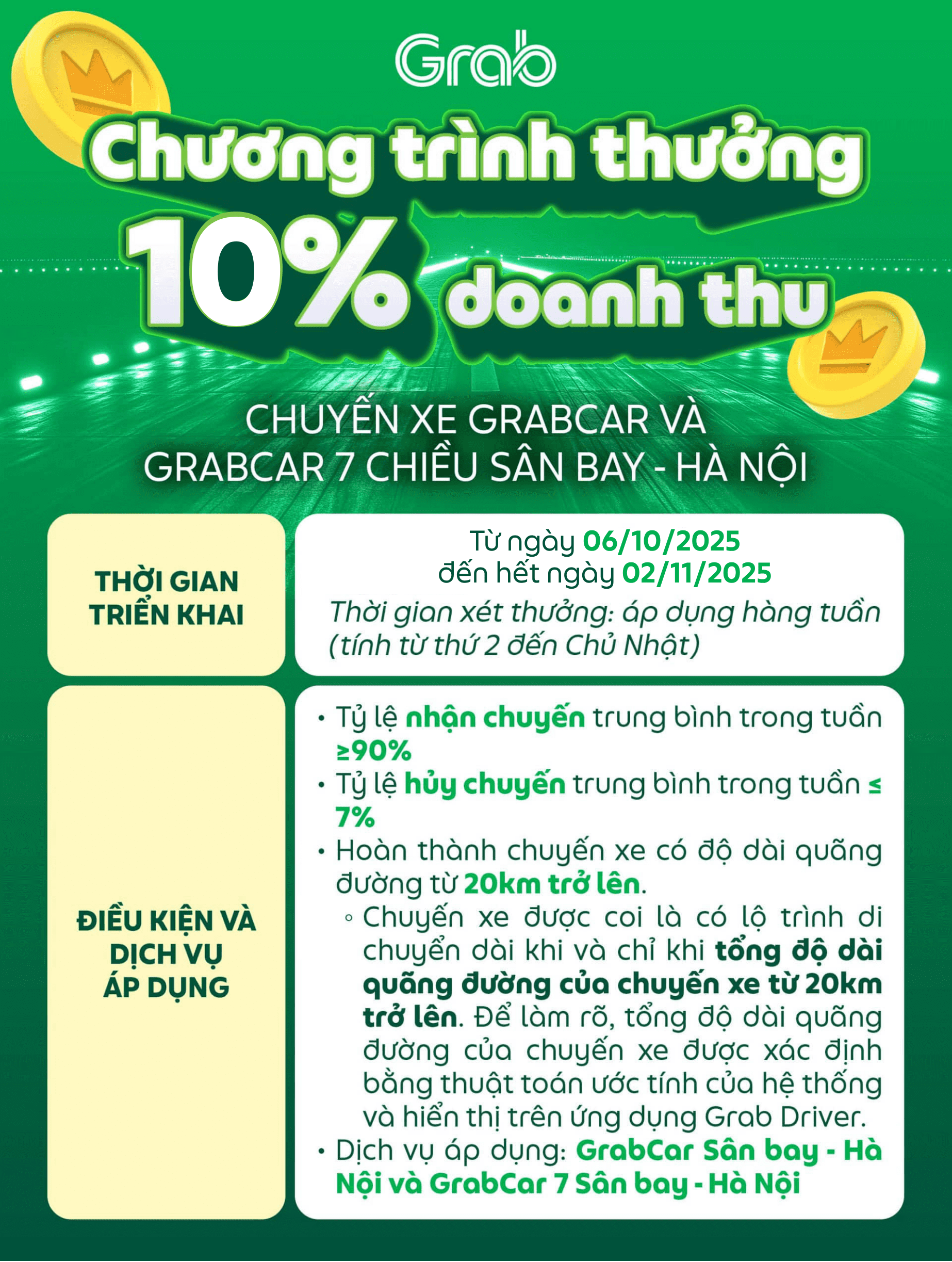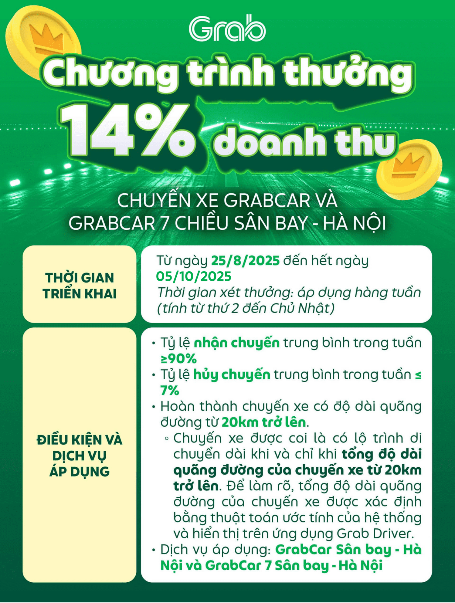 • Từ ngày 25/8/2025 đến hết ngày 02/11/2025, chương trình thưởng trên sẽ thay thế cho chương trình thưởng 5% doanh thu đối với chuyến xe có lộ trình dài đang được triển khai, chi tiết TẠI ĐÂY. Để làm rõ, dịch vụ GrabCar Sân bay – Hà Nội và GrabCar 7 Sân bay – Hà Nội sẽ không được tính trong chương trình thưởng 5% doanh thu.