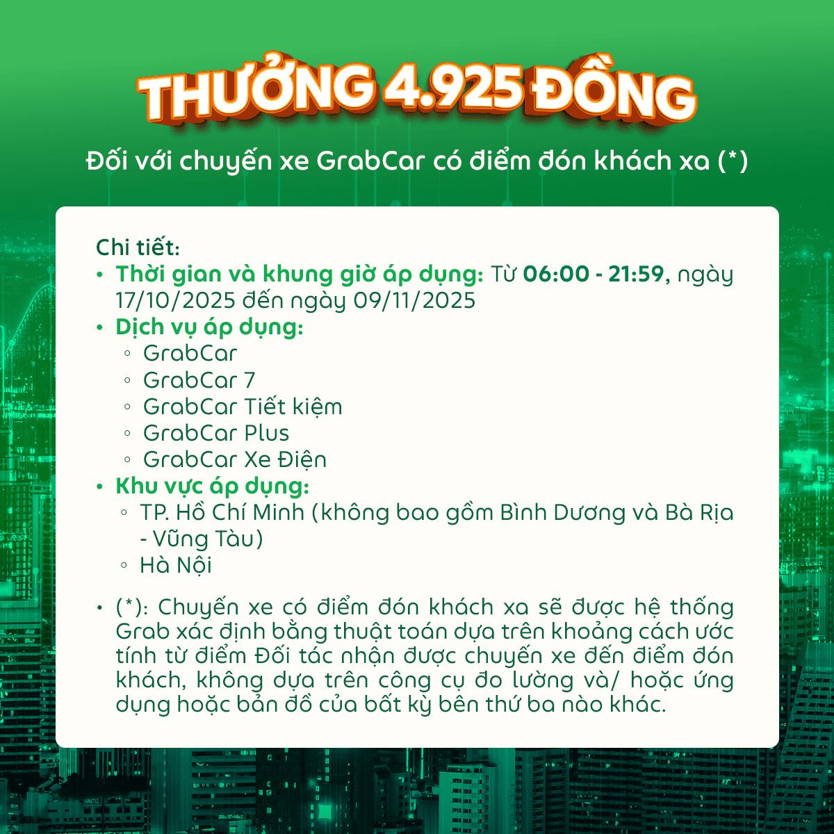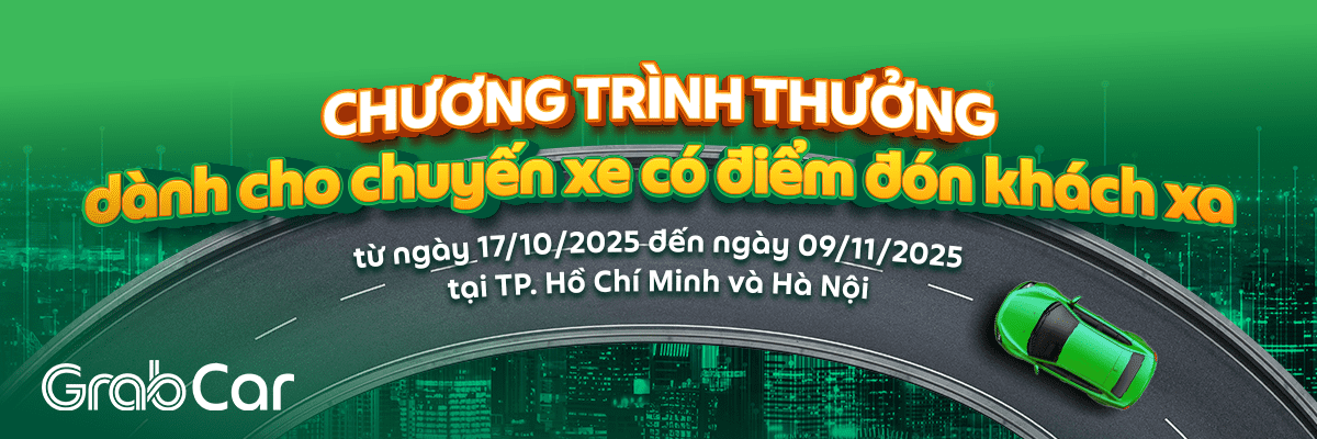 Tiếp sức Bác tài tới đây! 🔥 Chương trình thưởng nóng nhằm tiếp thêm động lực để Đối tác hoàn thành các chuyến xe GrabCar một cách hiệu quả, từ ngày 17/10/2025, Grab triển khai chương trình thưởng dành cho các chuyến xe có điểm đón khách xa.