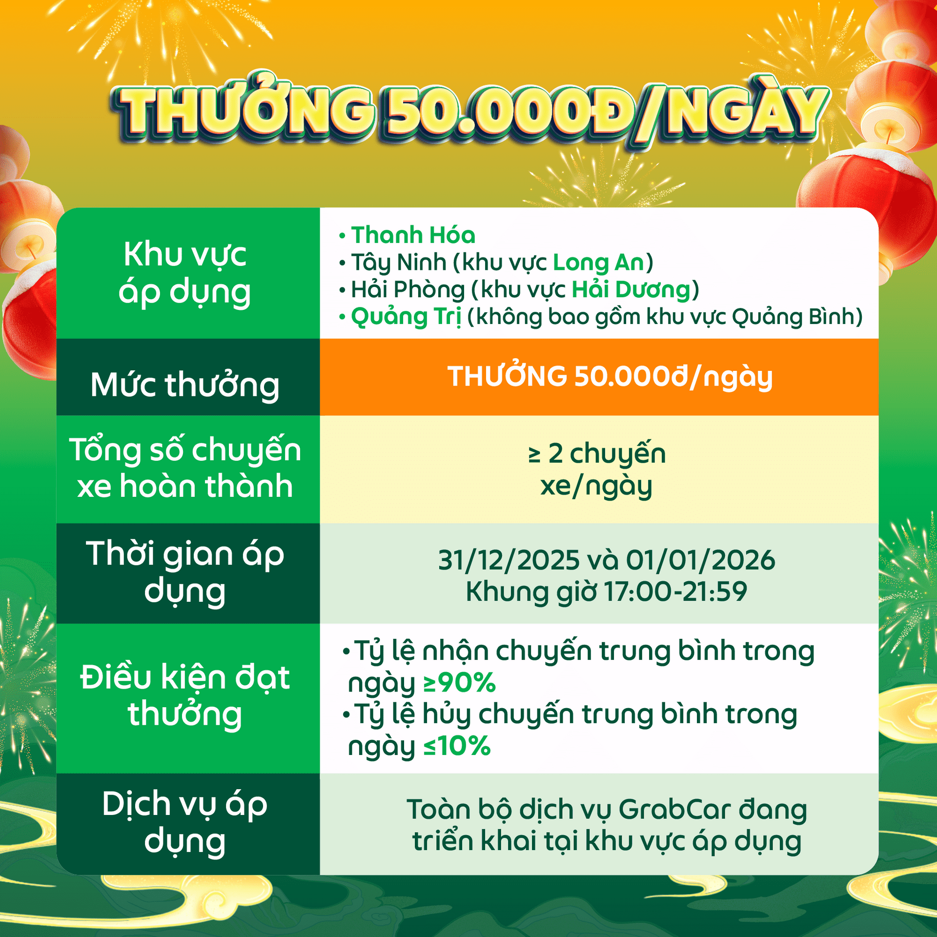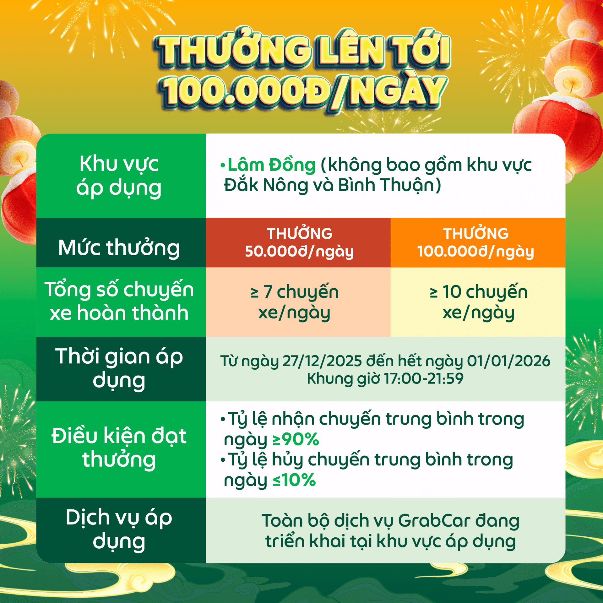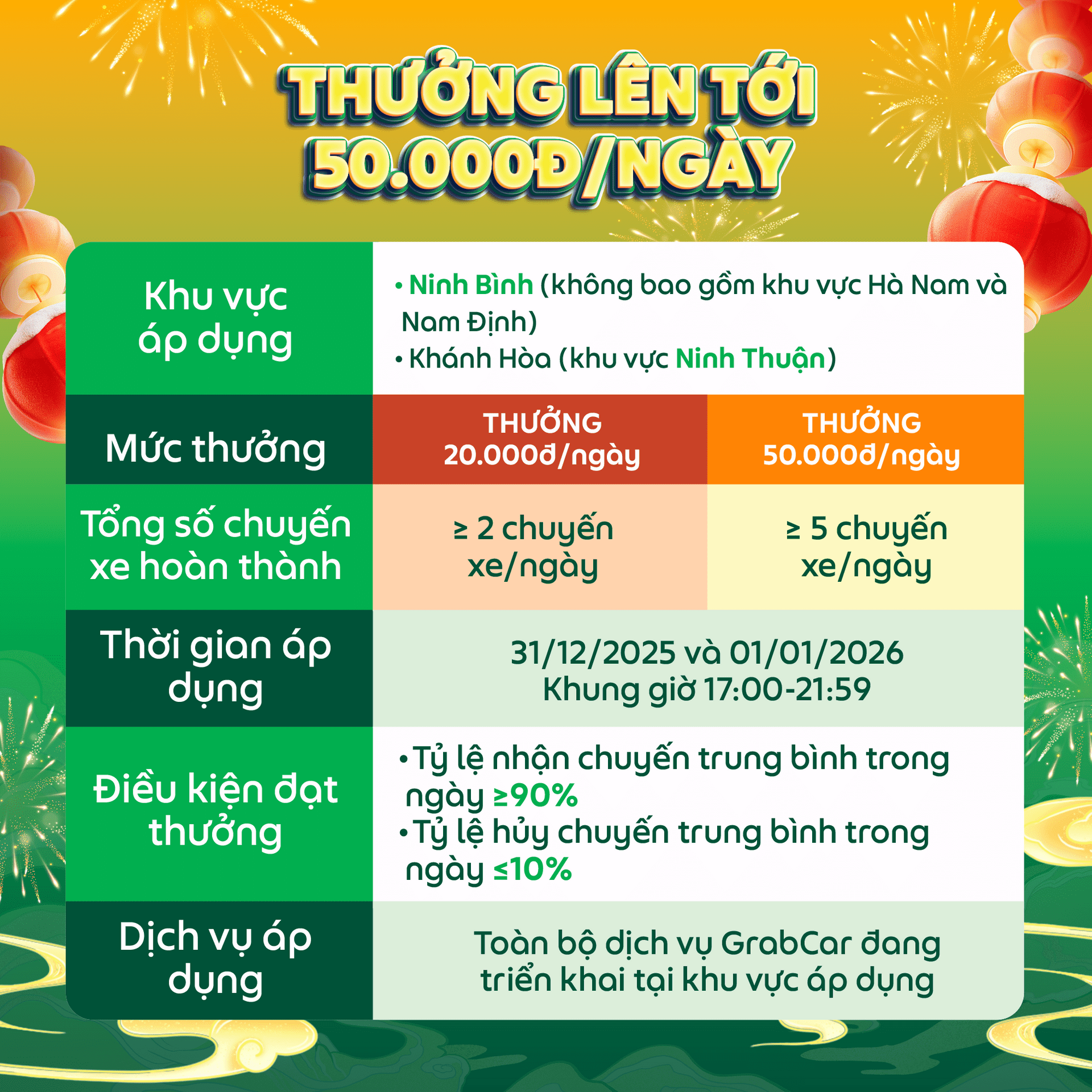Năm 2025 đang khép lại, mở ra năm mới 2026 với bao dự định và cơ hội mới. Để tiếp thêm ‘nhiên liệu’ cho những hành trình đầu tiên của năm mới, Grab xin gửi đến các Đối tác chương trình thưởng hấp dẫn dịp Tết Dương lịch.