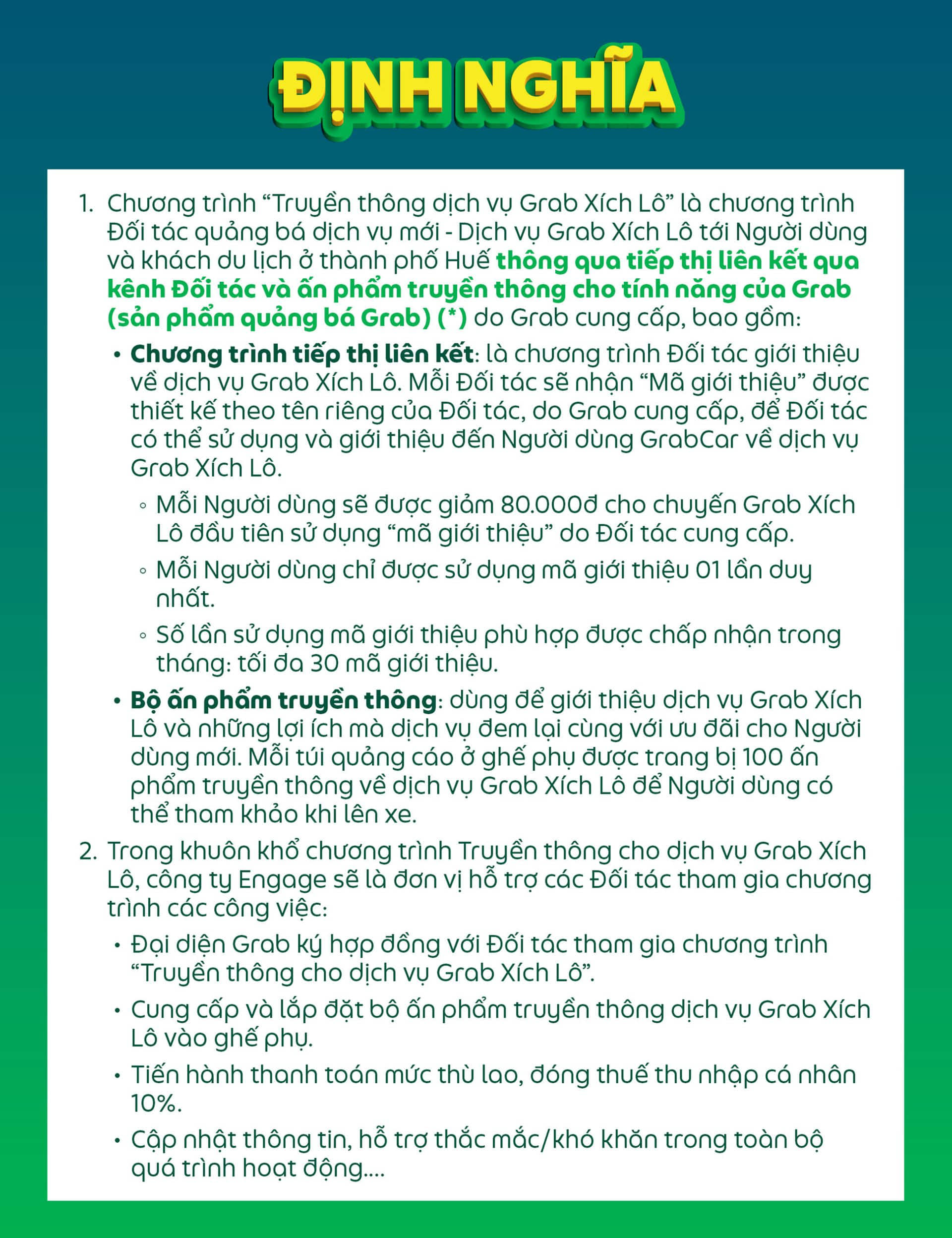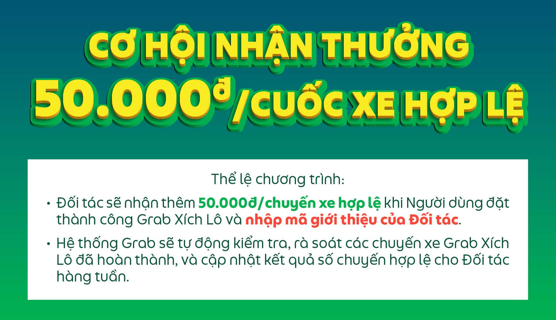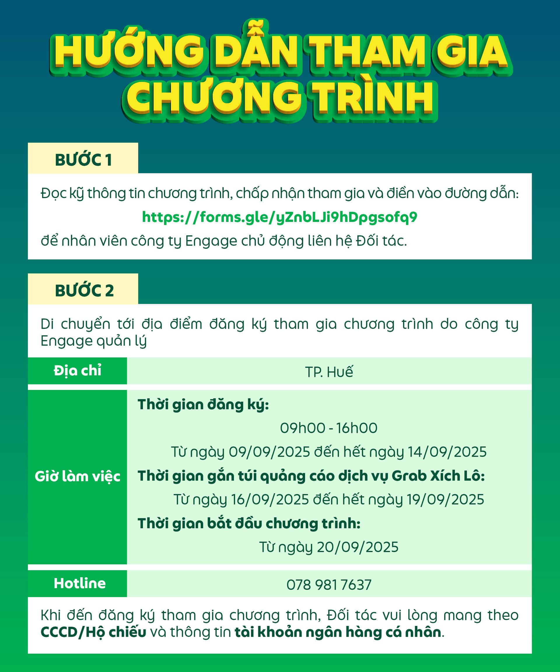 Đây là cơ hội để các Đối tác GrabCar trở thành những “đại sứ thân thiện”, cùng Grab quảng bá dịch vụ Grab Xích Lô – một trải nghiệm văn hóa độc đáo dành cho người dân và du khách khi ghé thăm cố đô. Thông qua lời giới thiệu từ Đối tác và các ấn phẩm truyền thông chính thức của Grab, mỗi Đối tác không chỉ góp phần lan tỏa hình ảnh đẹp về Huế mà còn có thêm cơ hội gia tăng thu nhập hấp dẫn từ chương trình tiếp thị liên kết này. 🌟