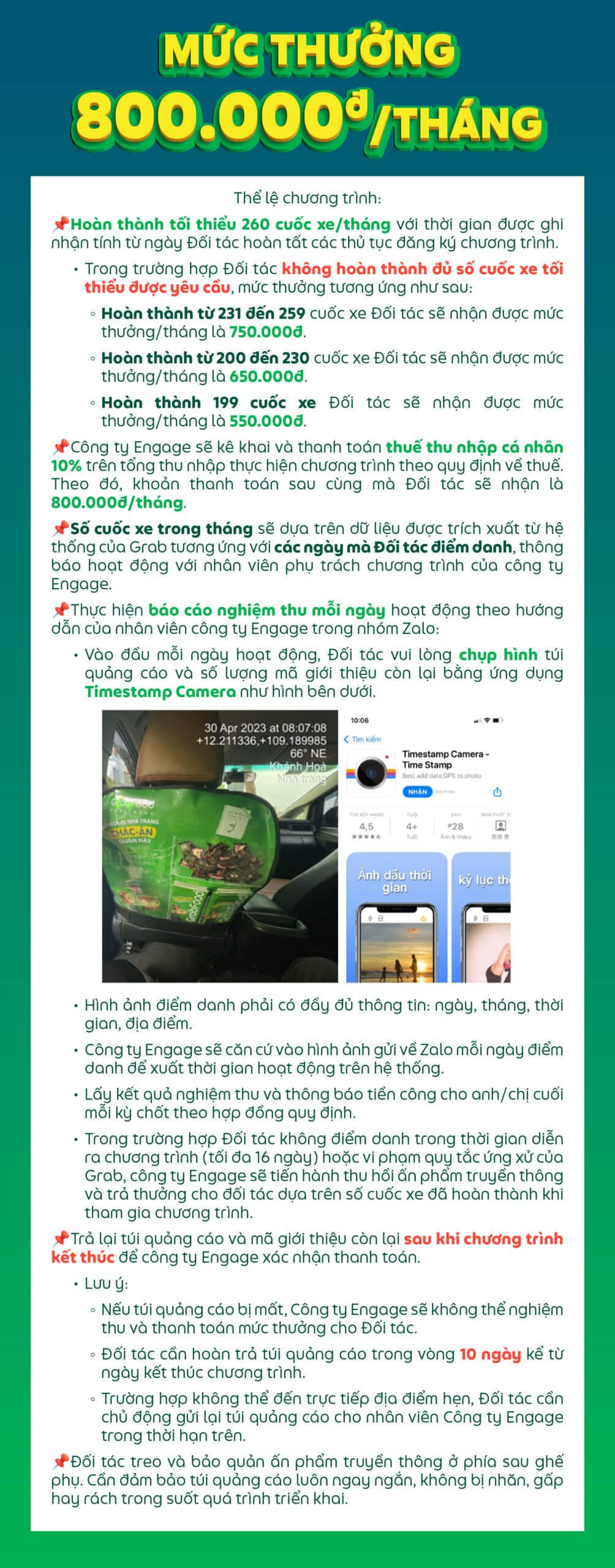 Mọi thắc mắc liên quan tới chương trình, Đối tác vui lòng liên hệ với Công ty Engage qua Hotline/nhóm Zalo. Nếu chưa được giải đáp, liên hệ nhân viên phụ trách từ Grab: Anh Thư – 077.712.8586.