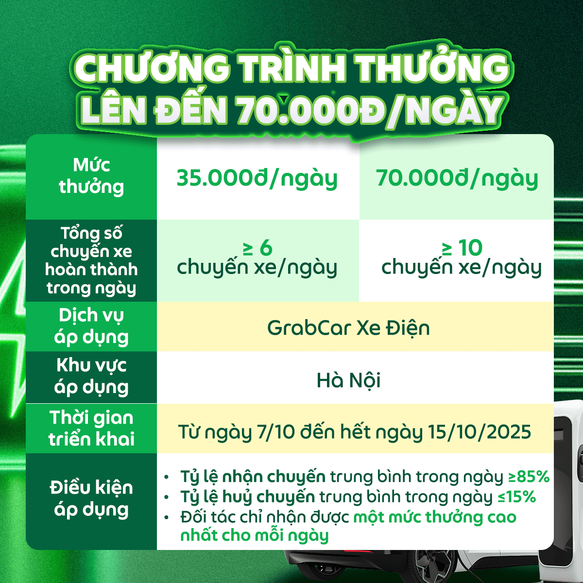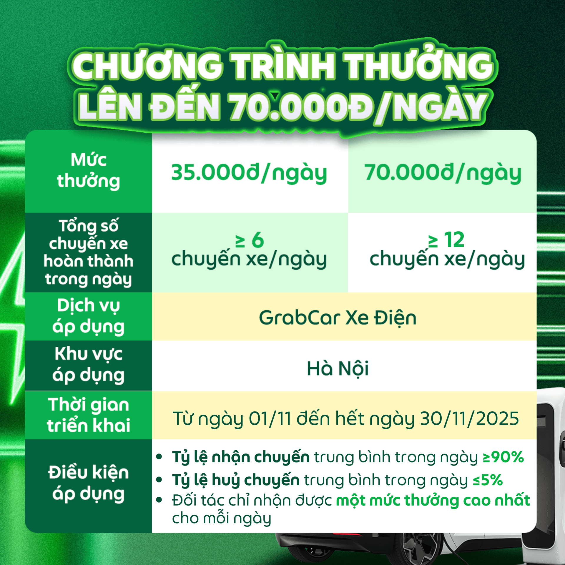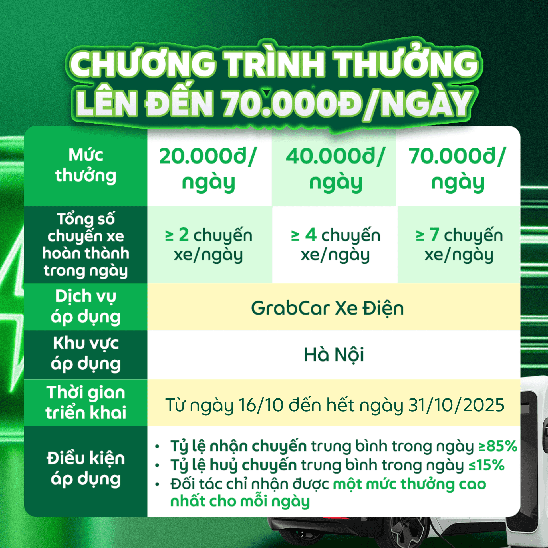 Mỗi ngày ra xe và hoàn thành chuyến xe GrabCar Xe Điện, Đối tác không chỉ có thêm thu nhập mà còn có cơ hội nhận thưởng tới 70.000đ với chương trình thưởng được Grab triển khai. Cùng xem chi tiết nhé!