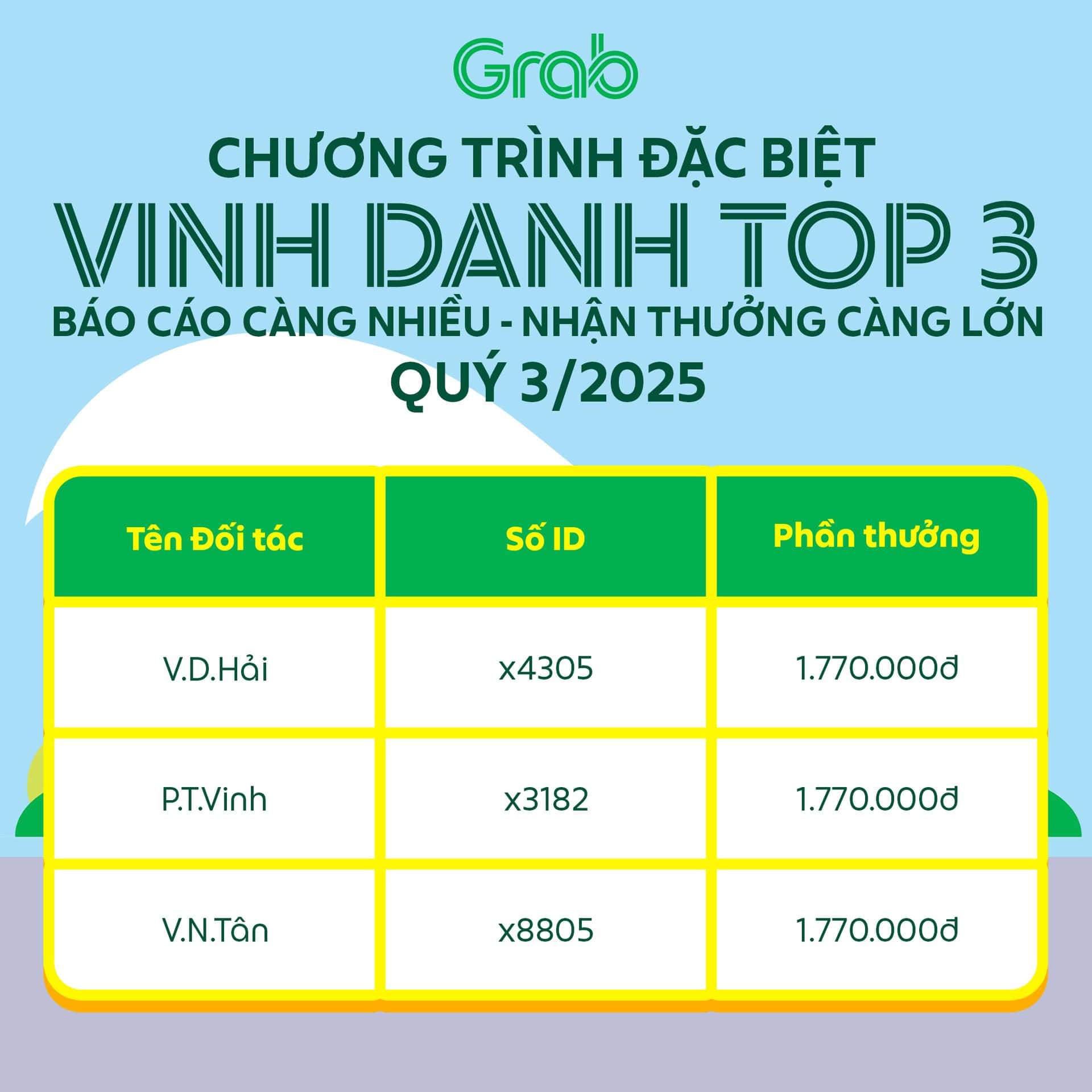 🎉 Grab xin chúc mừng 03 Đối tác xuất sắc đạt giải đặc biệt Quý 3/2025 trong chương trình “Báo cáo càng nhiều – Nhận thưởng càng lớn”!
