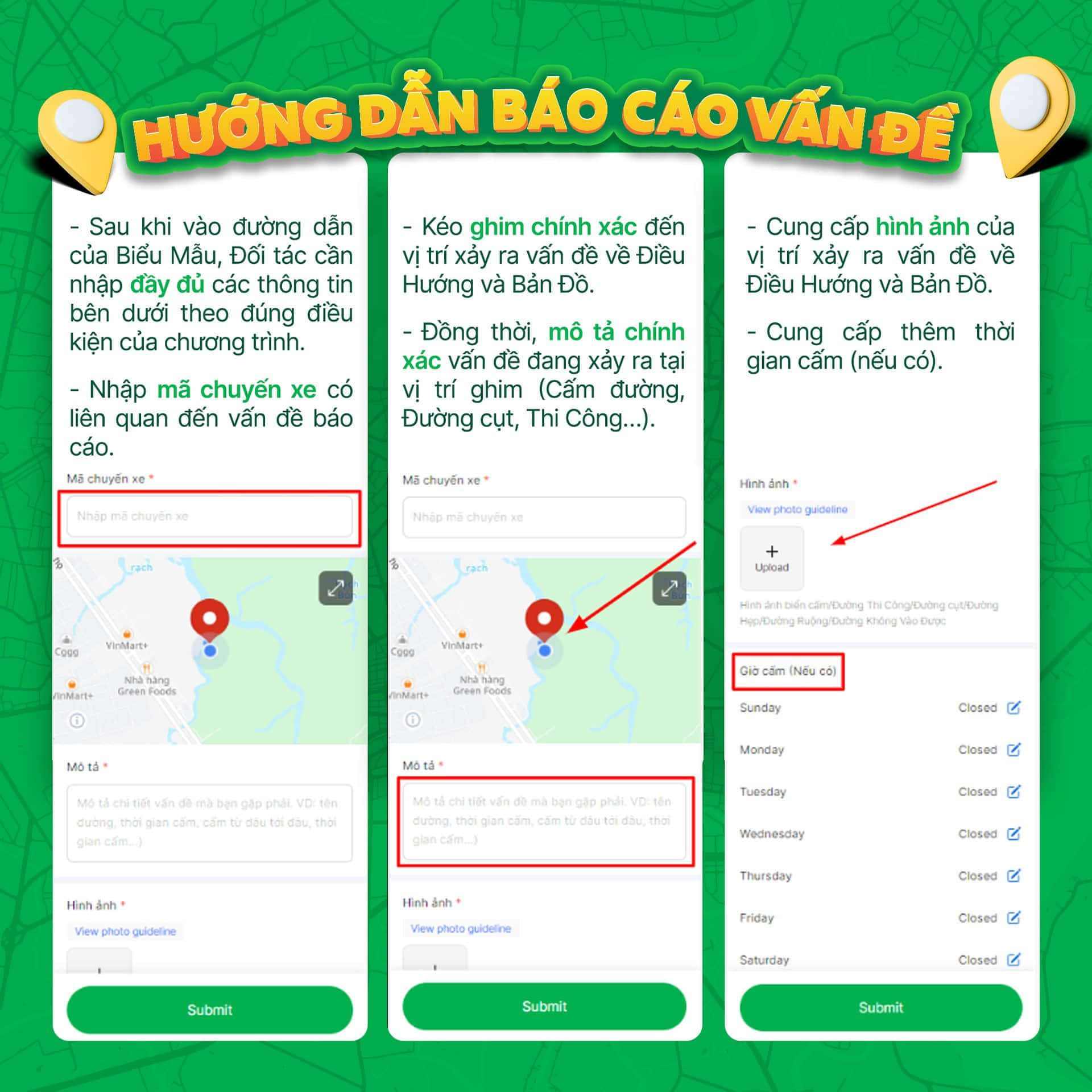 Các Đối tác có thể dễ dàng “Báo cáo vấn đề sau khi hoàn thành chuyến xe” cho Grab, góp phần nâng cao chất lượng dữ liệu bản đồ thông qua Biểu mẫu GEO. Khi báo cáo thành công, các Đối tác sẽ có thêm cơ hội nhận những phần thưởng hấp dẫn vào Ví tiền mặt.
