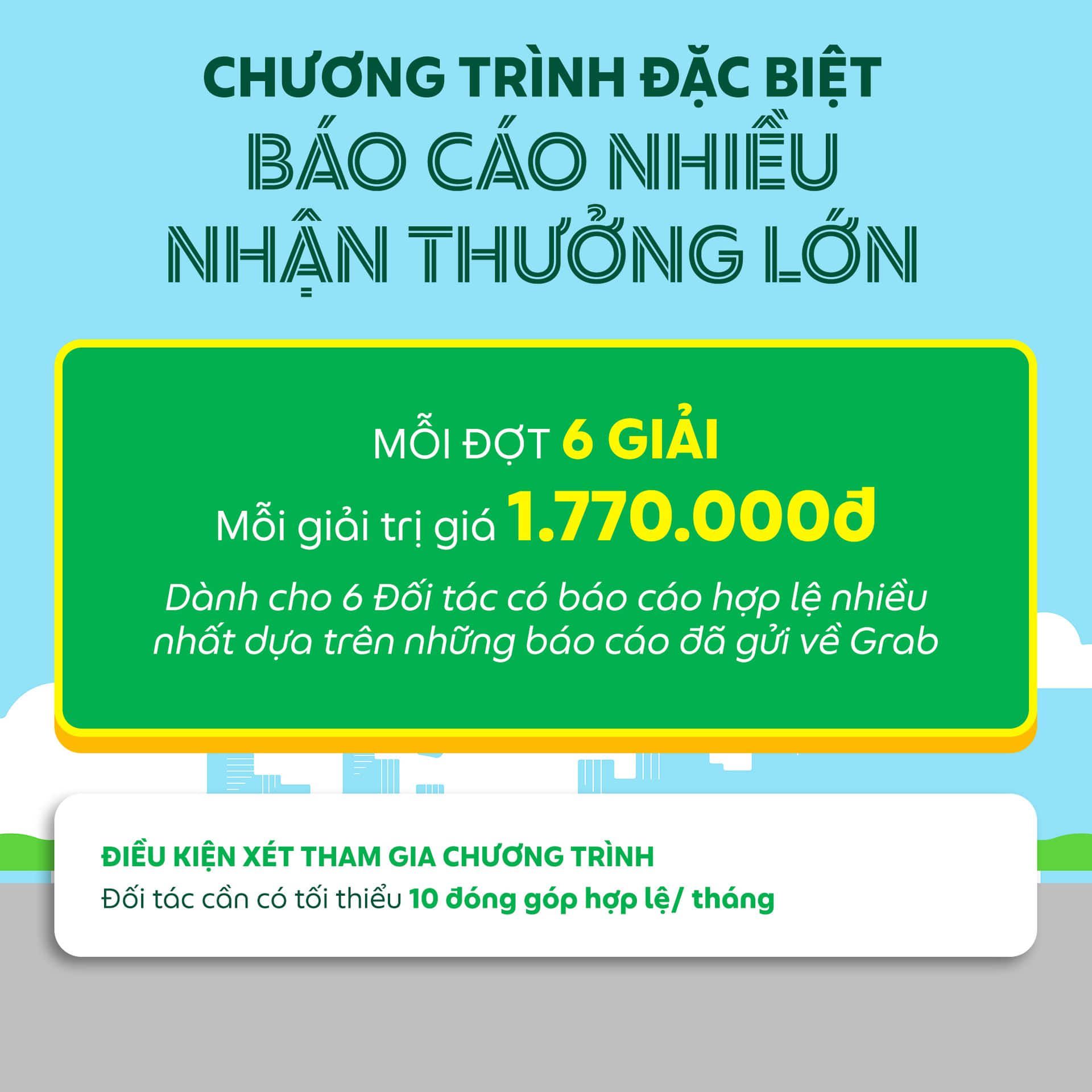 Chương trình “Báo cáo càng nhiều – Nhận thưởng càng lớn” đã được triển khai dành cho Đối tác Grab 2 bánh và 4 bánh trên toàn quốc từ ngày 01/01/2025.