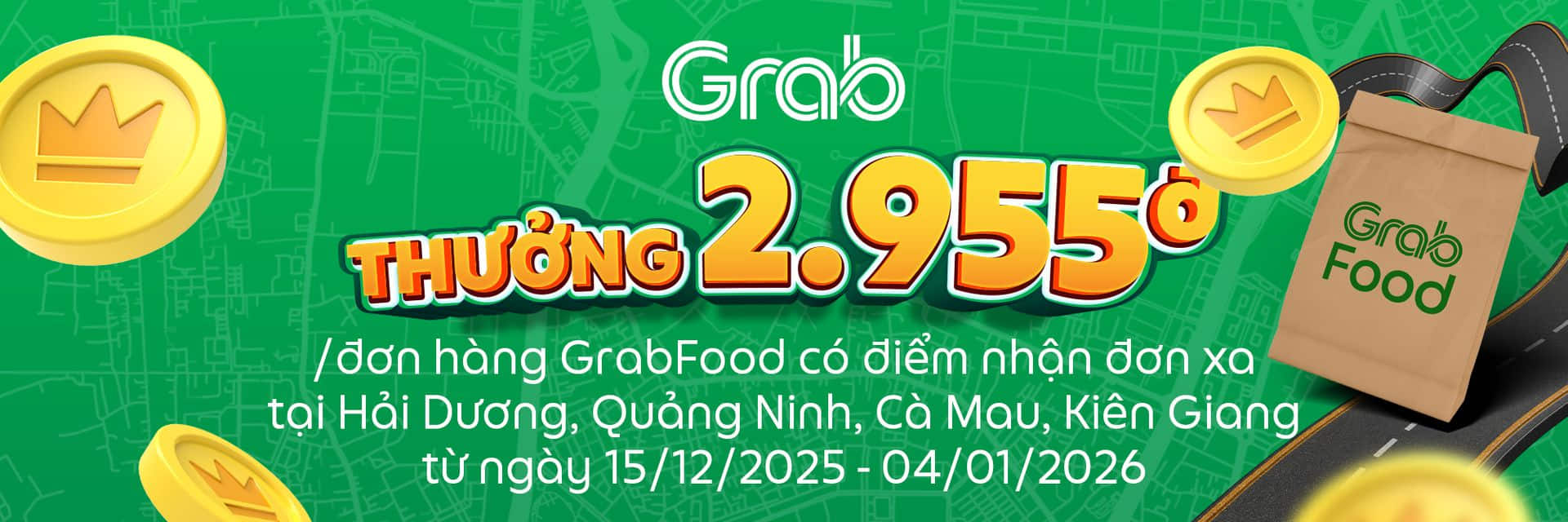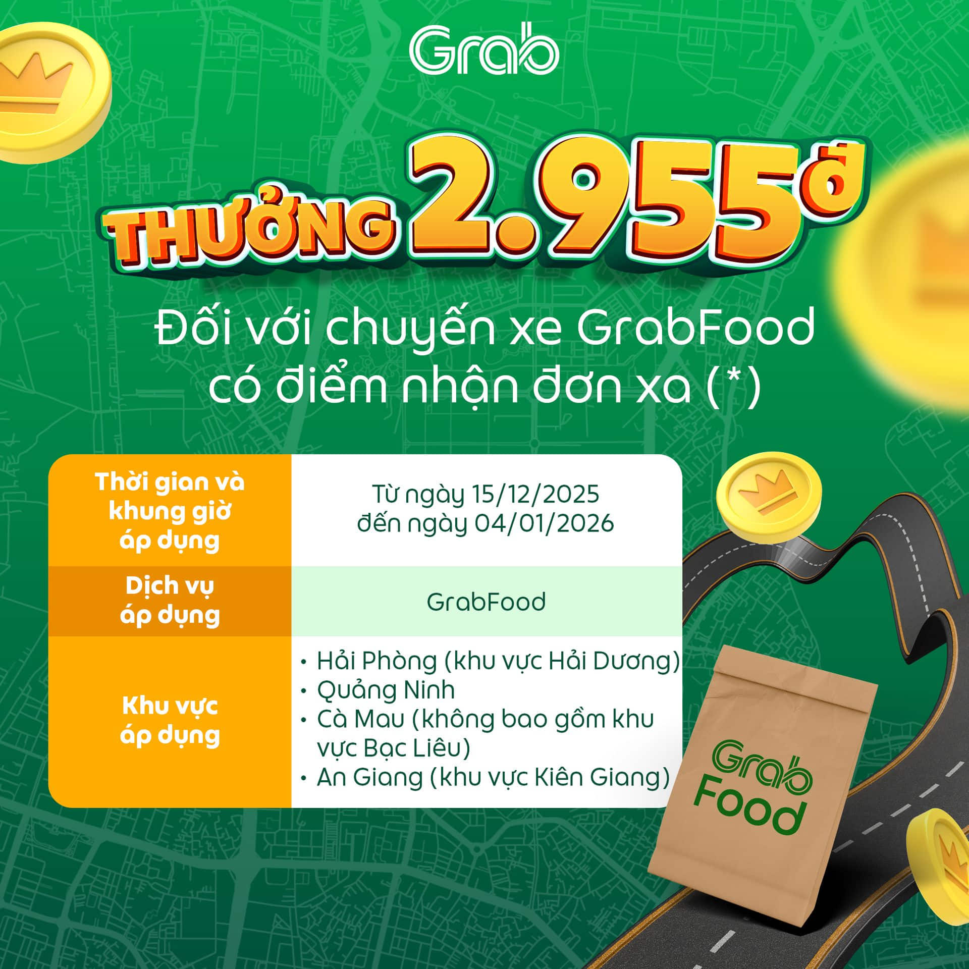 Từ ngày 15/12/2025, Grab triển khai chương trình thưởng nóng dành riêng cho các chuyến GrabFood có điểm nhận đơn xa, giúp Đối tác có thêm động lực và thu nhập khi nhận những cuốc xe đường dài hơn.