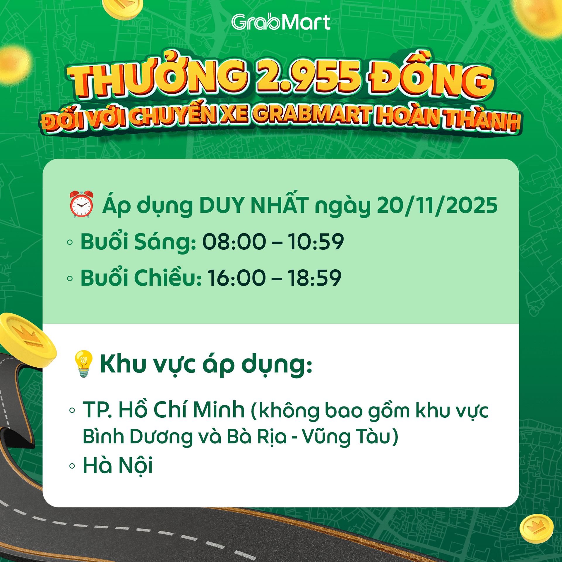 Ngày 20/11, nhu cầu mua sắm GrabMart dự kiến sẽ tăng đột biến! Nhằm hỗ trợ Đối tác tối đa hóa thu nhập trong ngày này, Grab triển khai chương trình thưởng nóng với chi tiết như sau: