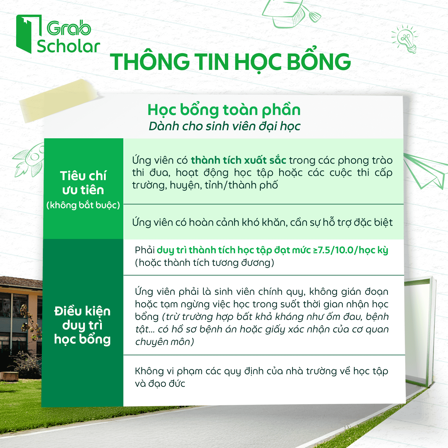 Vì số lượng học bổng được trao tặng có giới hạn, Grab sẽ sàng lọc các ứng viên và chỉ trao tặng học bổng cho các ứng viên đáp ứng đầy đủ các tiêu chí tham gia và các tiêu chí ưu tiên (nếu có).
