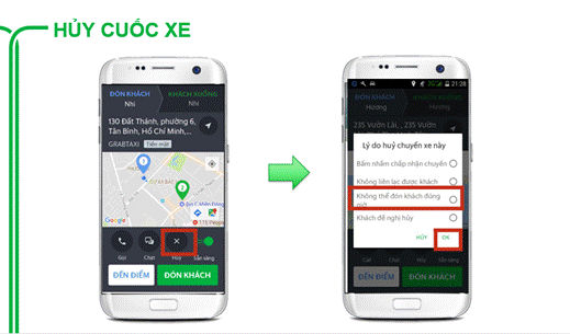 - Lý do xuất phát từ Khách hàng: liên lạc với Khách hàng nhiều lần không được, Khách hàng không có nhu cầu đi nữa, đã nhờ Khách hàng hủy nhưng Khách hàng không biết cách hủy => Đối tác sẽ thao tác huỷ cuốc trên ứng dụng.