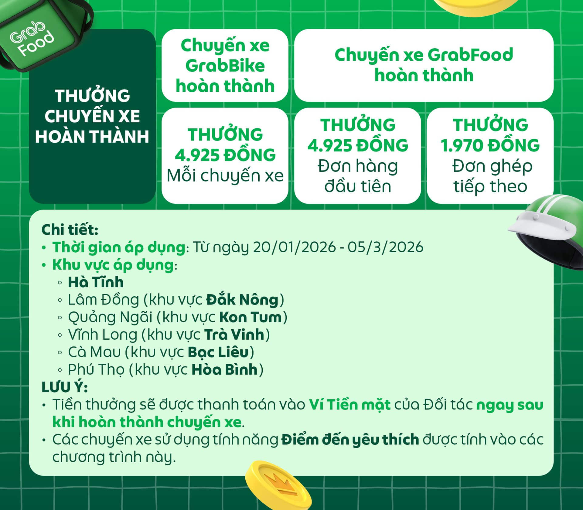 Grab mang đến cơ hội thưởng hấp dẫn cho Đối tác khi hoàn thành chuyến xe Grab 2 bánh với chi tiết như sau: