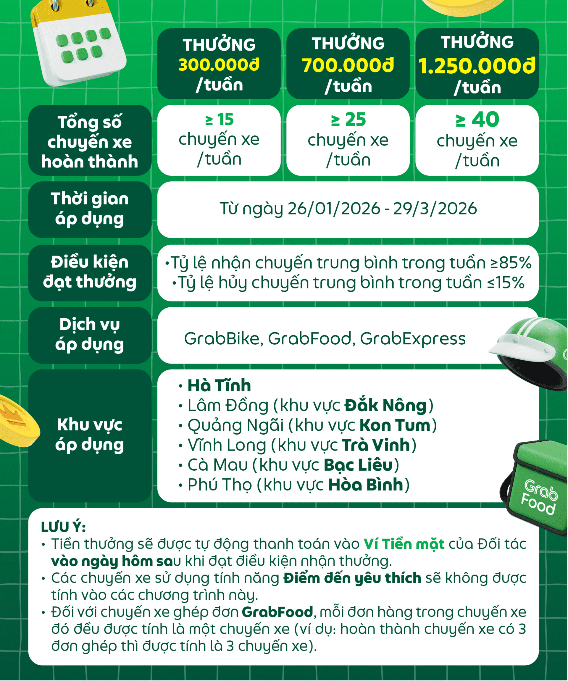 Các điều kiện của chương trình có thể thay đổi và sẽ được thông báo đến Đối tác, Grab có toàn quyền quyết định điều kiện và mức thưởng cuối cùng.