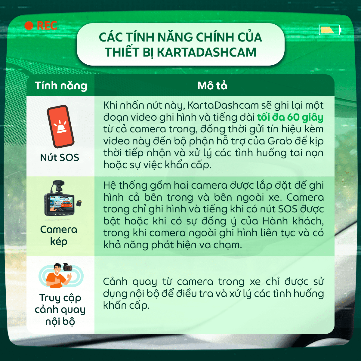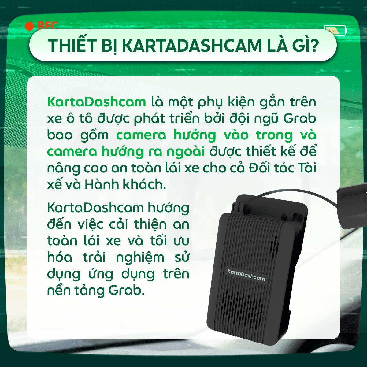 Grab luôn ưu tiên sự an toàn của Đối tác và Hành khách trong mỗi chuyến xe. Để tiếp tục nâng cao hơn nữa trải nghiệm vận hành an toàn, Grab chính thức triển khai chương trình trang bị KartaDashcam – Chuyến xe an toàn, an tâm di chuyển.