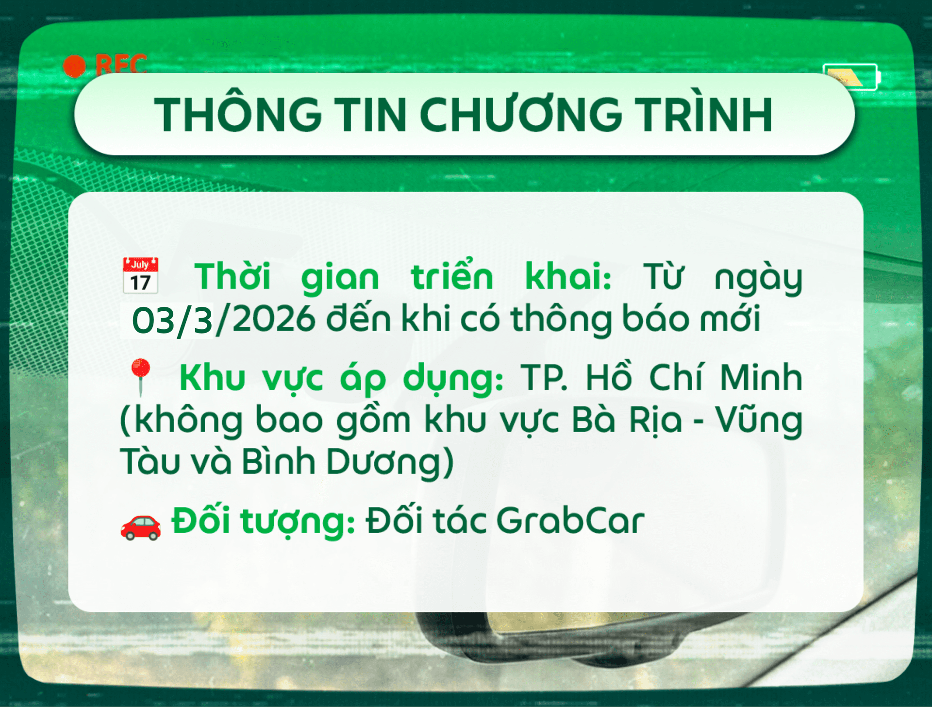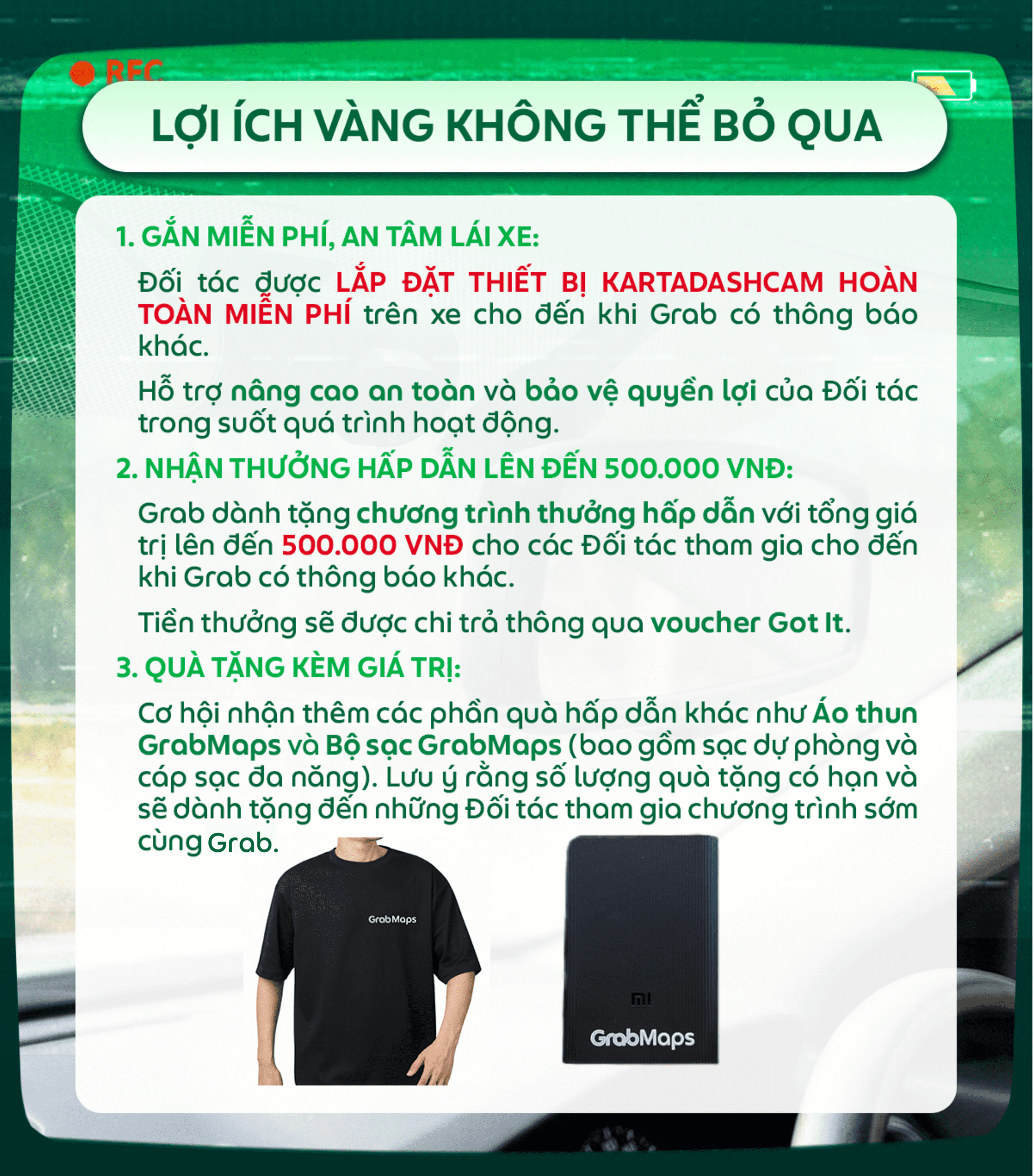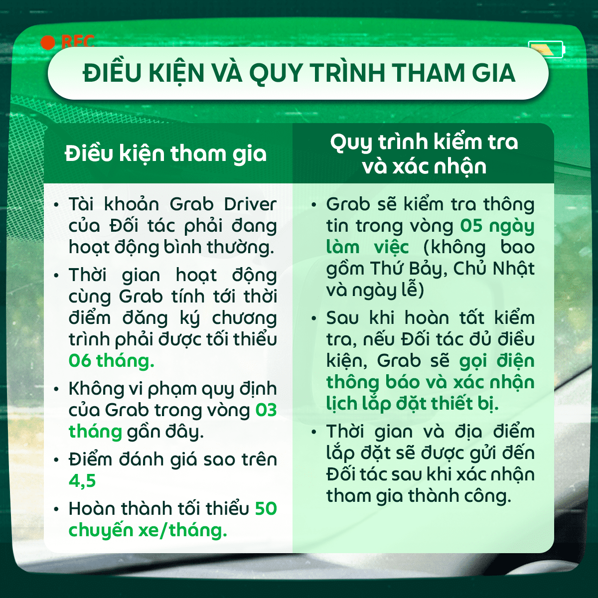 Thông qua chương trình này, Grab sẽ cung cấp cho Đối tác một thiết bị camera thông minh được tối ưu hóa riêng cho môi trường hoạt động trên ứng dụng Grab, giúp tăng cường bảo vệ quyền lợi của Đối tác.