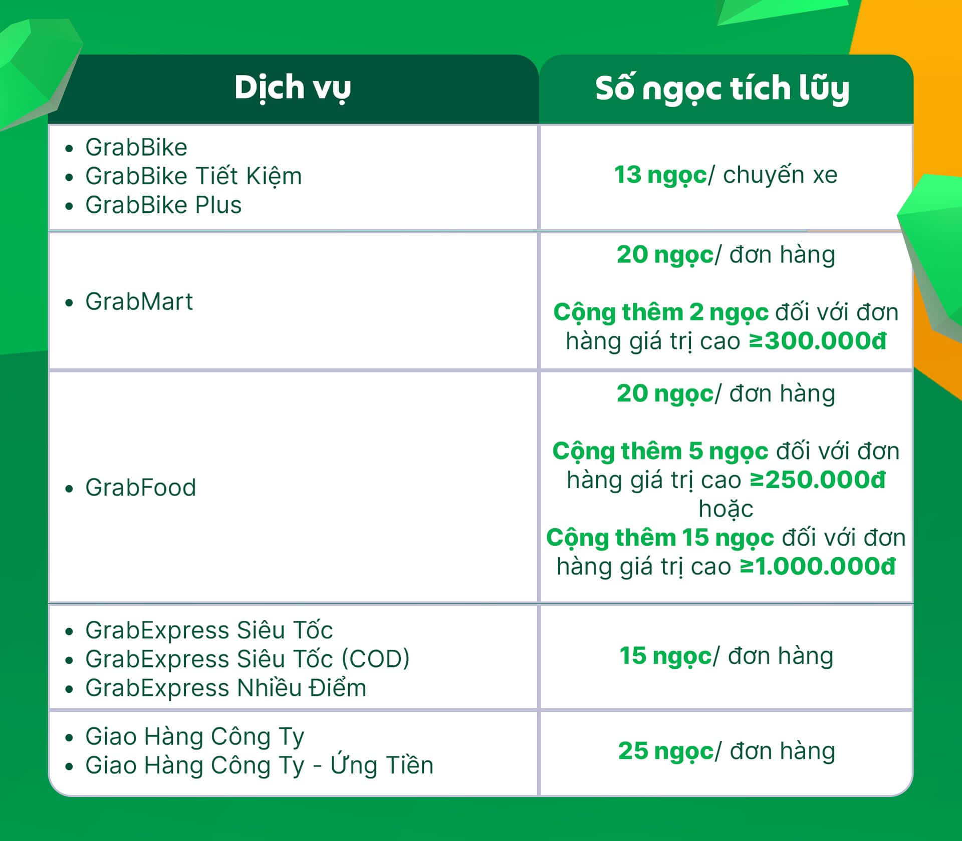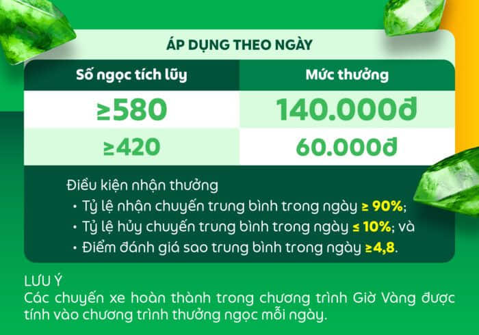 Mỗi chuyến xe hoàn thành sẽ được quy đổi thành số ngọc thưởng tương ứng trên ứng dụng Grab Driver dựa vào bảng bên dưới: