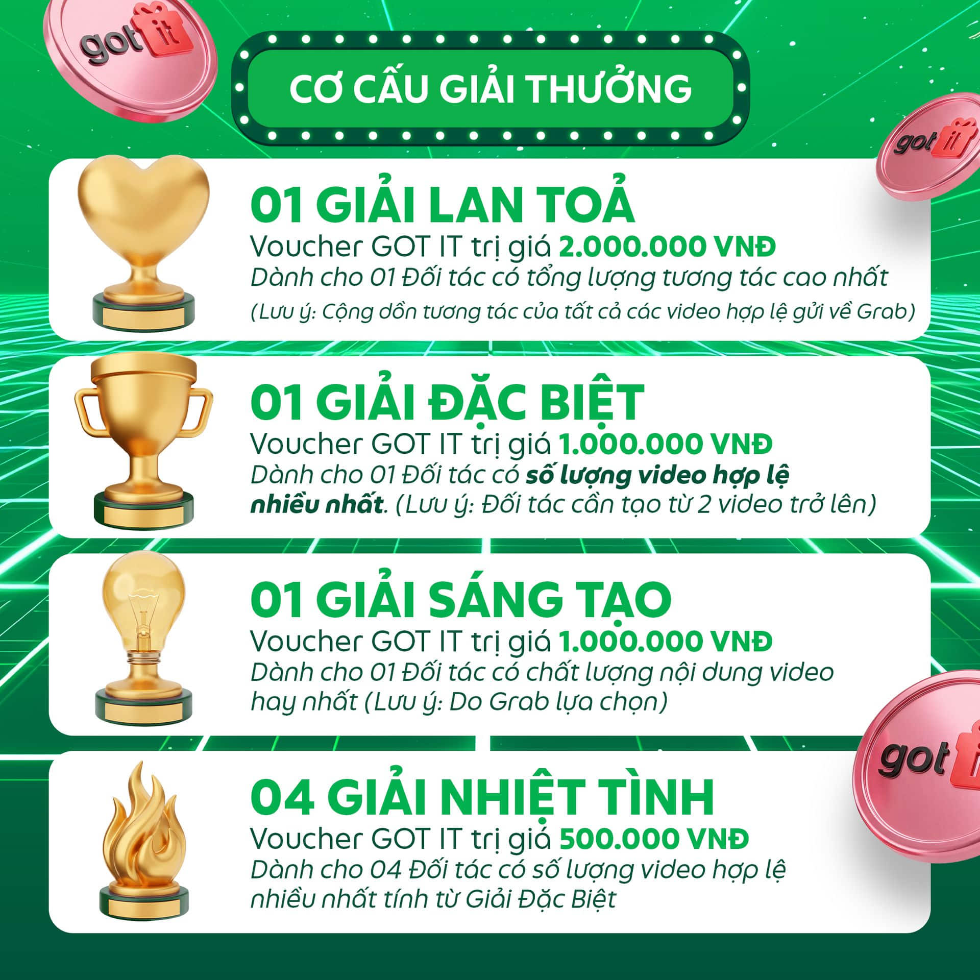 - Giải thưởng được gửi đến Đối tác như sau: Voucher Got It mà Đối tác nhận được sẽ được qua mục tin nhắn trên ứng dụng Grab Driver. Đối tác vui lòng sử dụng giải thưởng trong vòng 30 ngày kể từ ngày Grab gửi tin nhắn đến cho Đối tác. Nếu sau 30 ngày Đối tác chưa sử dụng voucher, Grab sẽ thu hồi giải thưởng để sử dụng cho các mục đích khác