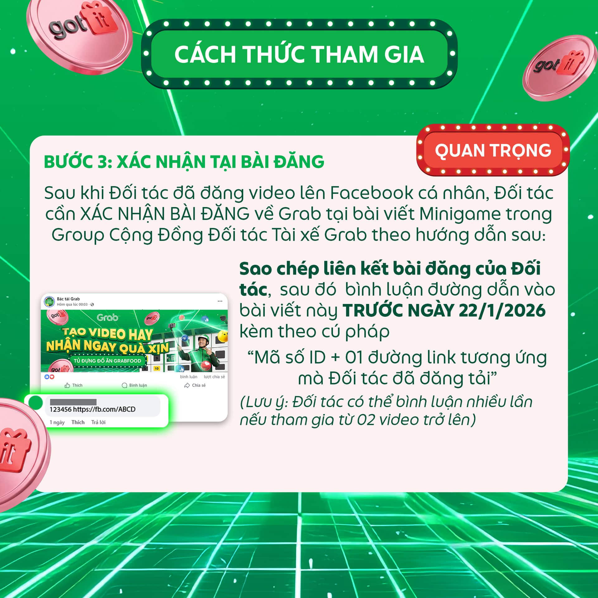 - Cú pháp điểm danh tại BƯỚC 3 của minigame được coi là không hợp lệ nếu sai hoặc thiếu một trong các yếu tố sau: ID hoạt động, hoặc cụm hashtag bắt buộc “#TuDungDoAnGrabFood”