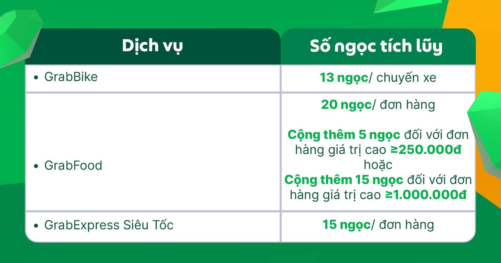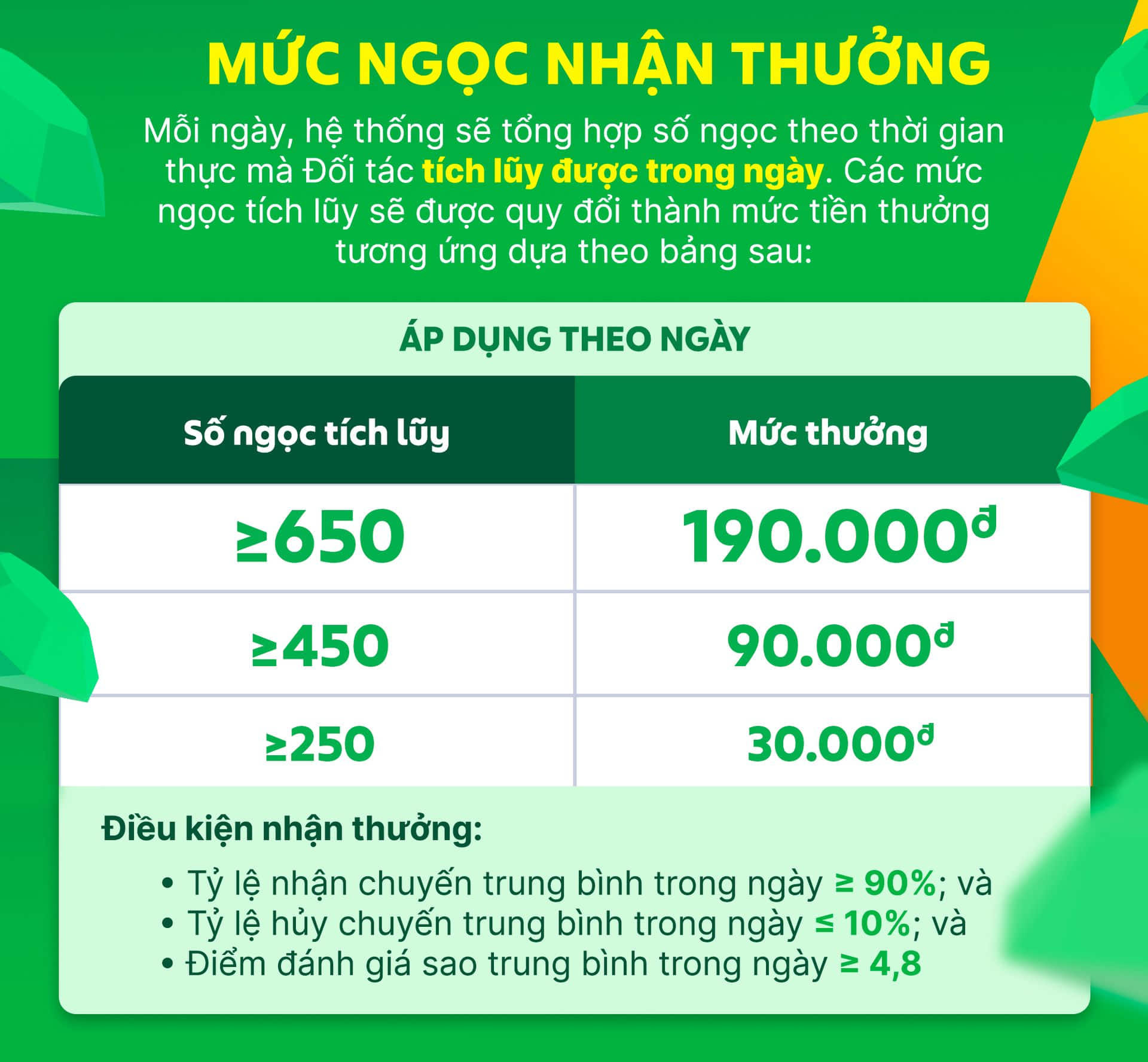 Mỗi chuyến xe hoàn thành sẽ được quy đổi thành số ngọc thưởng tương ứng trên ứng dụng Grab Driver dựa vào bảng bên dưới: