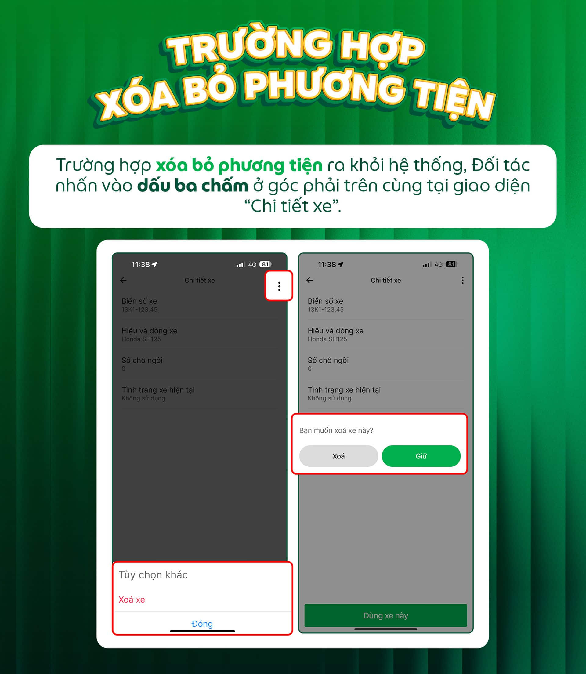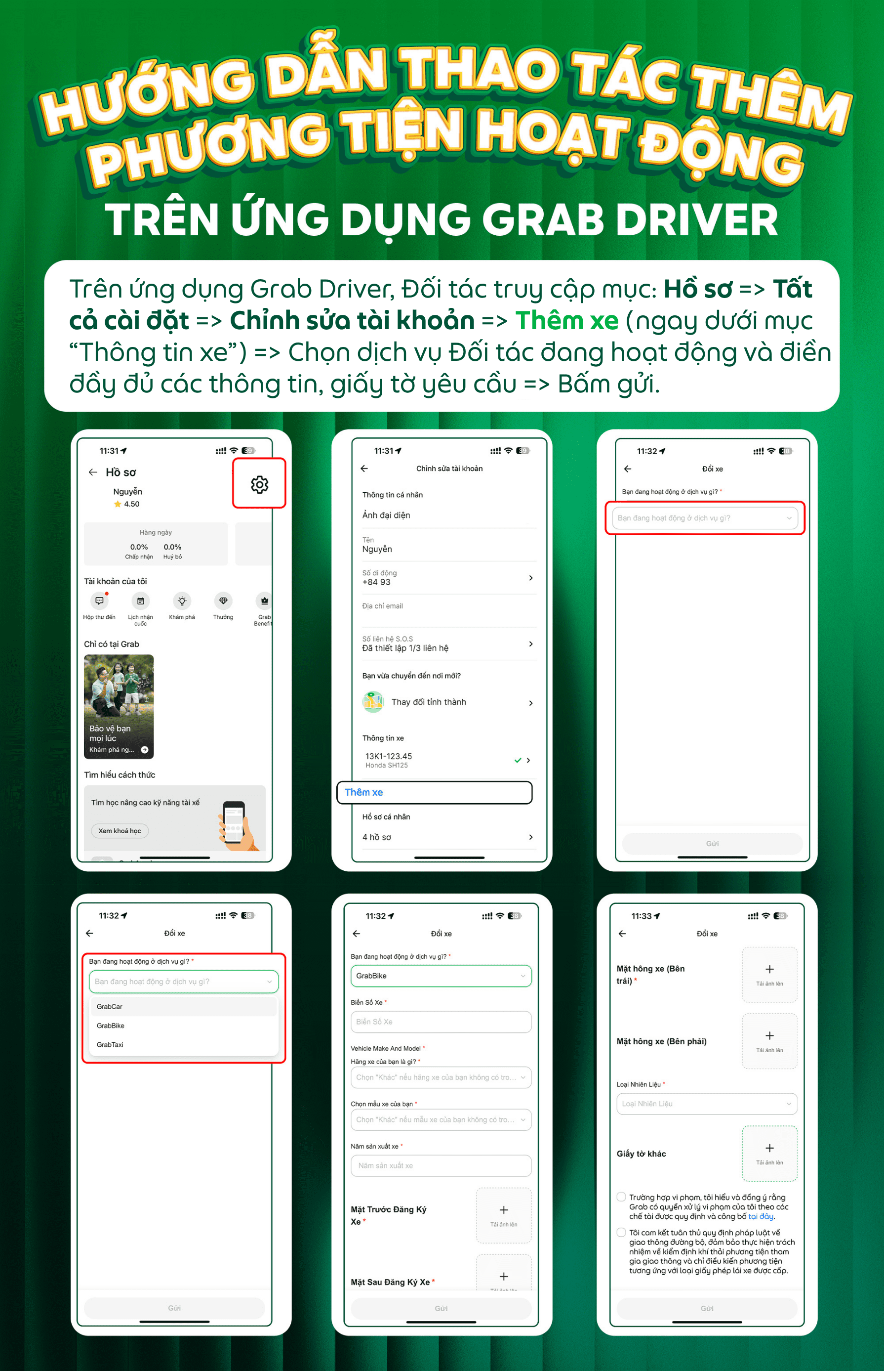 Phương tiện sẽ được Grab kiểm tra và duyệt trước khi Đối tác có thể sử dụng hoạt động.