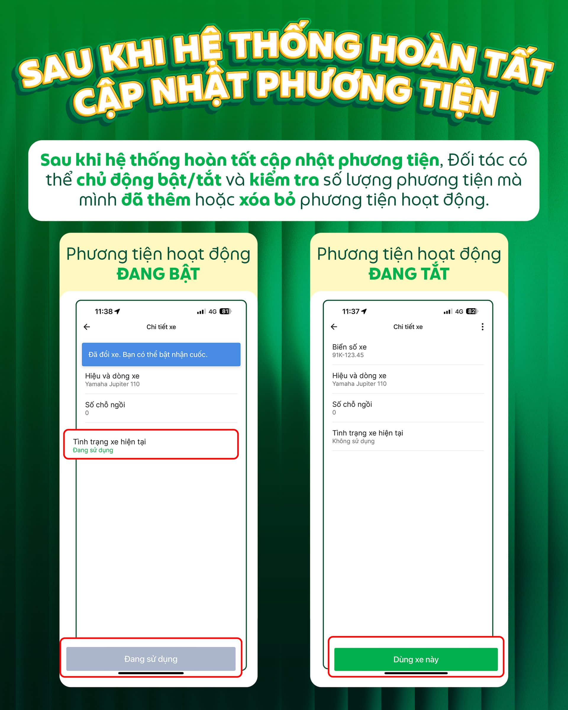 Đối tác bắt buộc hoạt động đúng phương tiện đang được bật trên ứng dụng Grab Driver.