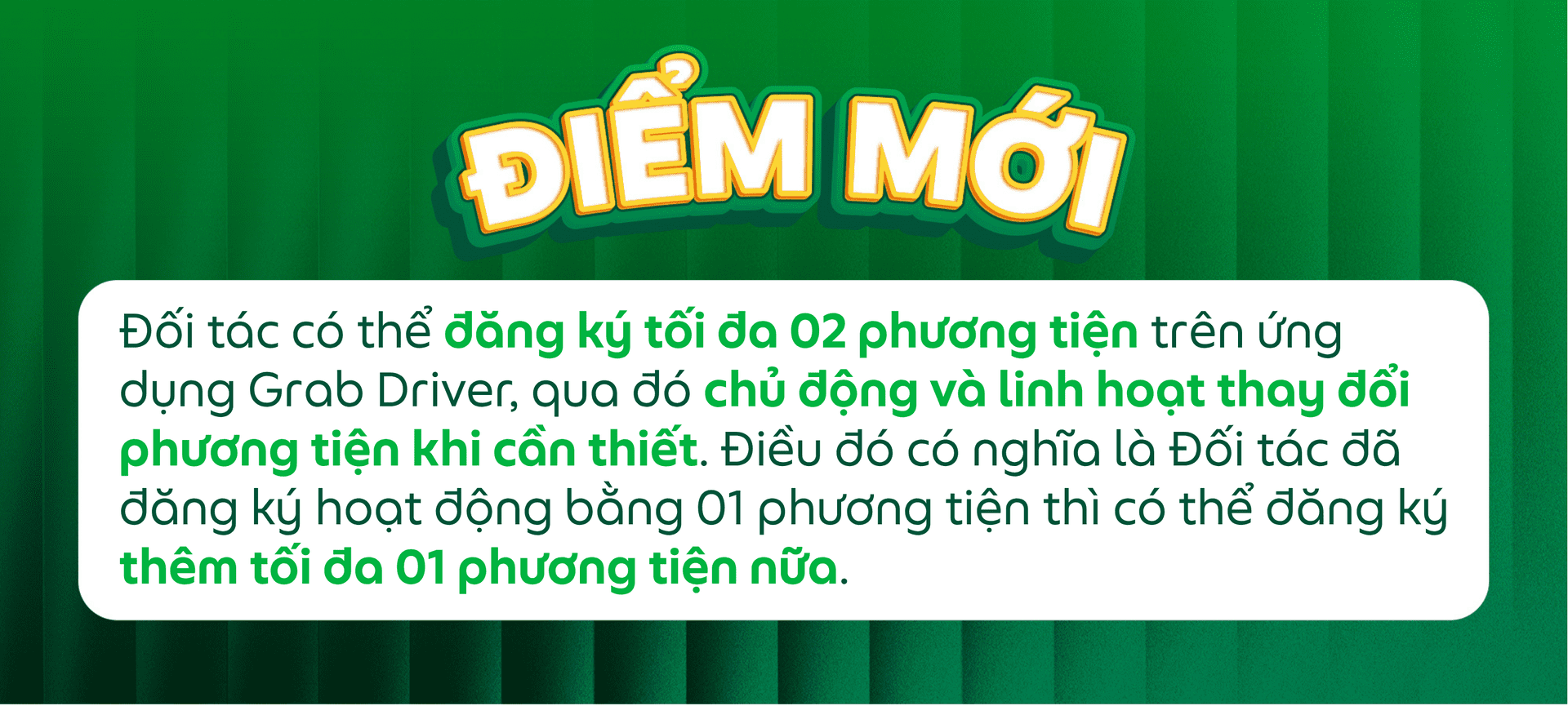 Đối tác có thể đăng ký tối đa 02 phương hiện hoạt động trên ứng dụng. Tuy nhiên, Đối tác cần duy trì ít nhất 01 phương tiện đang hoạt động để đảm bảo tài khoản có thể tiếp tục nhận và hoàn thành chuyến xe theo quy định của Grab.