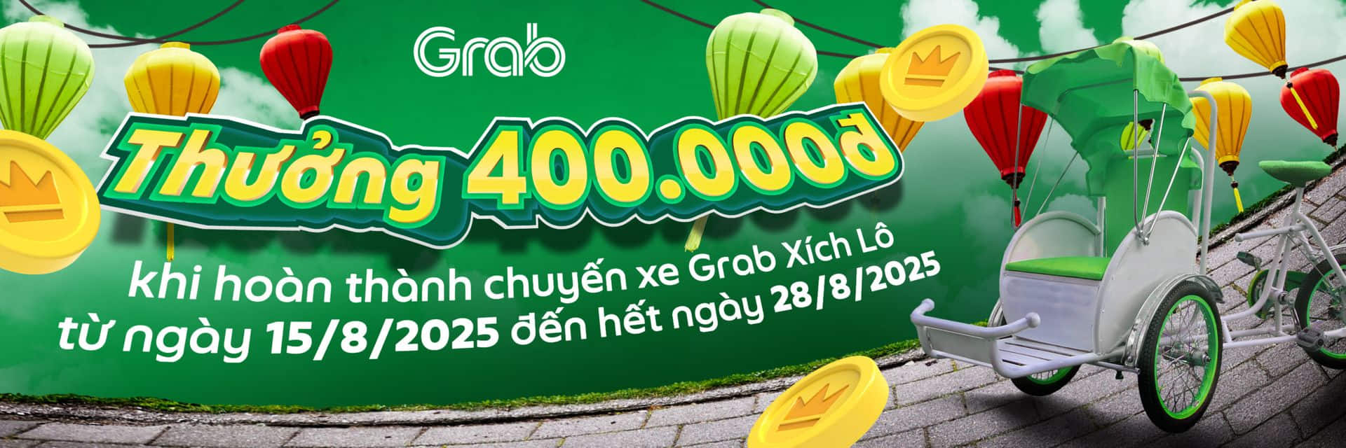 Thưởng 400.000đ khi hoàn thành chuyến xe Grab Xích Lô từ ngày 15/8/2025 đến hết ngày 28/8/2025