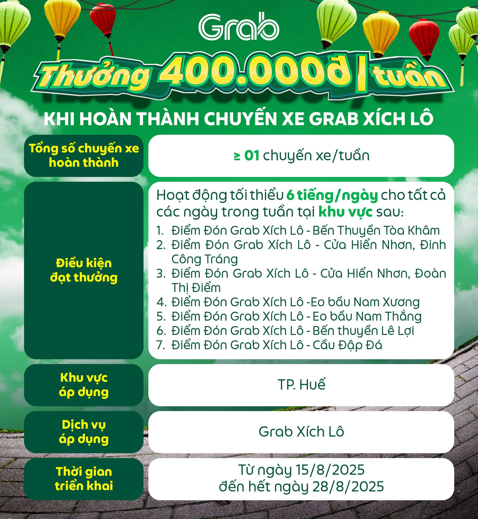 Với mong muốn tạo thêm cơ hội gia tăng thu nhập cho Đối tác khi hoạt động dịch vụ Grab Xích Lô, từ ngày 15/8/2025 đến hết ngày 28/8/2025, Grab thông báo triển khai chương trình thưởng 400.000đ. Chi tiết như sau: